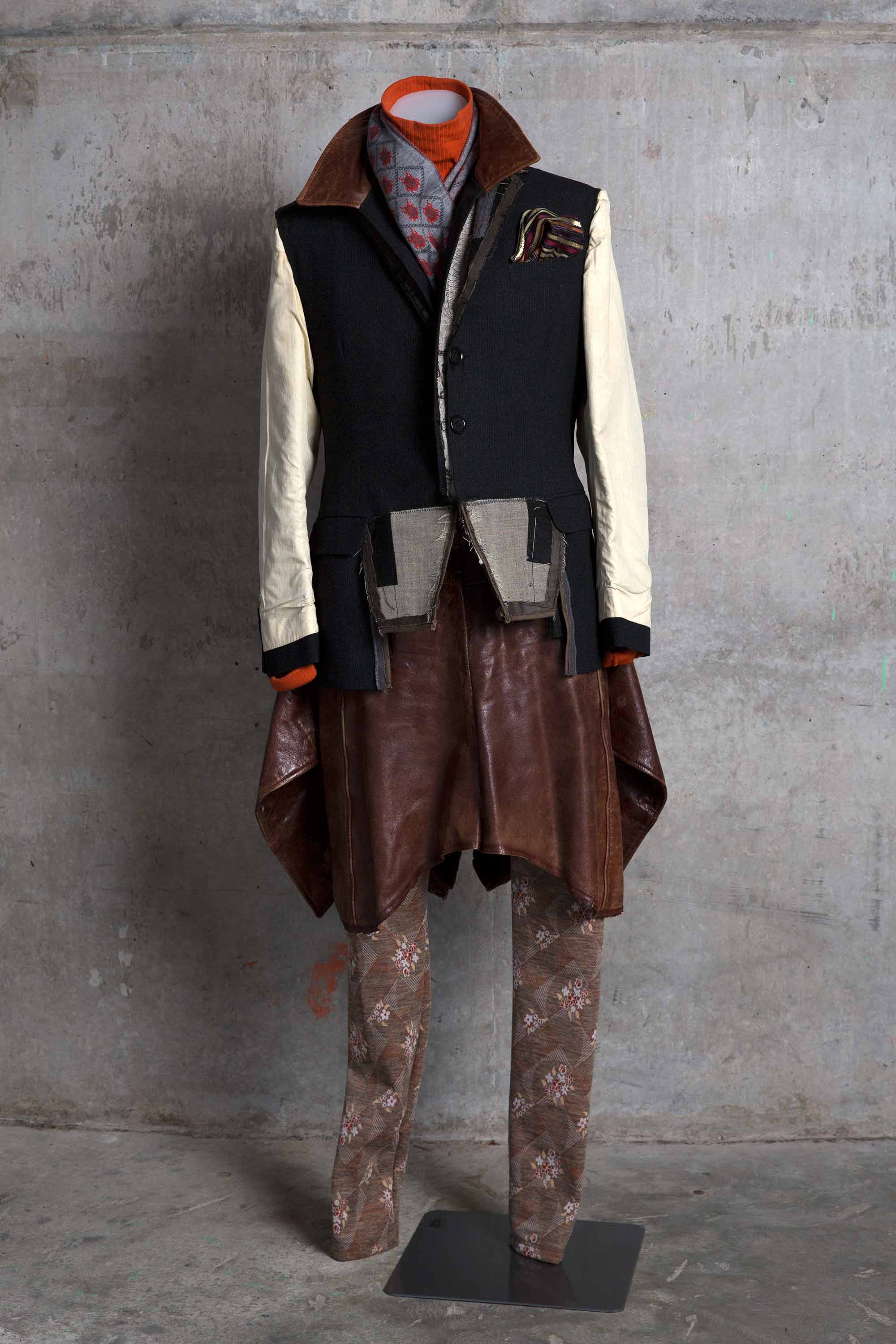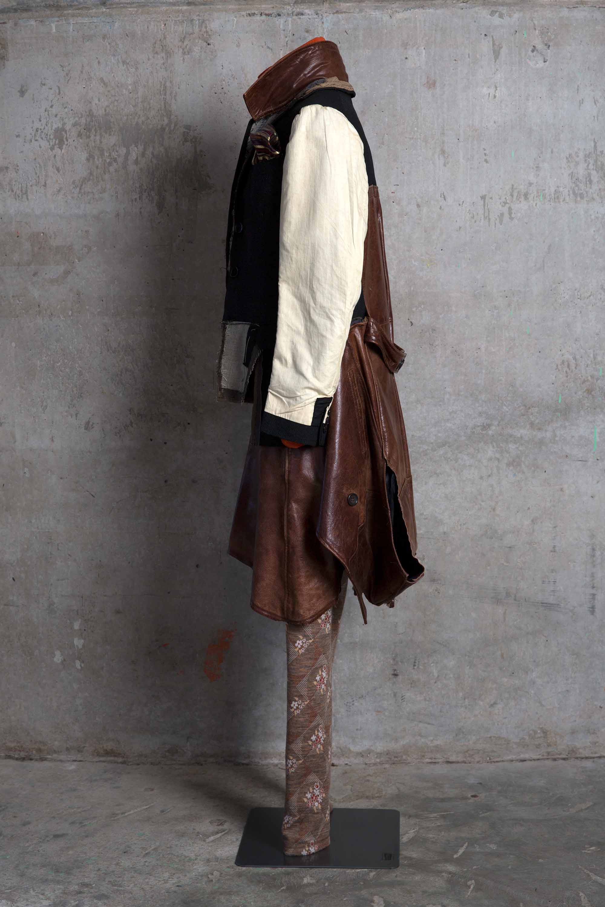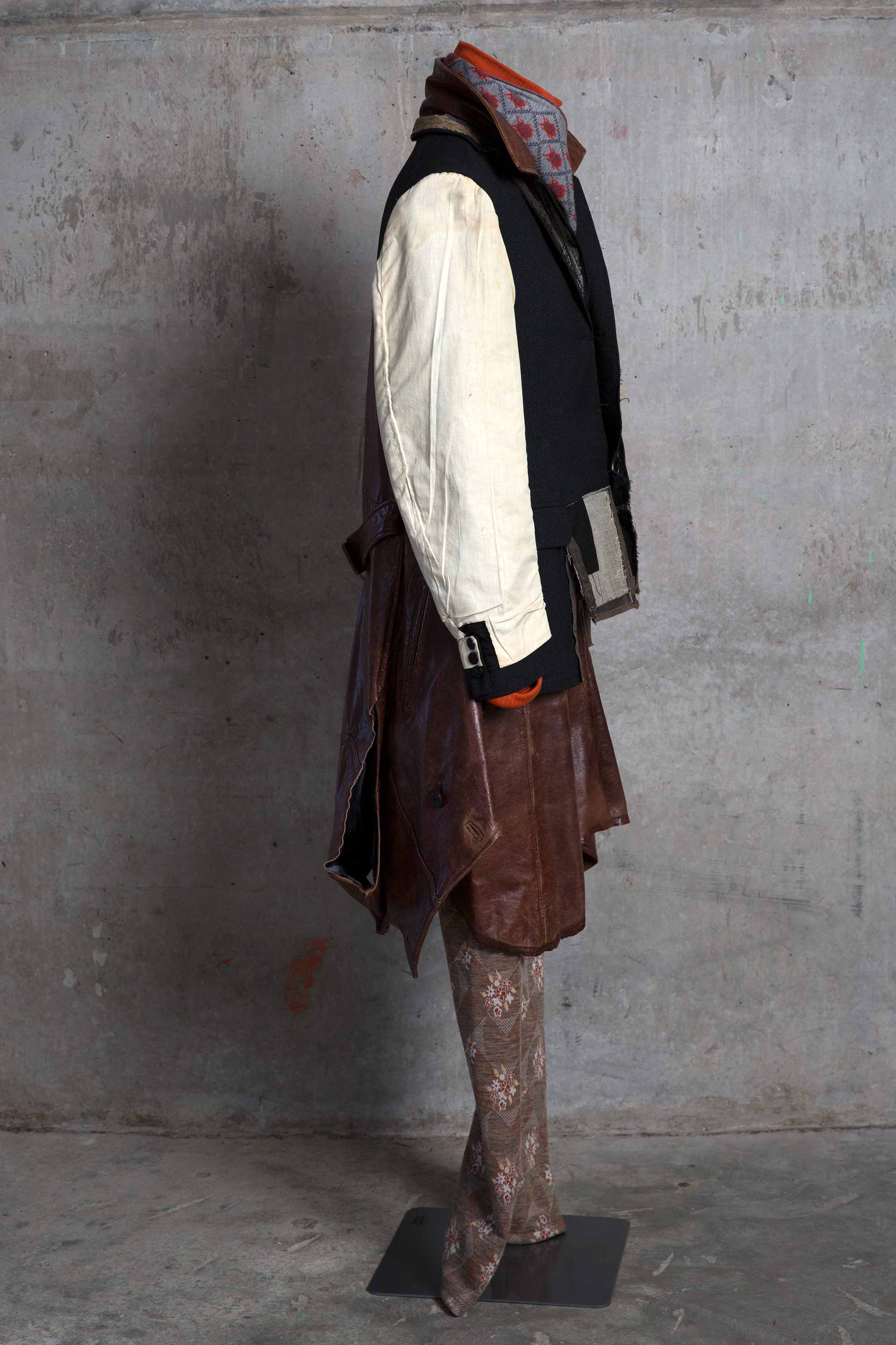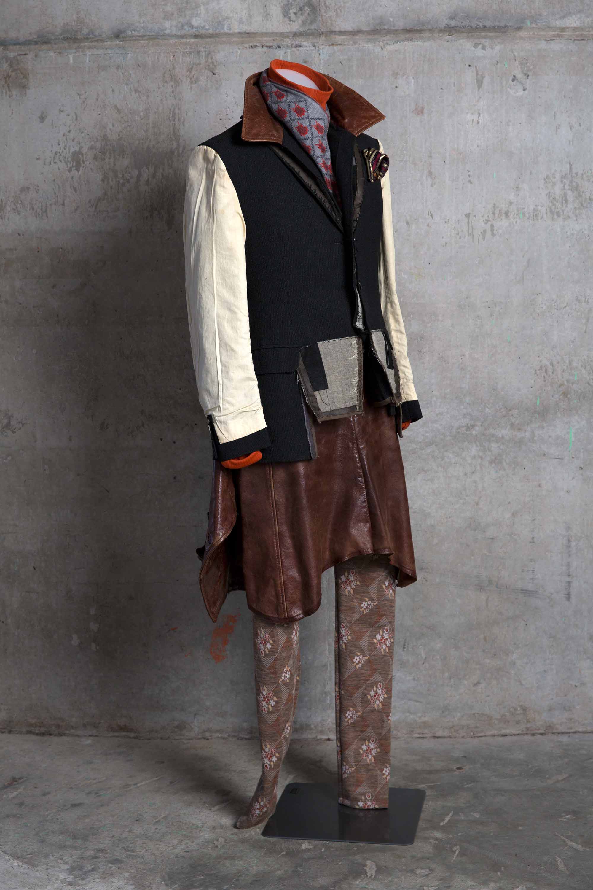 This ensemble was part of Justine Tindley's Otago Polytechnic graduate collection, Metamorphosis, in 2013. It is inspired by the Franz Kafka novella, The Metamorphosis, where the central character wakes to find himself transformed in a beetle. Justine designed this ensemble using two second-hand garments – a 1950s working men's suit and a brown leather jacket from the 1980s. The sleeves of the leather jacket were deconstructed to become the skirt. The suit jacket was turned inside out to highlight the original lining and internal stitches. Justine also designed a knitwear range, which featured bugs. Justine designs her garments under the label, Flatlander. "They carry round with them a presence of the person who used to wear them. In this collection i wanted to highlight those stories, sleeves of the jacket are inside out showing stains and creases."