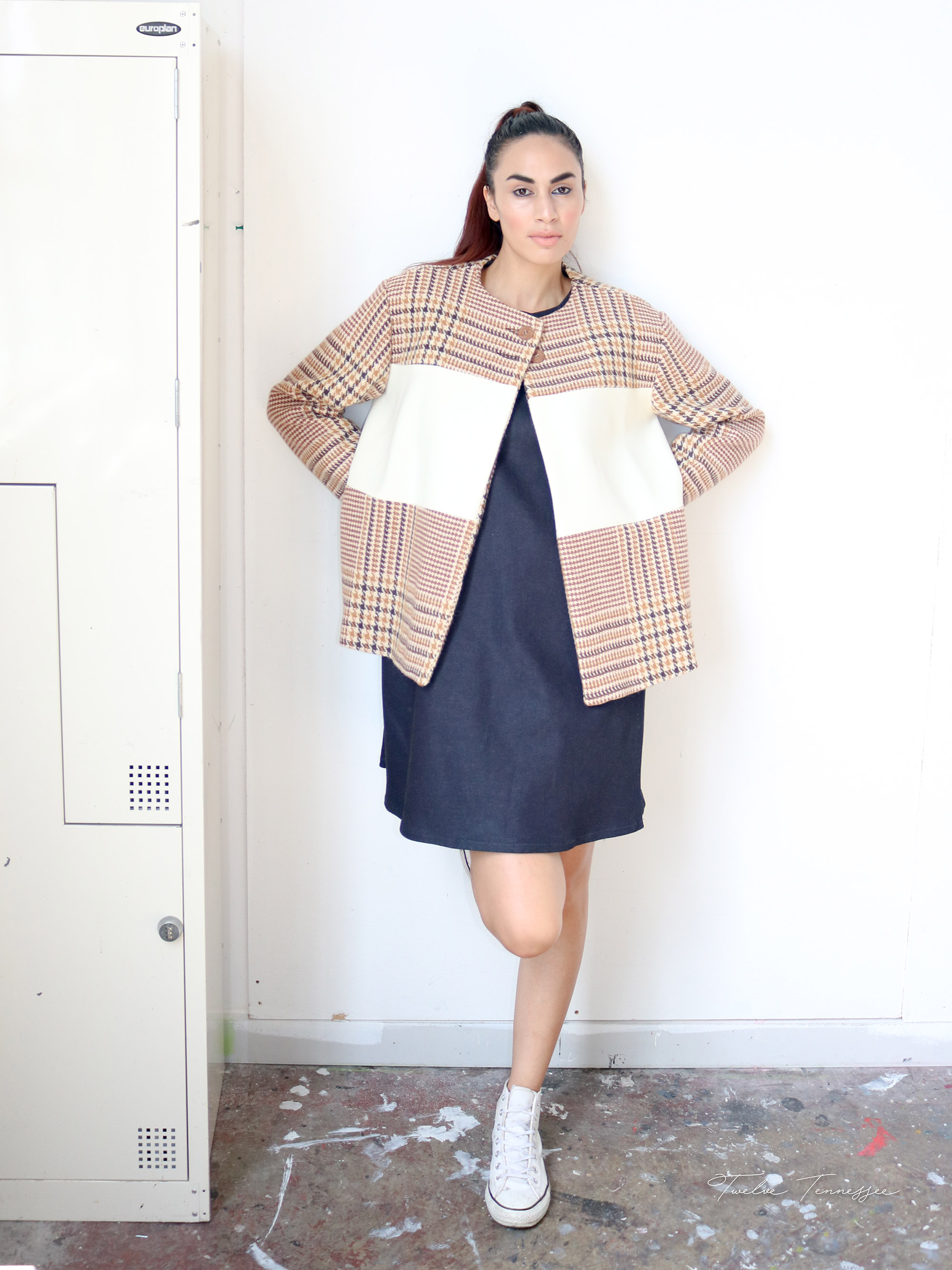 This two-tone swing coat is collarless and is appliquéd with denim letters.