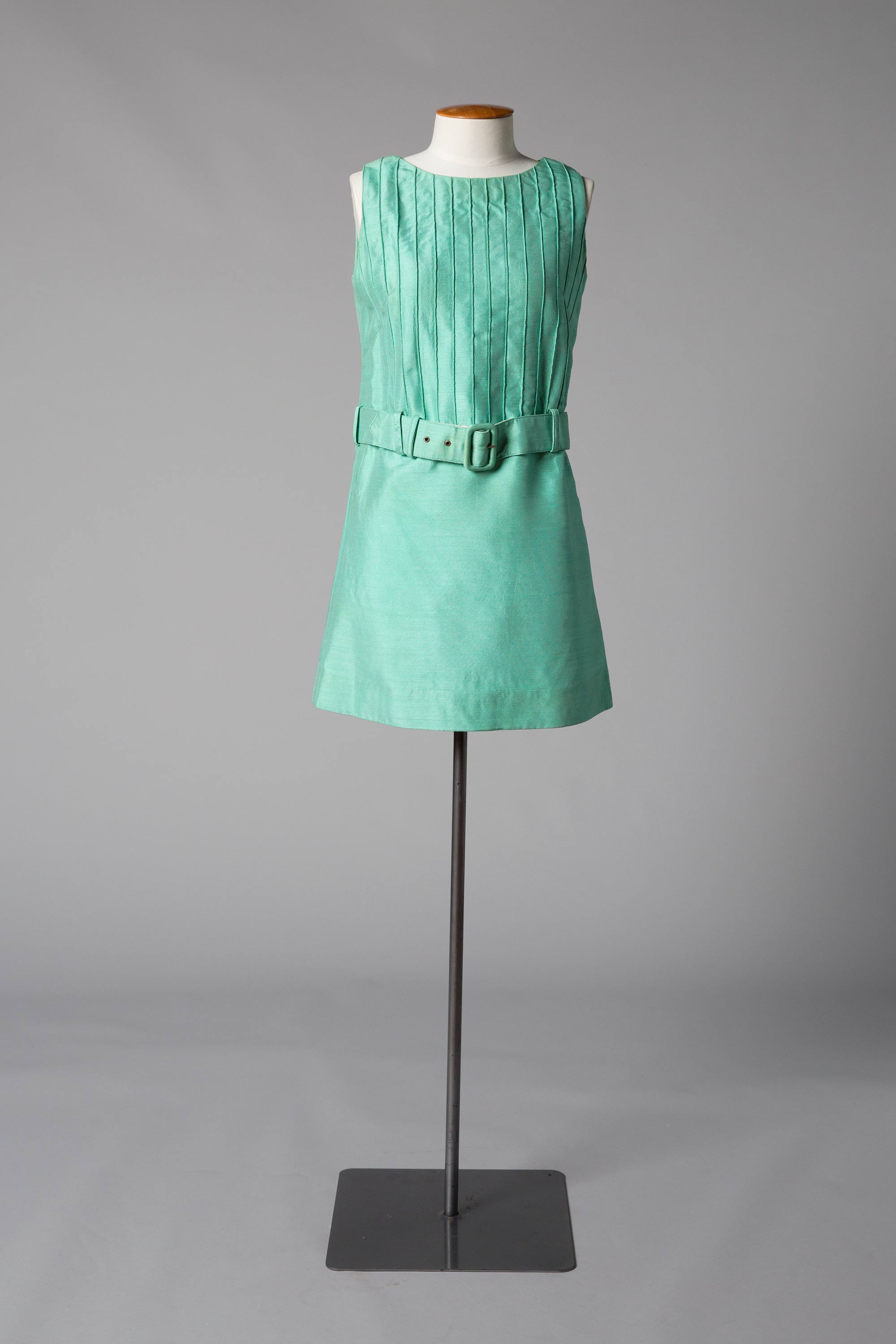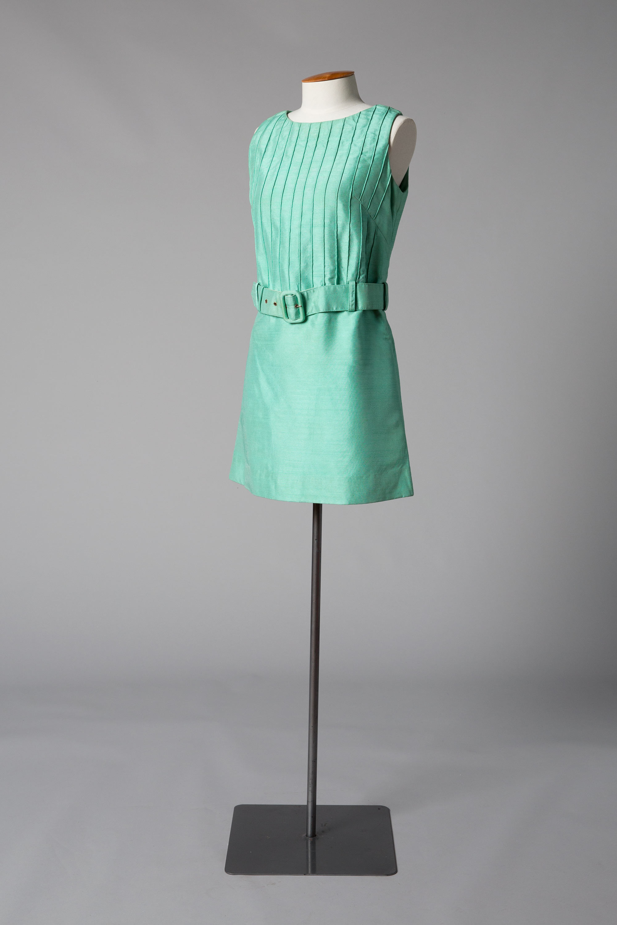 The dress has a dropped waist and self-covered belt and buckle.