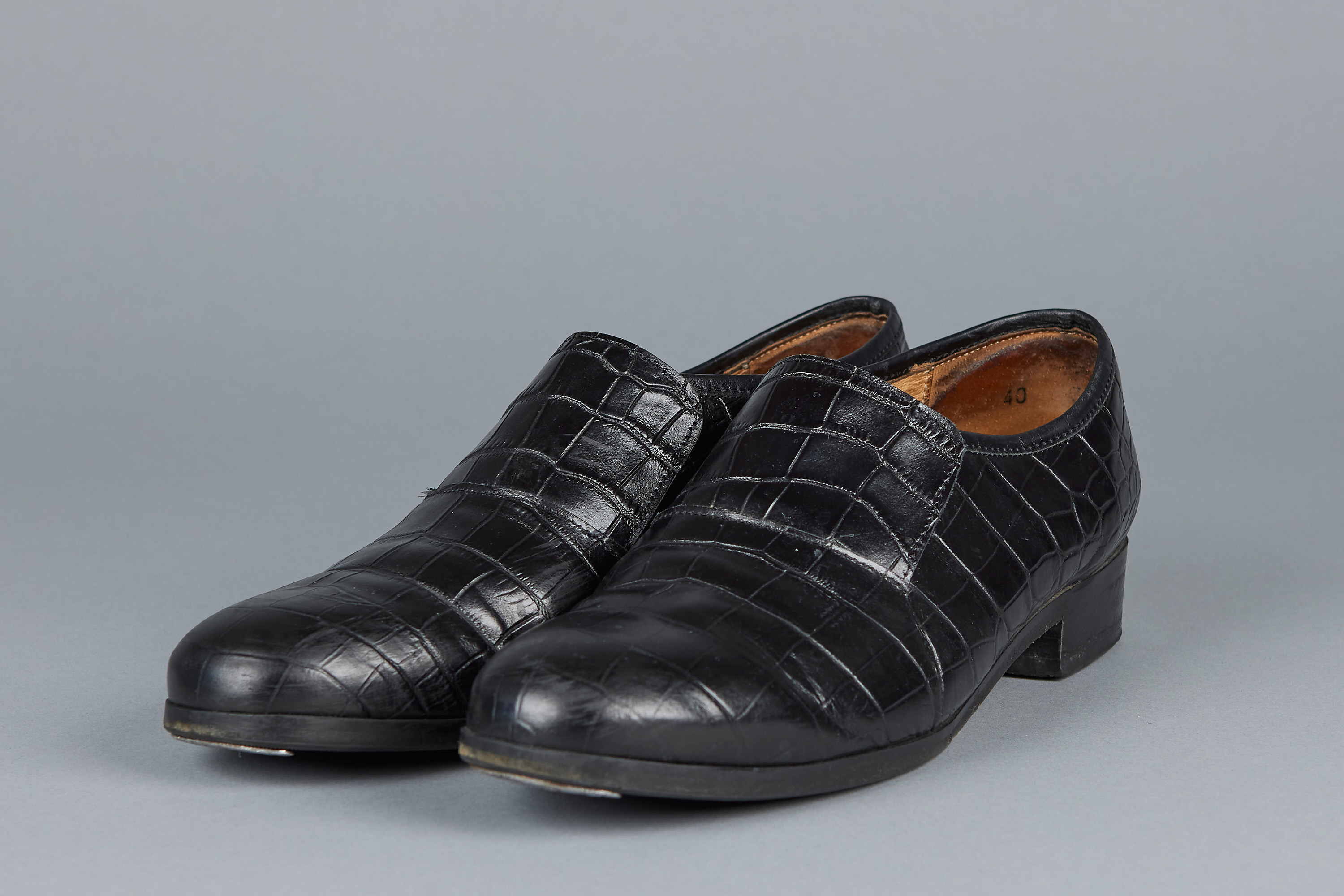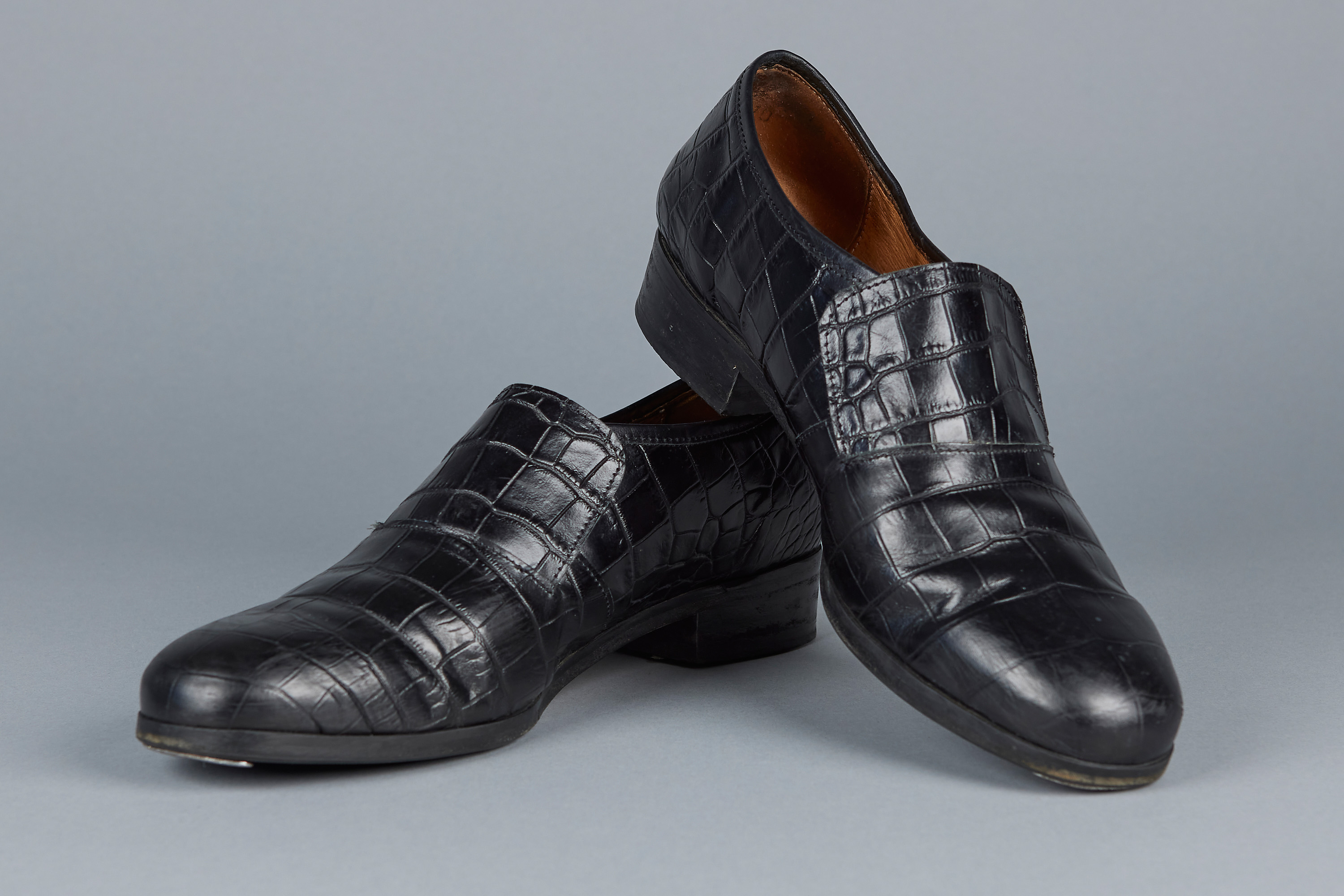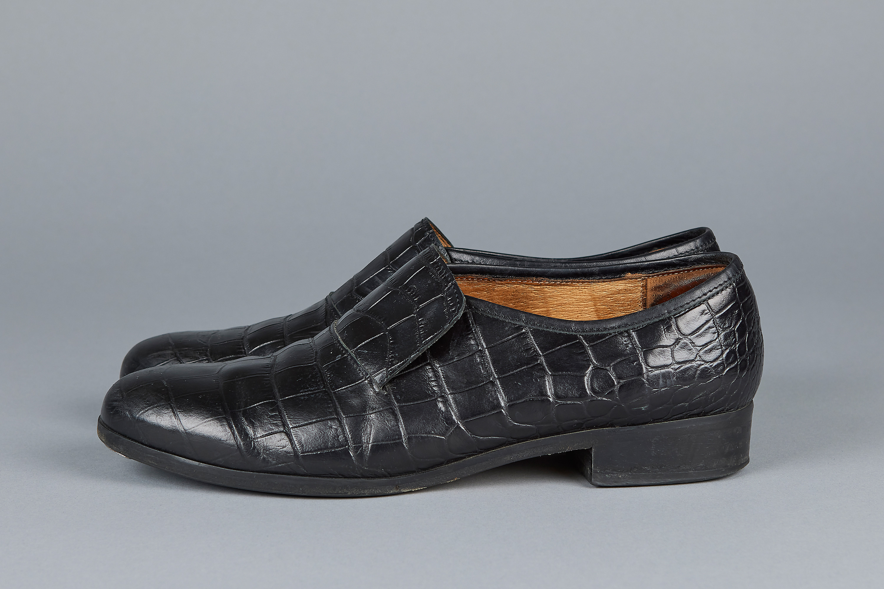 These black loafer style shoes made of imitation crocodile printed leather hail from a later period in Minnie Cooper's career, as noted by the embossed, modernised logo present on the interior of the shoe, a change from her fabric labels present in earlier years. They feature all leather construction, a mark of quality that Cooper's shoes came to be known for.