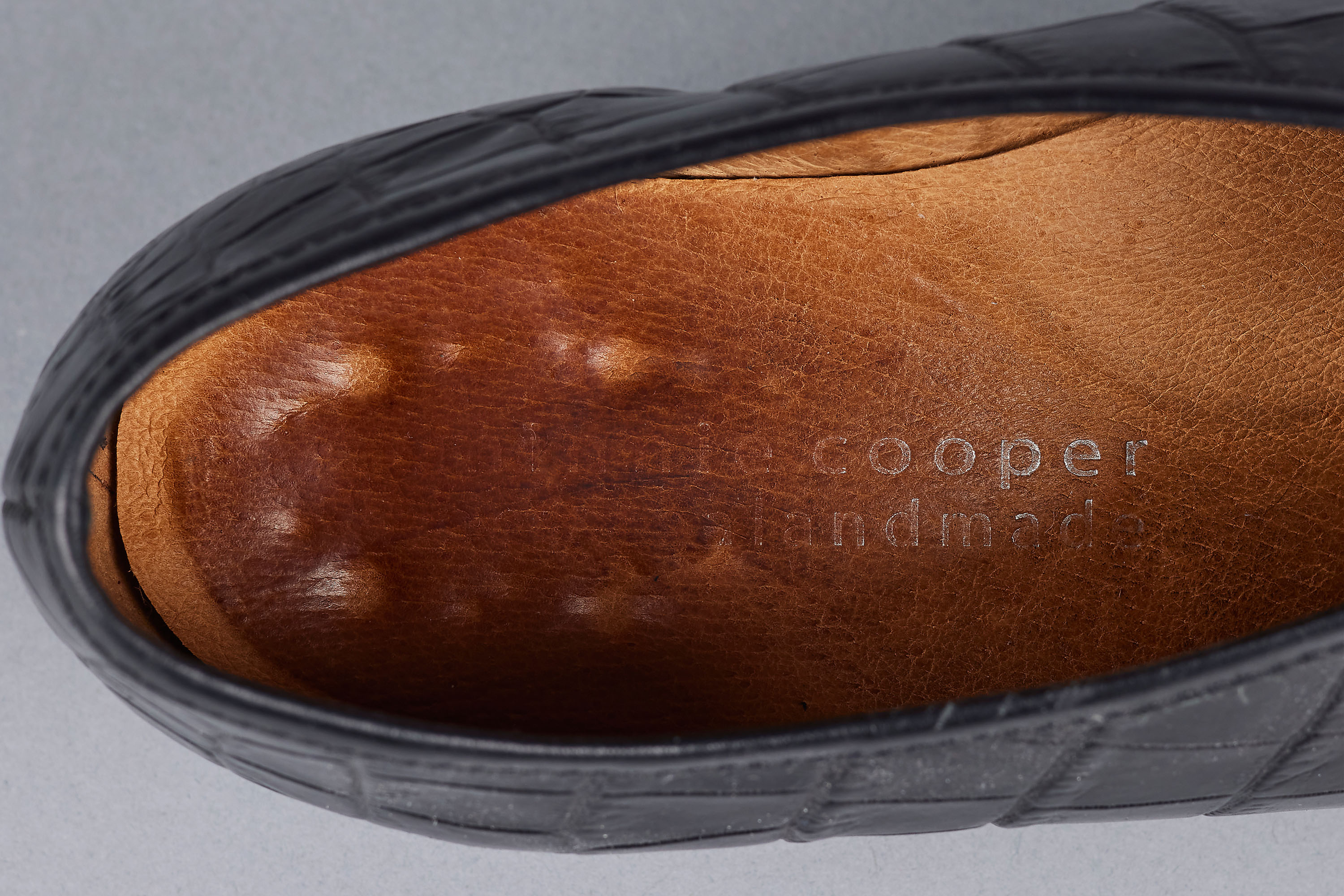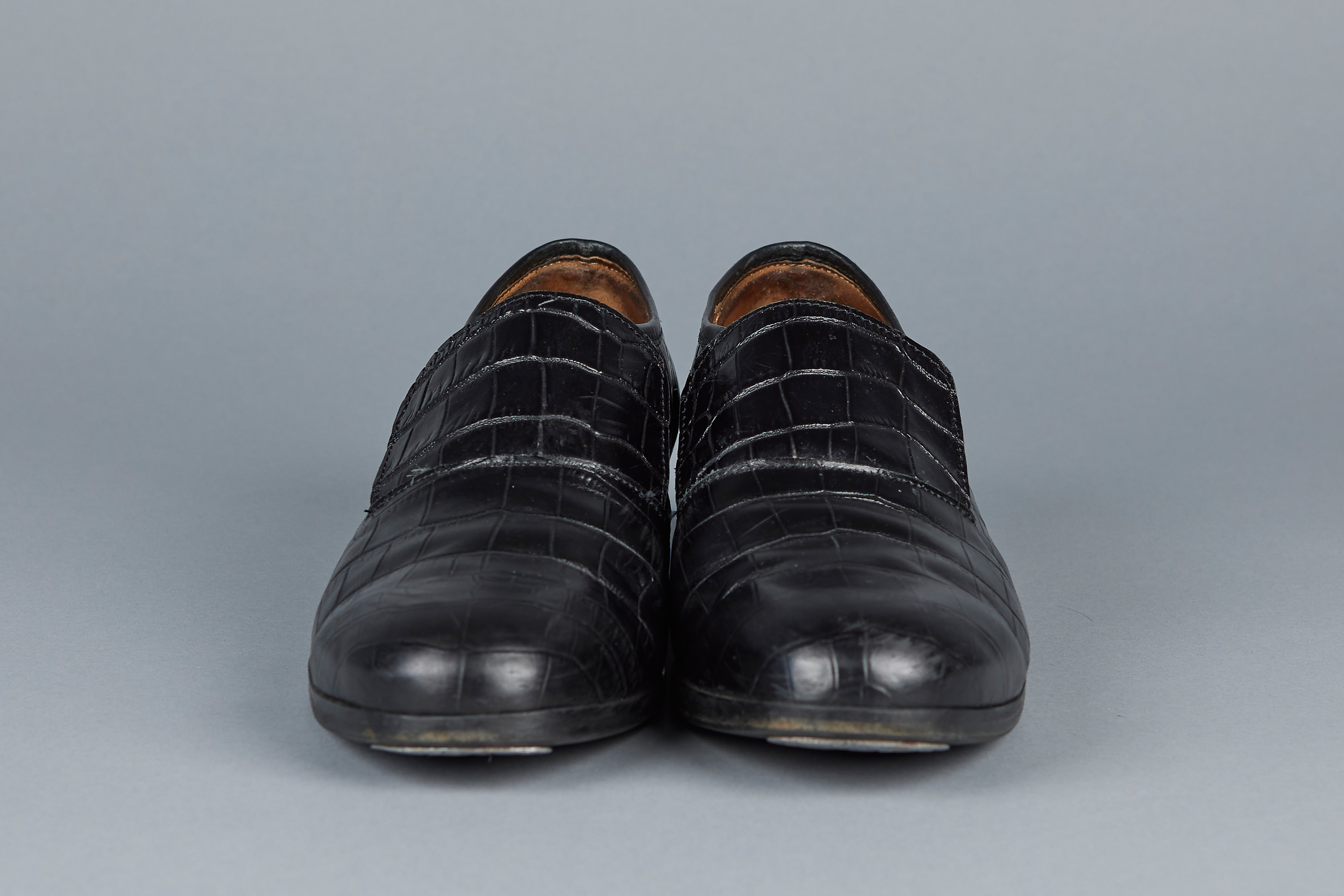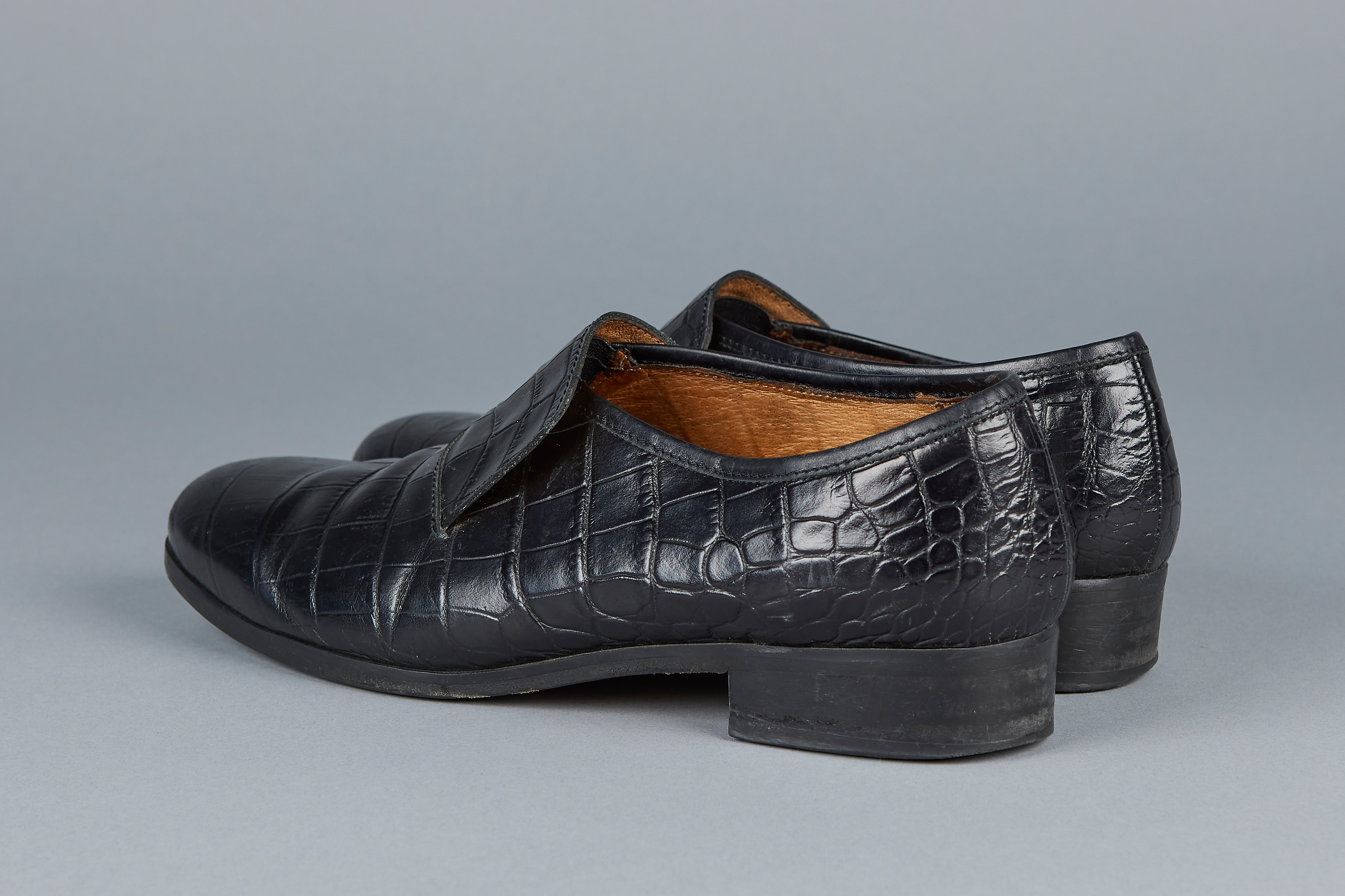 These black loafer style shoes made of imitation crocodile printed leather hail from a later period in Minnie Cooper's career, as noted by the embossed, modernised logo present on the interior of the shoe, a change from her fabric labels present in earlier years. They feature all leather construction, a mark of quality that Cooper's shoes came to be known for.
