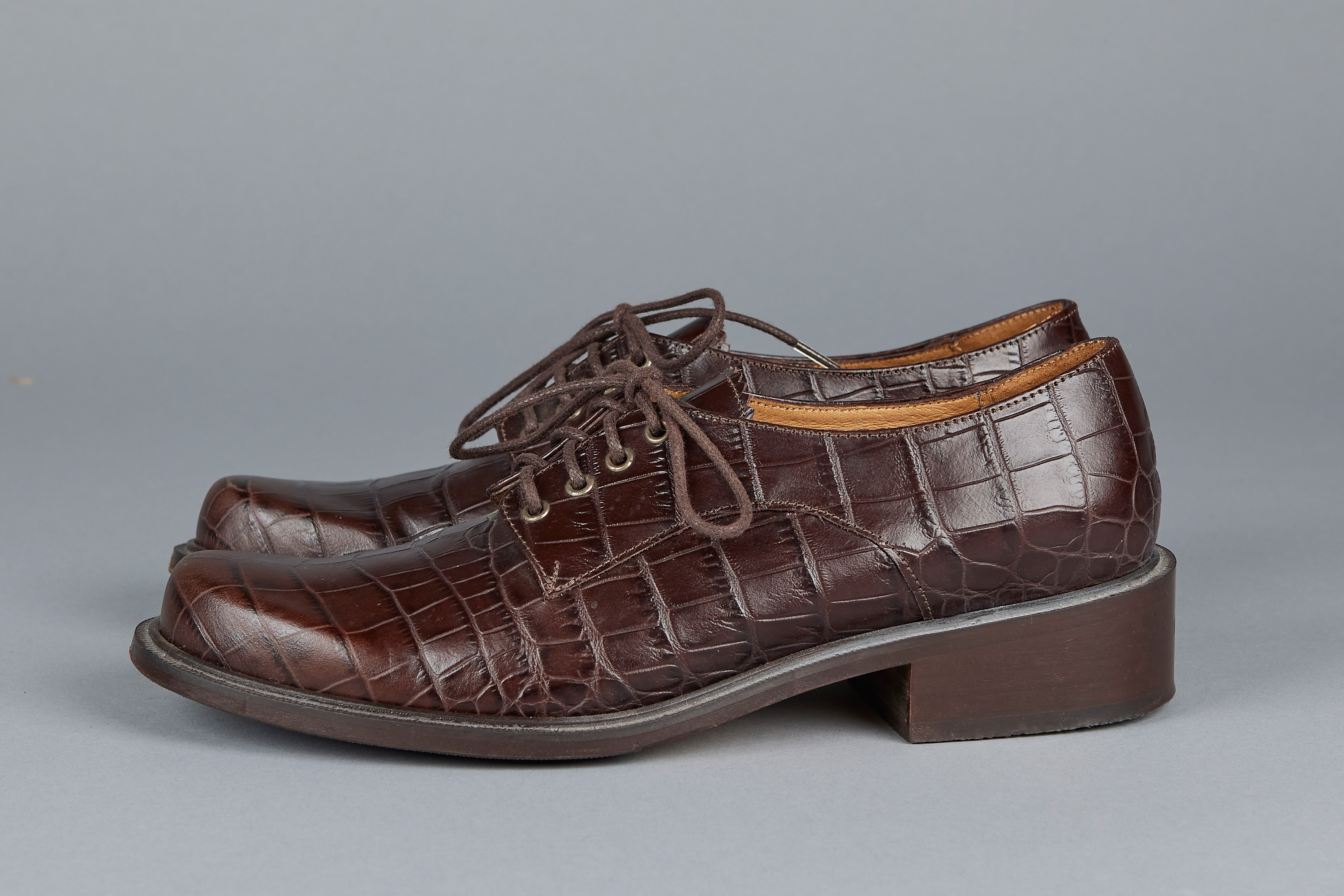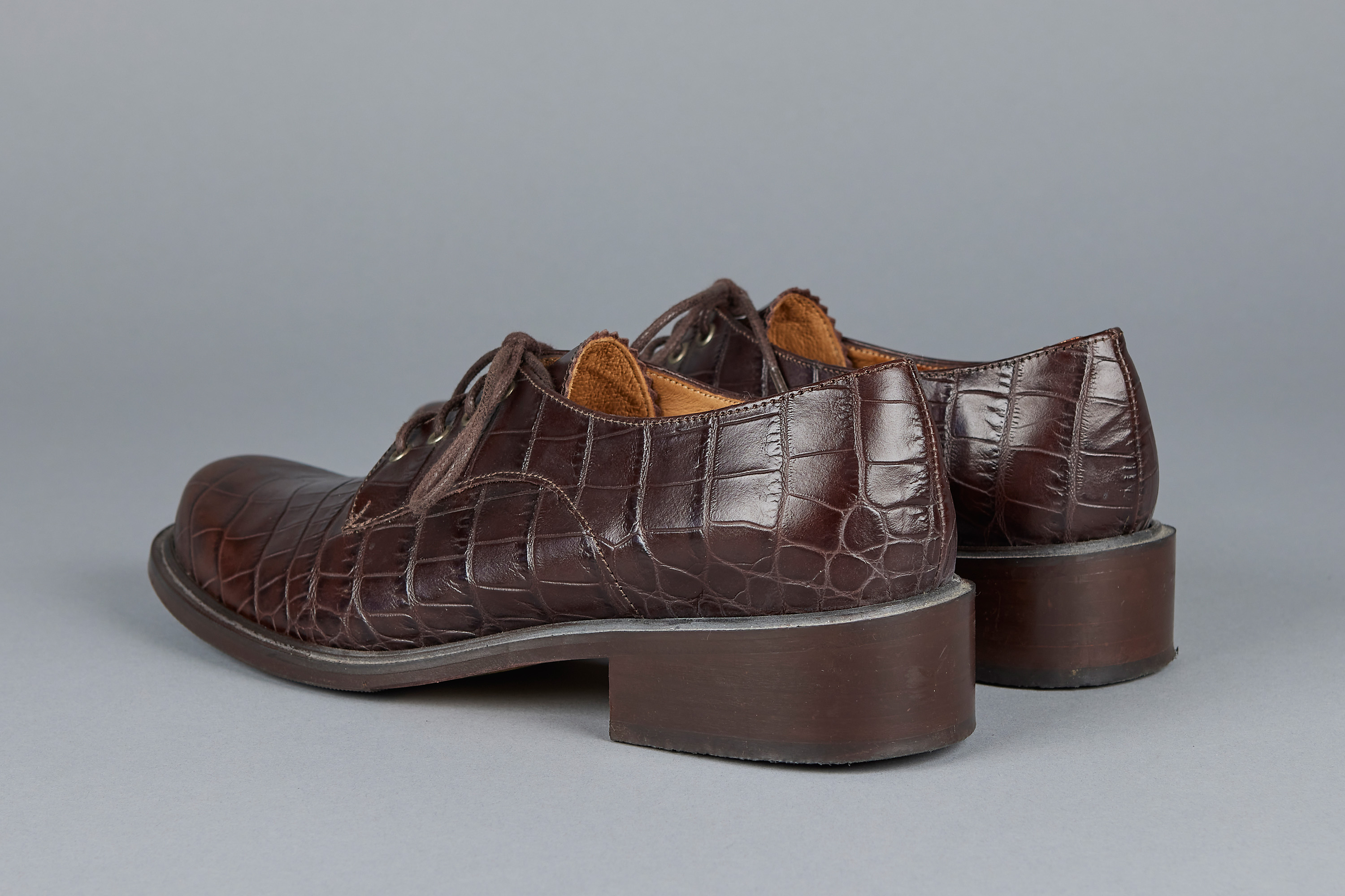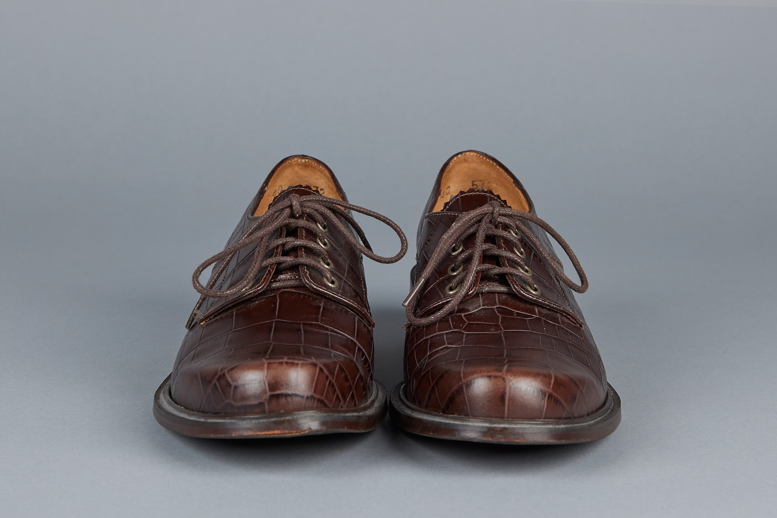 brown imitation crocodile embossed leather, uppers, pinked edges on tongue, laces, leather lining and sole