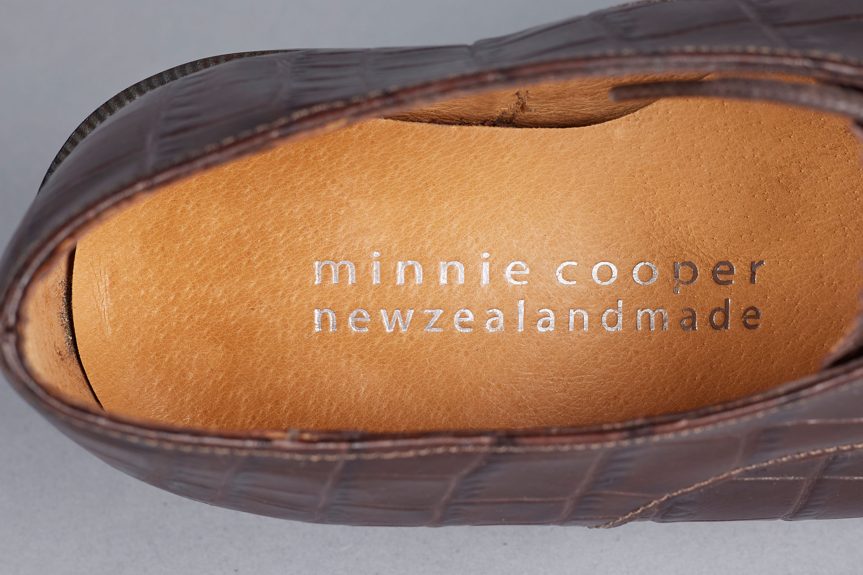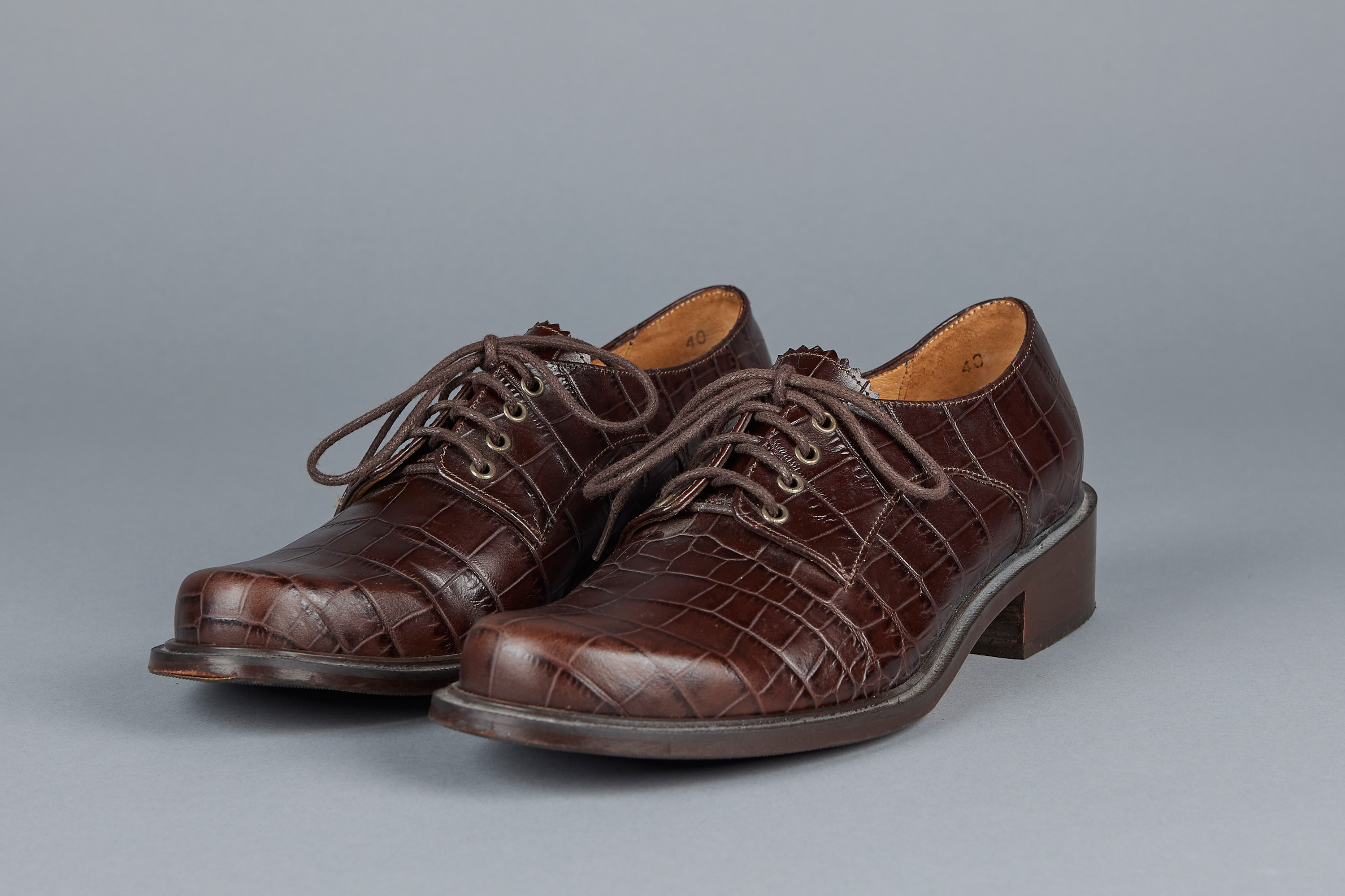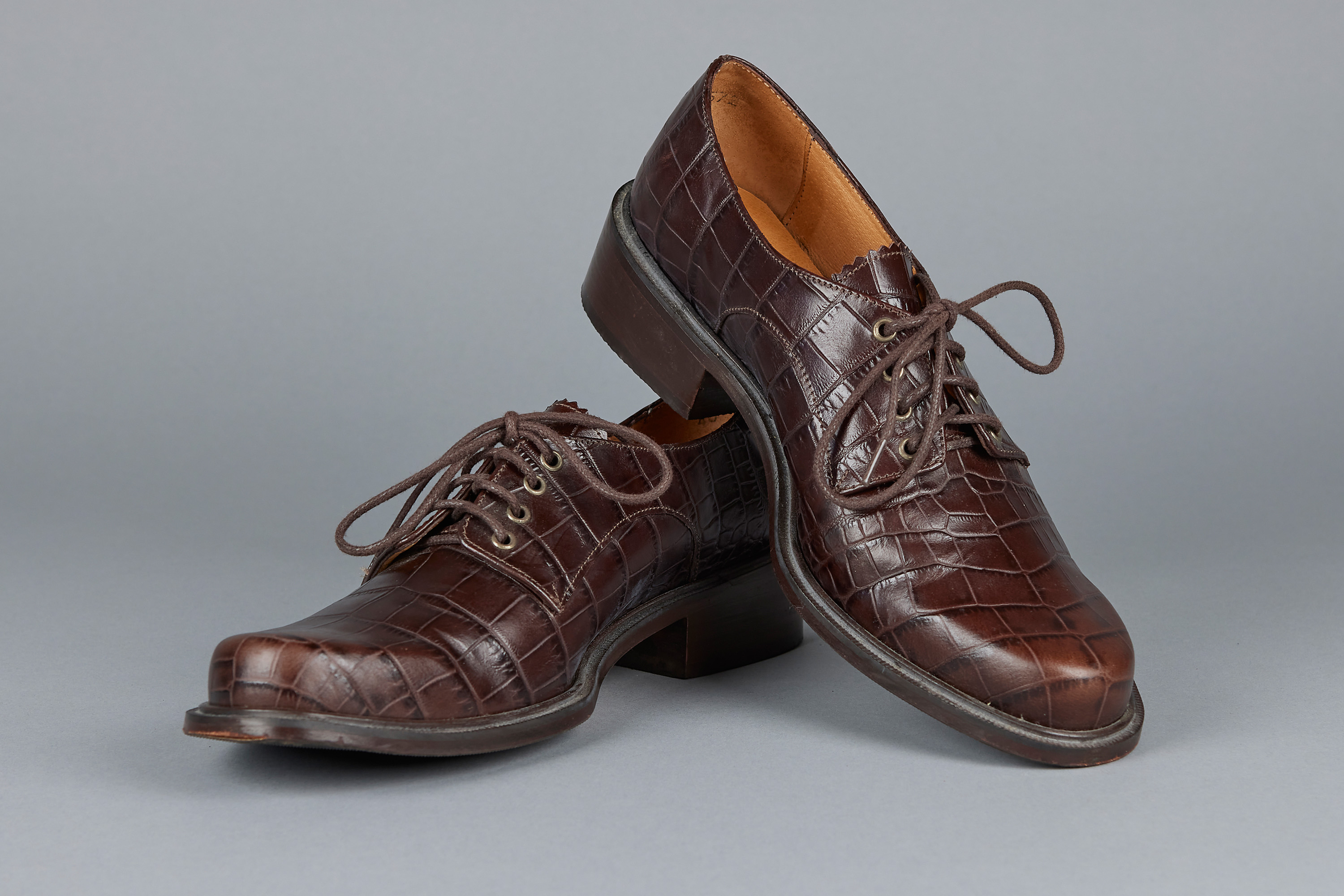 These brown lace-up derby style shoes made of imitation crocodile printed leather hail from a later period in Minnie Cooper's career, as noted by the embossed, modernised logo present on the interior of the shoe, a change from her fabric labels present in earlier years. They feature all leather construction, a mark of quality that Cooper's shoes came to be known for.
