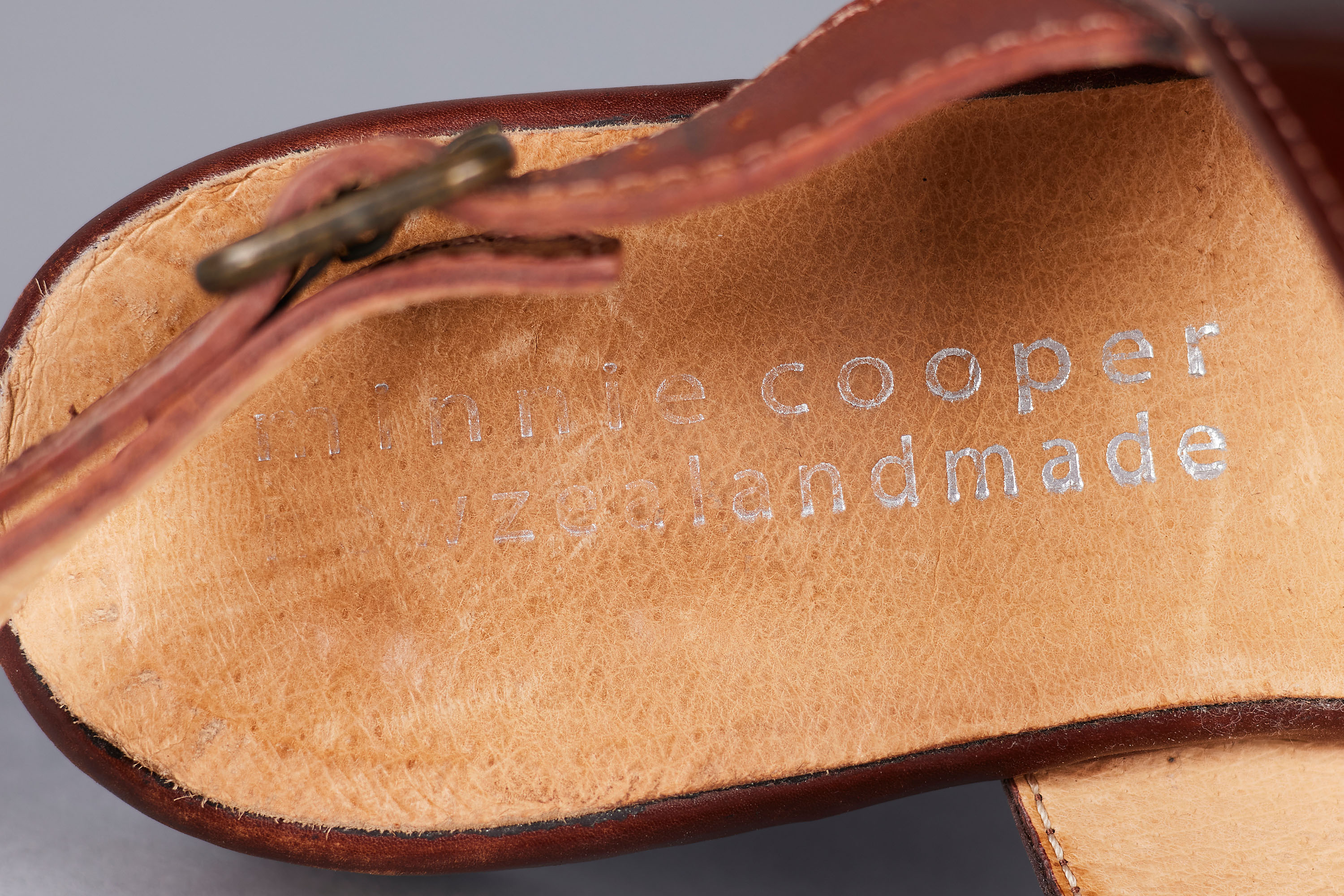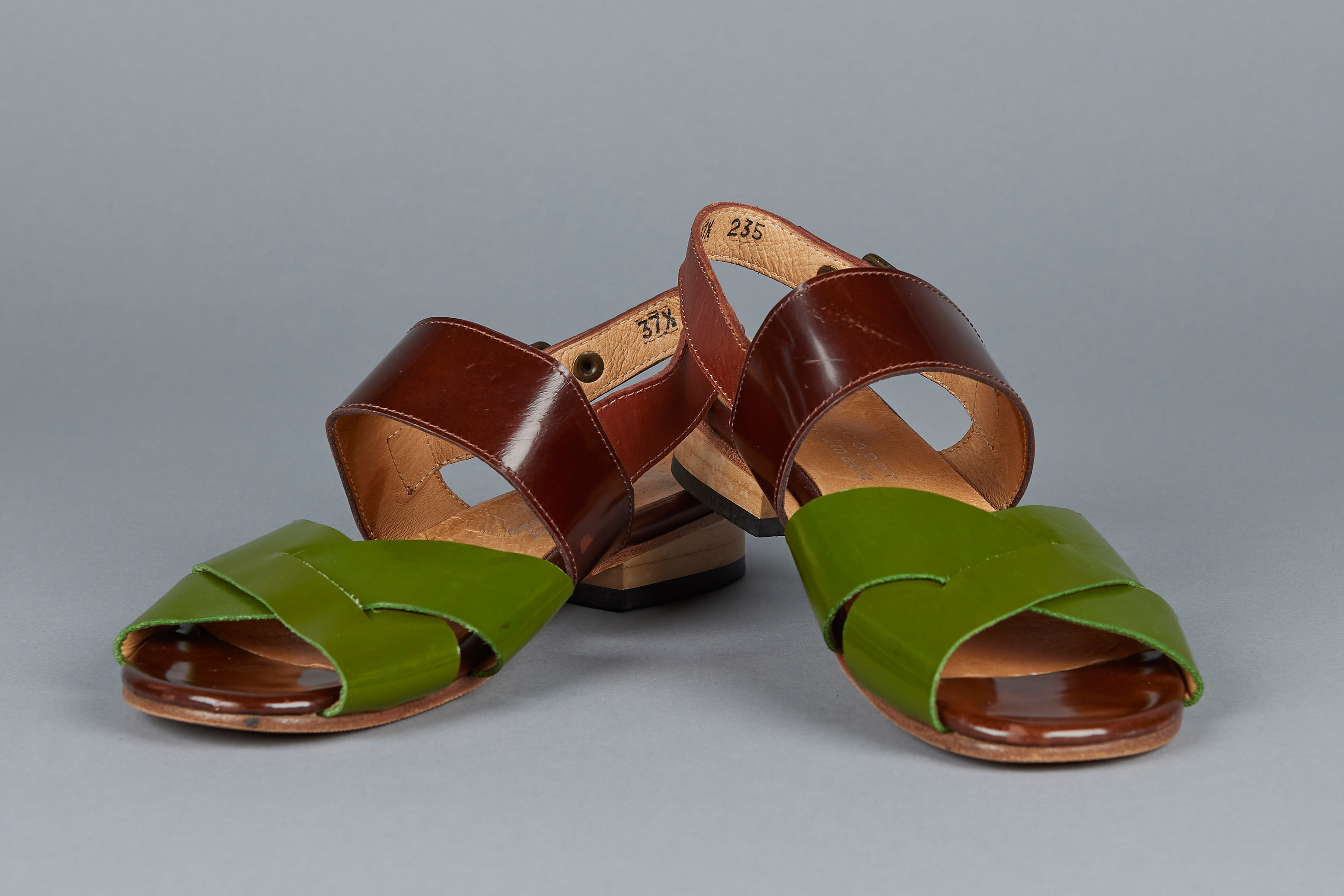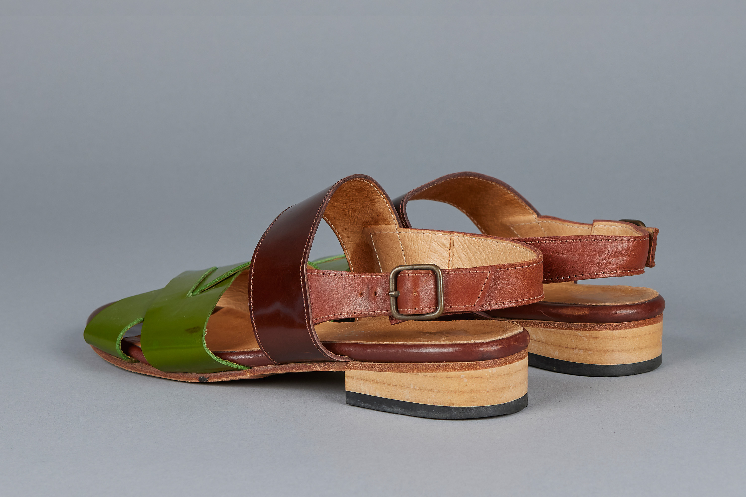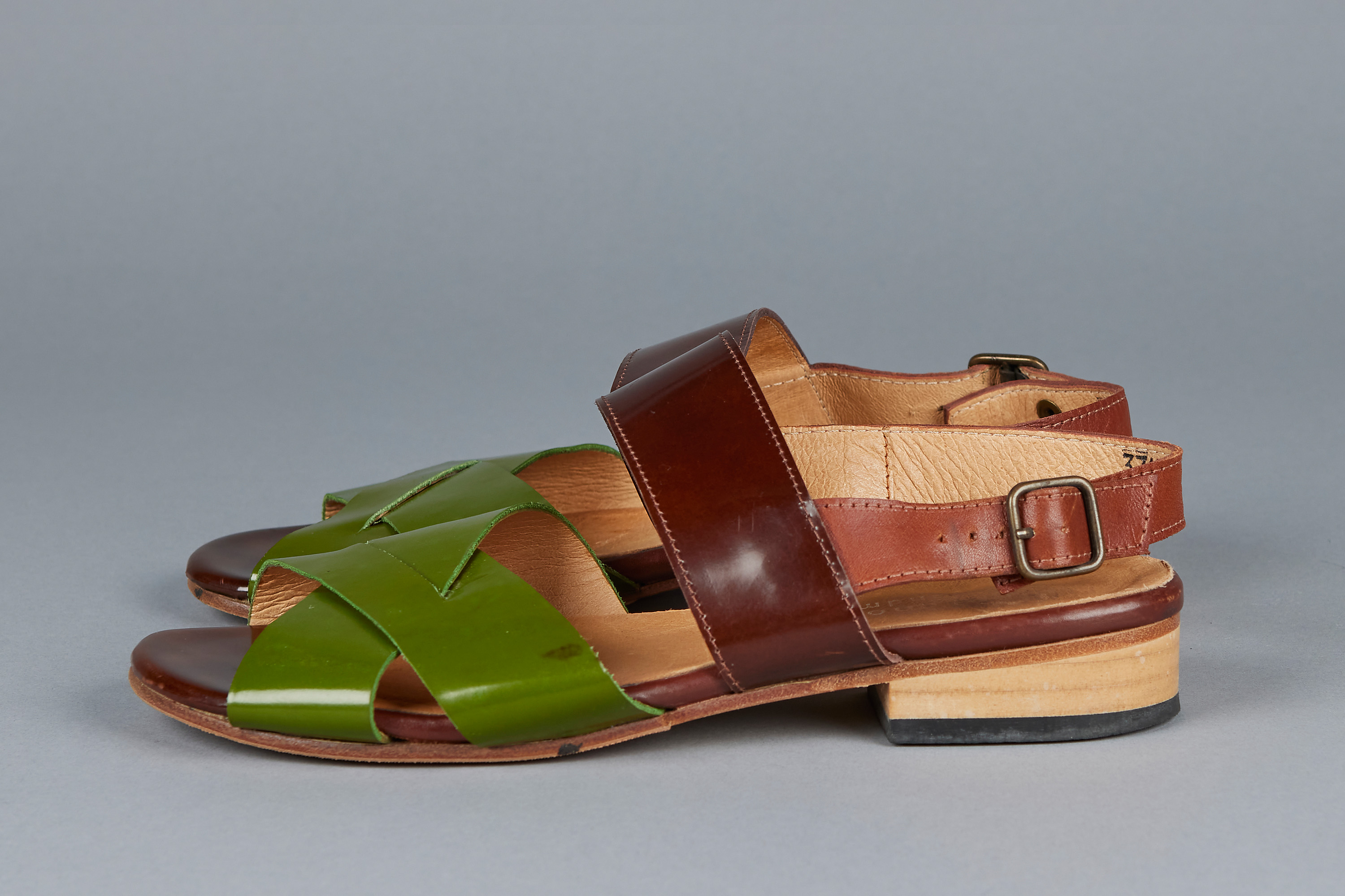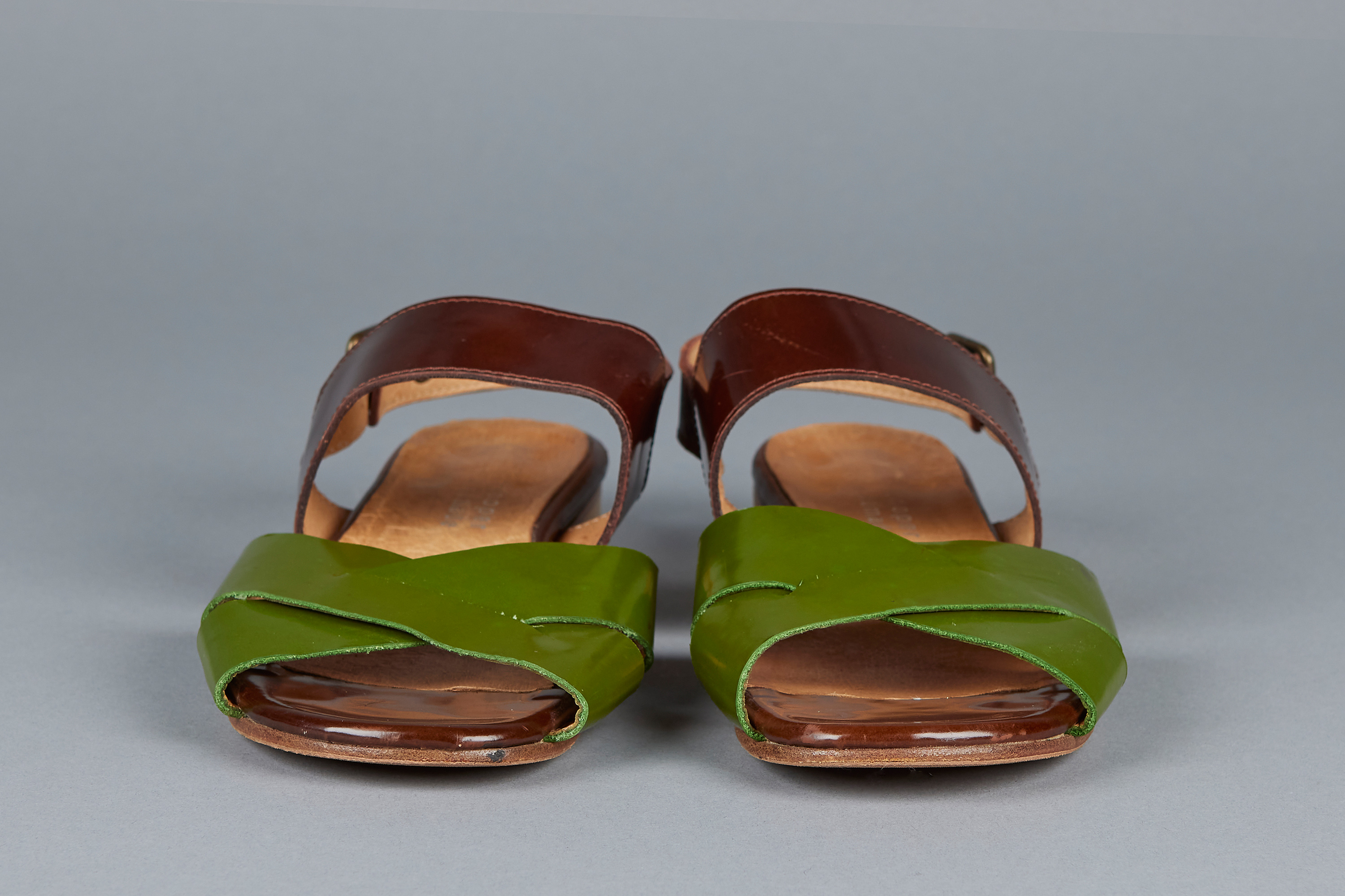 These tri-tone leather strap sandals hail from a later period in Minnie Cooper's career, as noted by the embossed, modernised logo present on the interior of the shoe, a change from her fabric labels present in earlier years. They feature all leather construction with a glossy finish on the green and dark brown panels, as well as brass toned metal buckles.