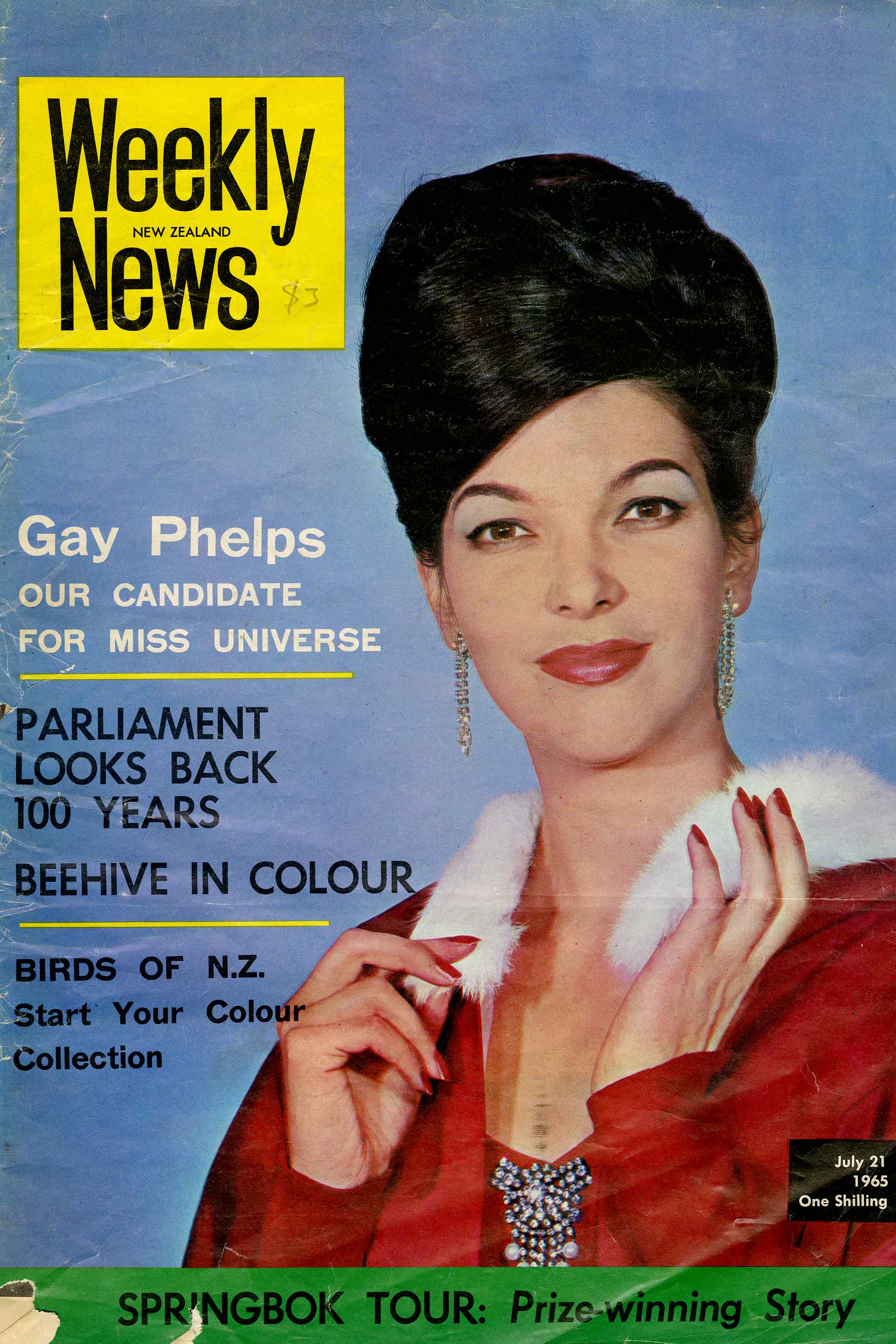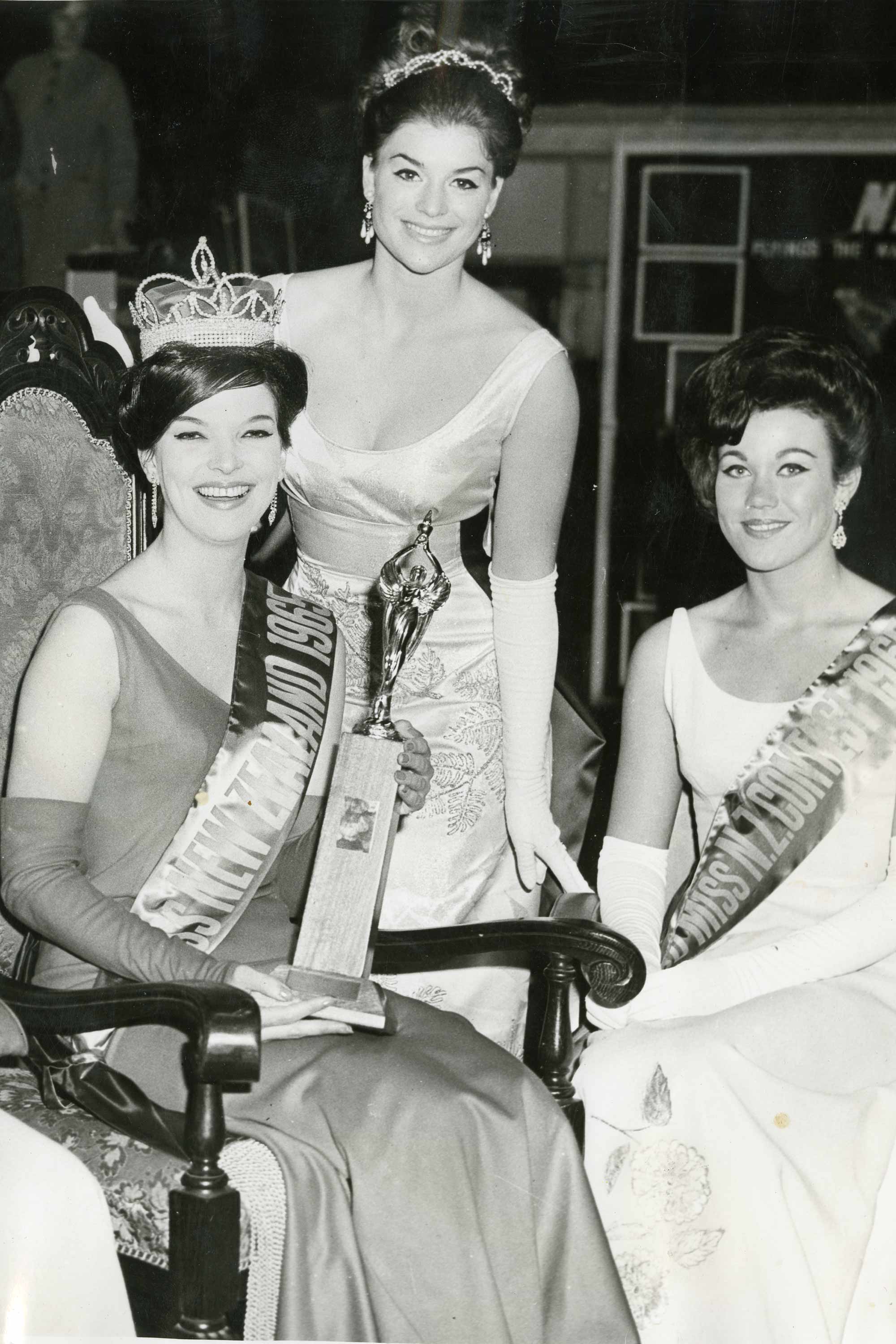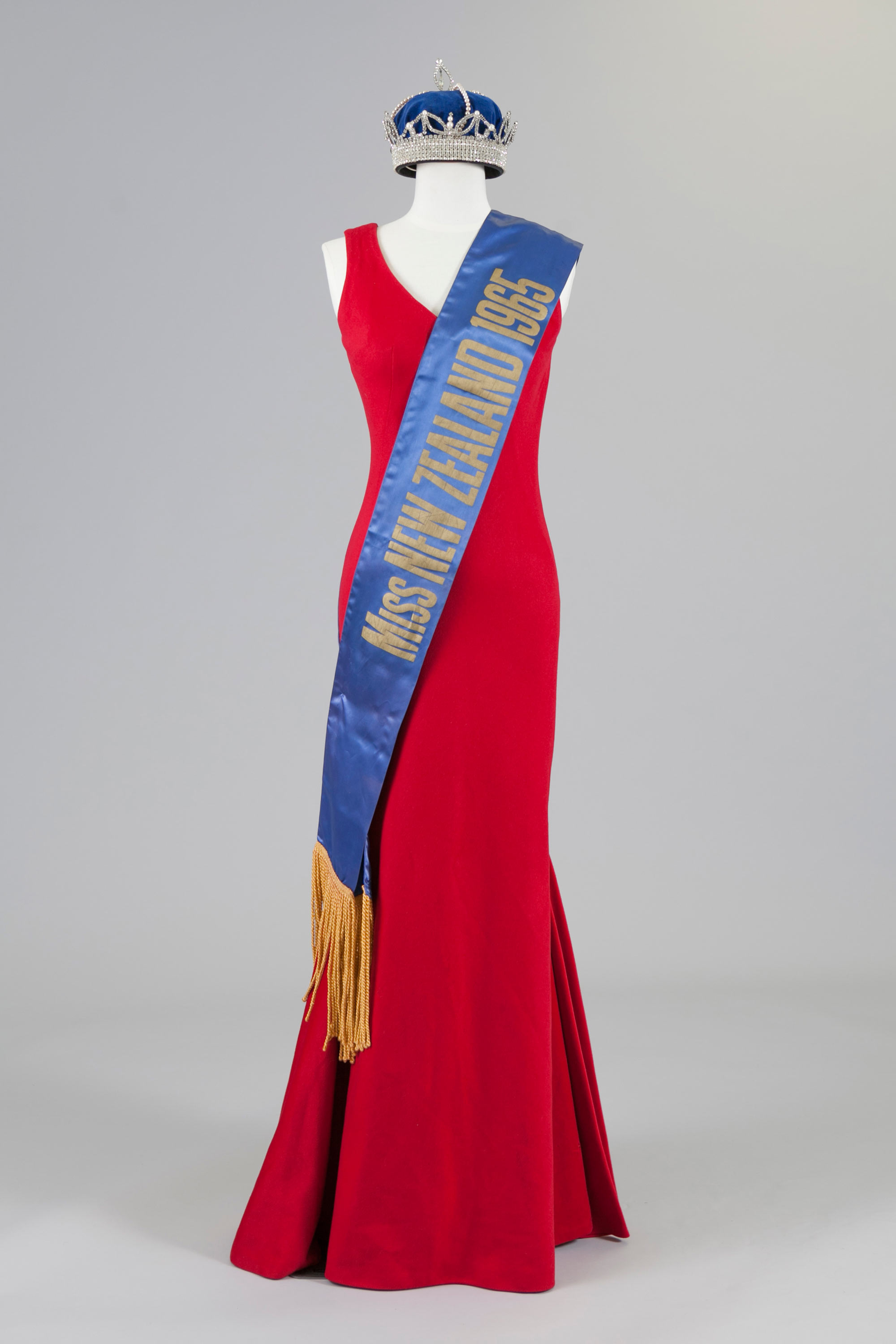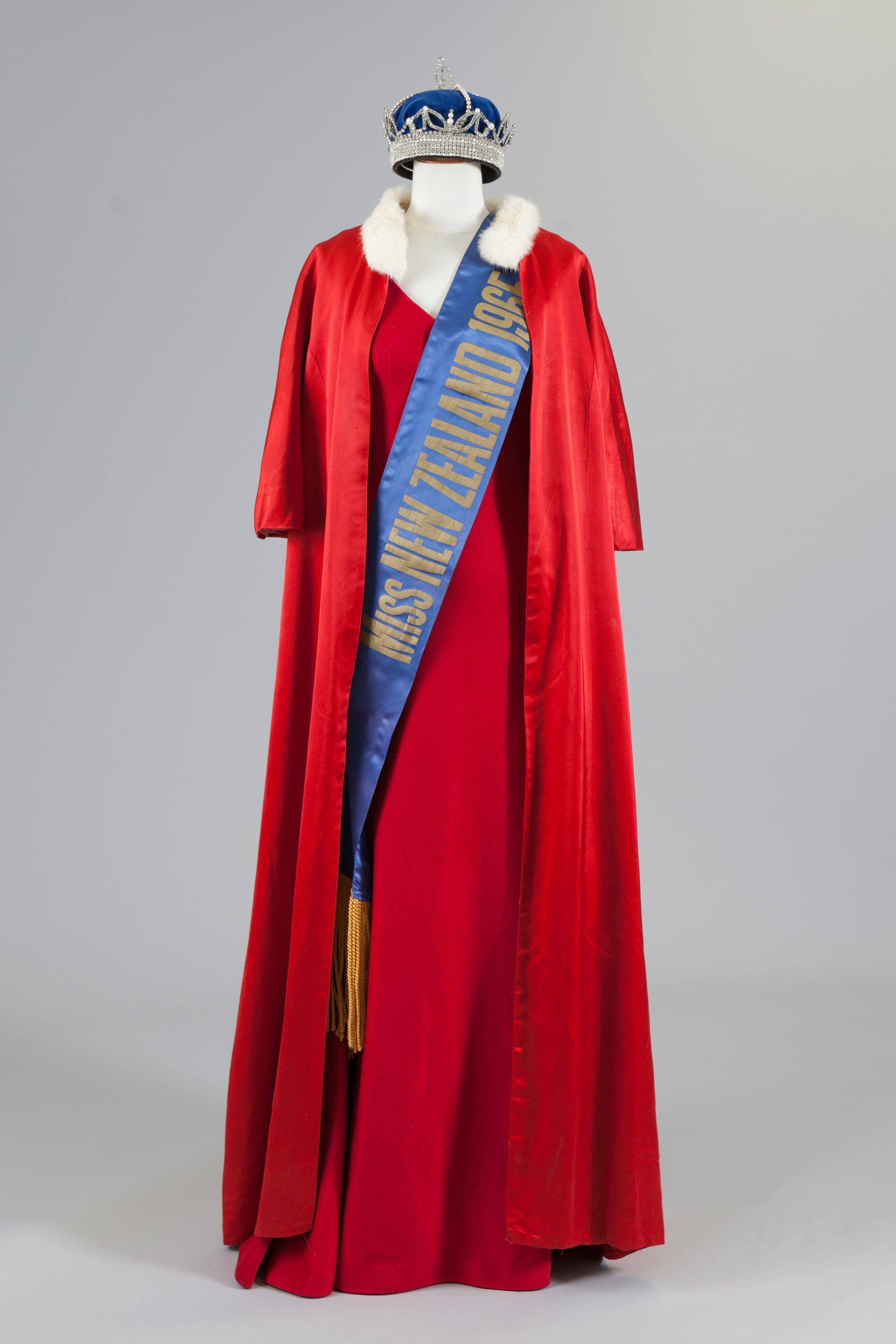 Gay Williams (née Phelps) was 21 years old when she was crowned Miss New Zealand. She was brought up on a farm in the Wairarapa, before moving to Auckland to study. She began an arts degree before switiching to teachers' training college. She had just finished her second year when she won the Miss New Zealand contest. Gay wore a red gown and cape for the final event of the contest. The New Zealand Wool Board was one of the contest's biggest sponsors so all of the contestants had to have a wool evening gown. Gay's gown and cape was designed and made by Peggie Wilson who owned the Academy of Elegance in Auckland. The V-necked gown was cut lower at the back and Gay wore it with a diamante brooch and earrings. One of Gay's tasks during her year as Miss New Zealand was to introduce and promote the Woolmark. Her wardrobe for the year was made from wool.