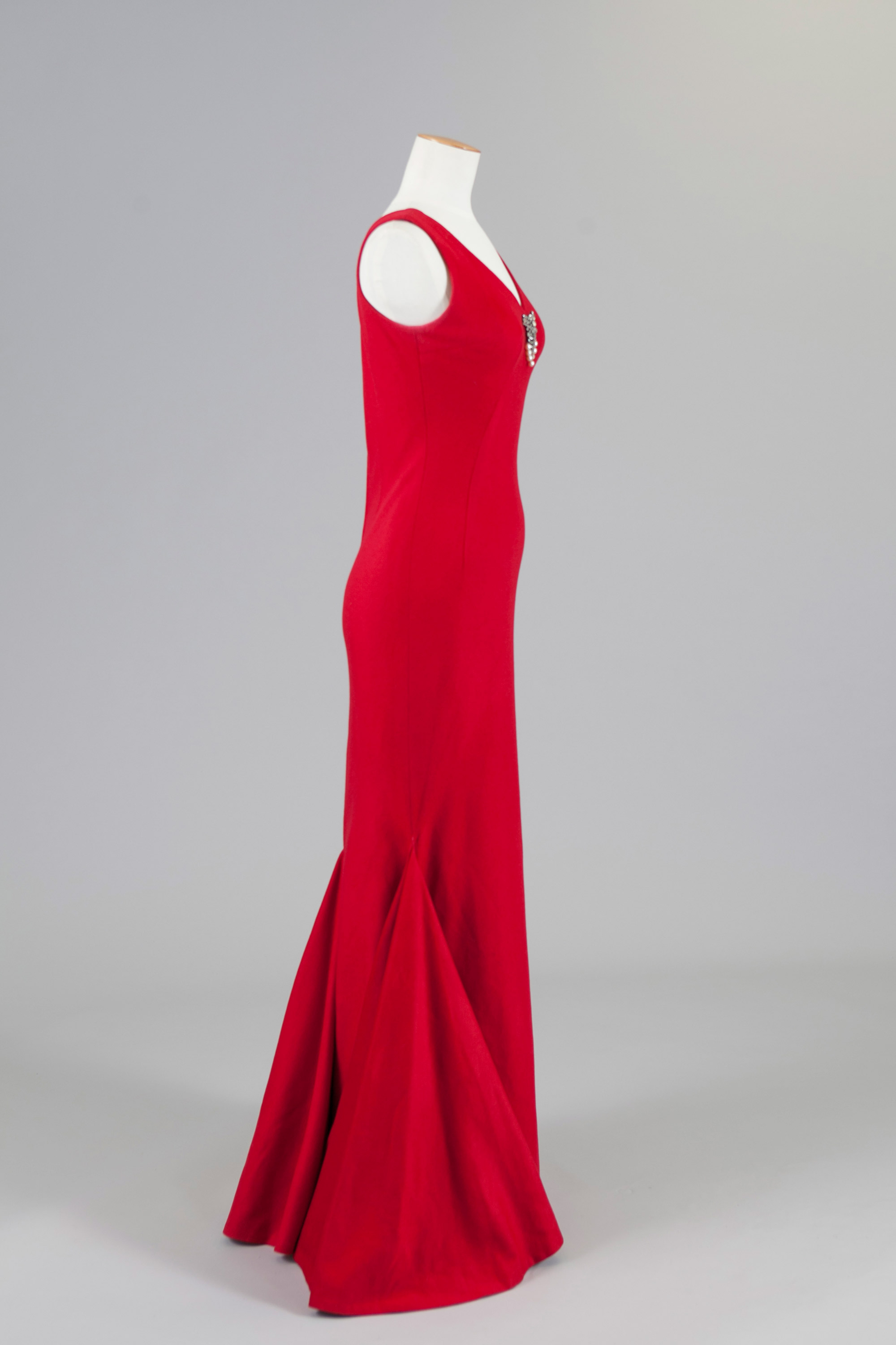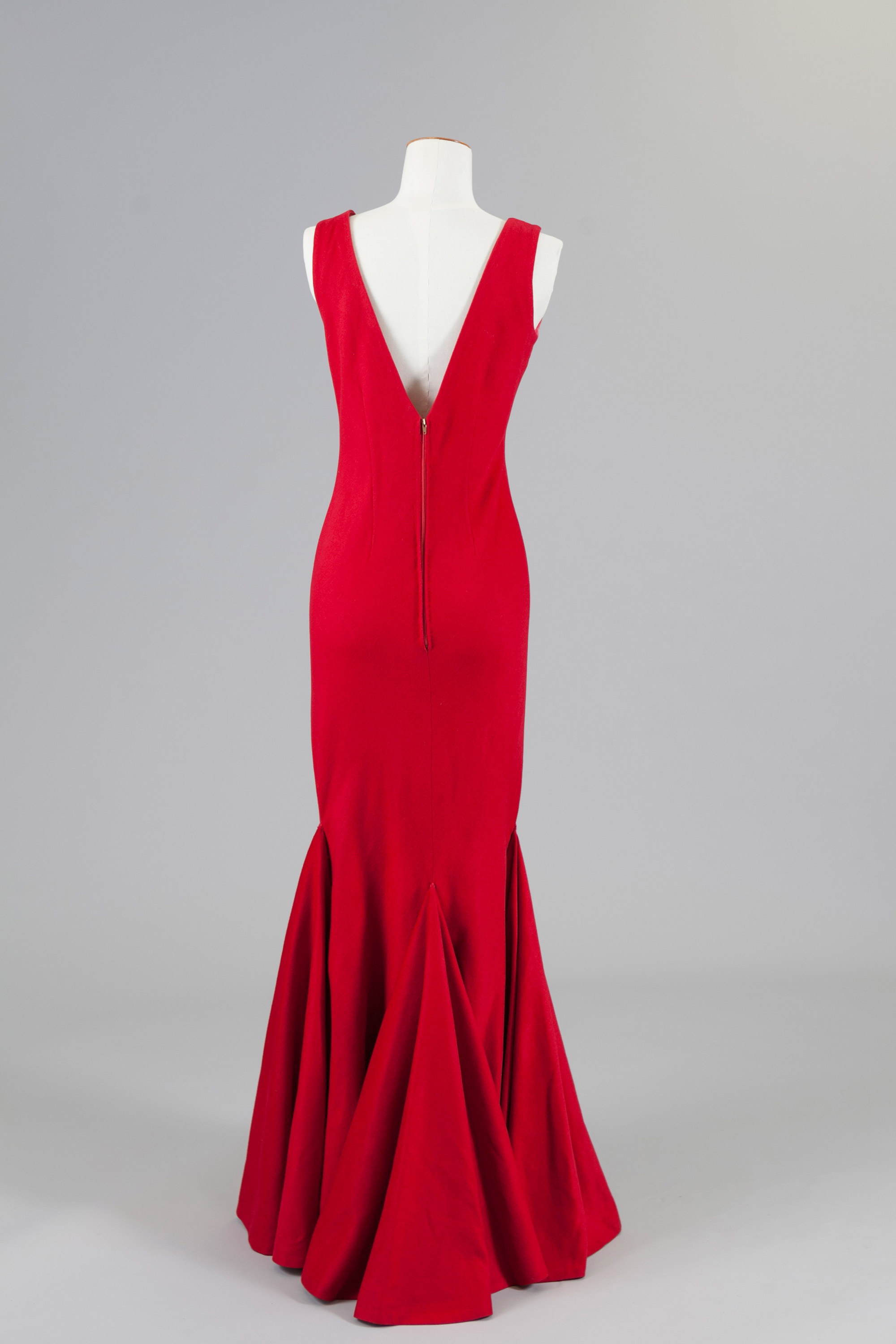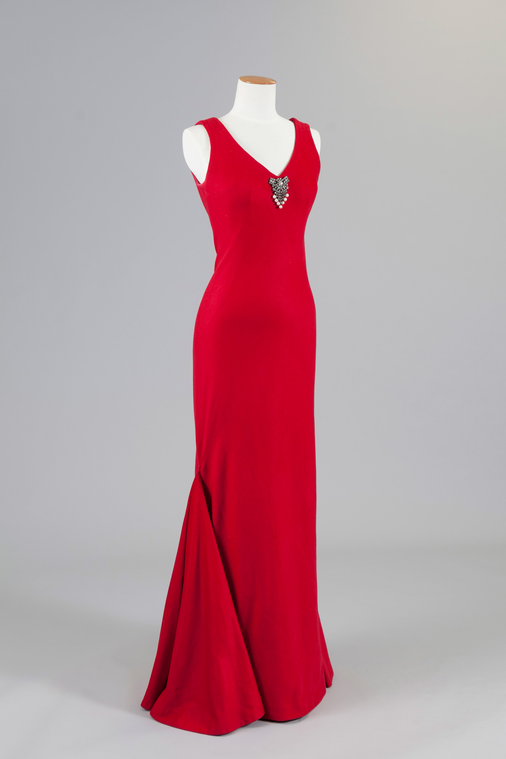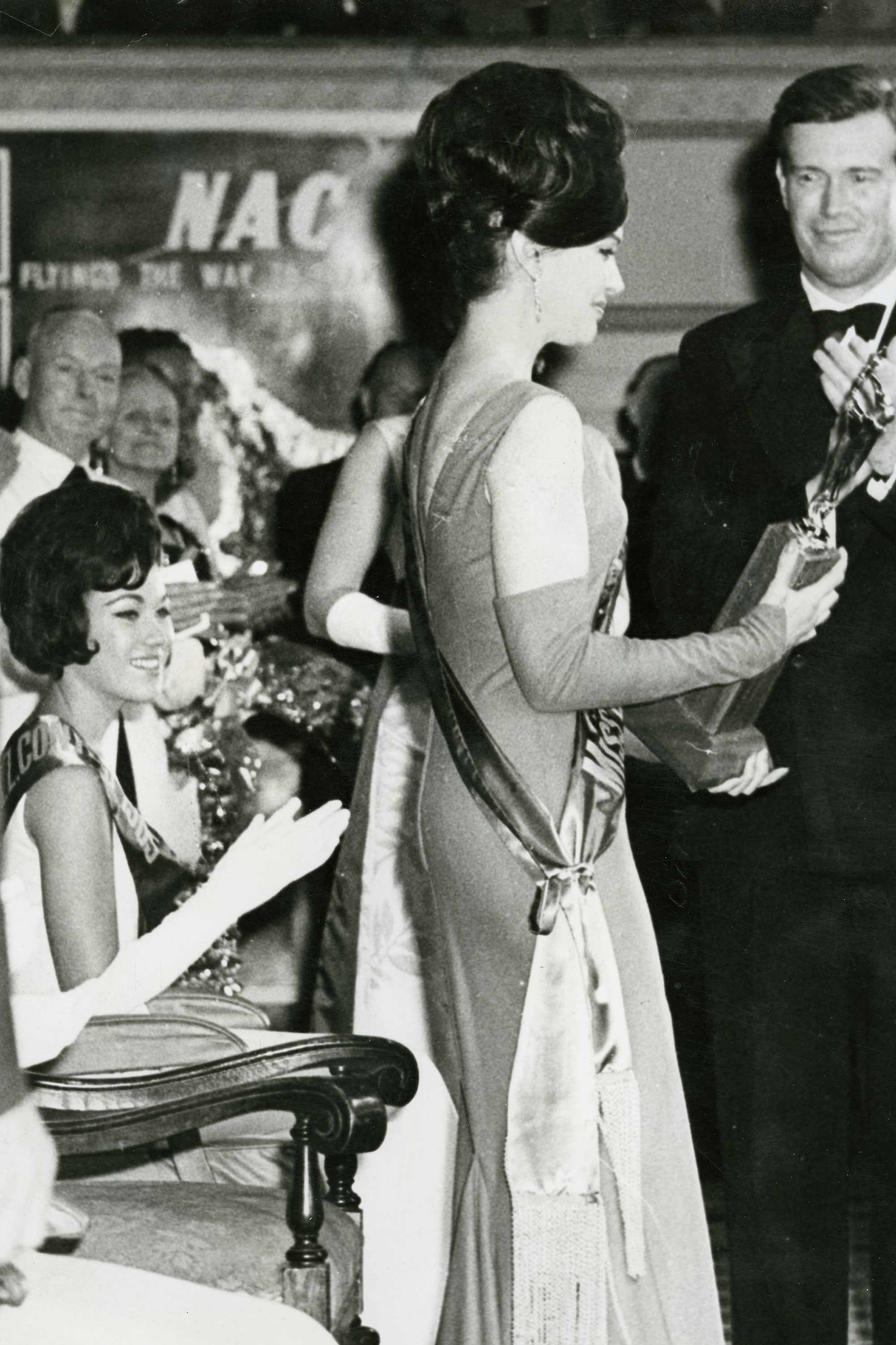 Gay Williams (née Phelps) was 21 years old when she was crowned Miss New Zealand. She was brought up on a farm in the Wairarapa, before moving to Auckland to study. She began an arts degree before switiching to teachers' training college. She had just finished her second year when she won the Miss New Zealand contest. Gay wore a red gown and cape for the final event of the contest. The New Zealand Wool Board was one of the contest's biggest sponsors so all of the contestants had to have a wool evening gown. Gay's gown and cape was designed and made by Peggie Wilson who owned the Academy of Elegance in Auckland. The V-necked gown was cut lower at the back and Gay wore it with a diamante brooch and earrings. One of Gay's tasks during her year as Miss New Zealand was to introduce and promote the Woolmark. Her wardrobe for the year was made from wool.