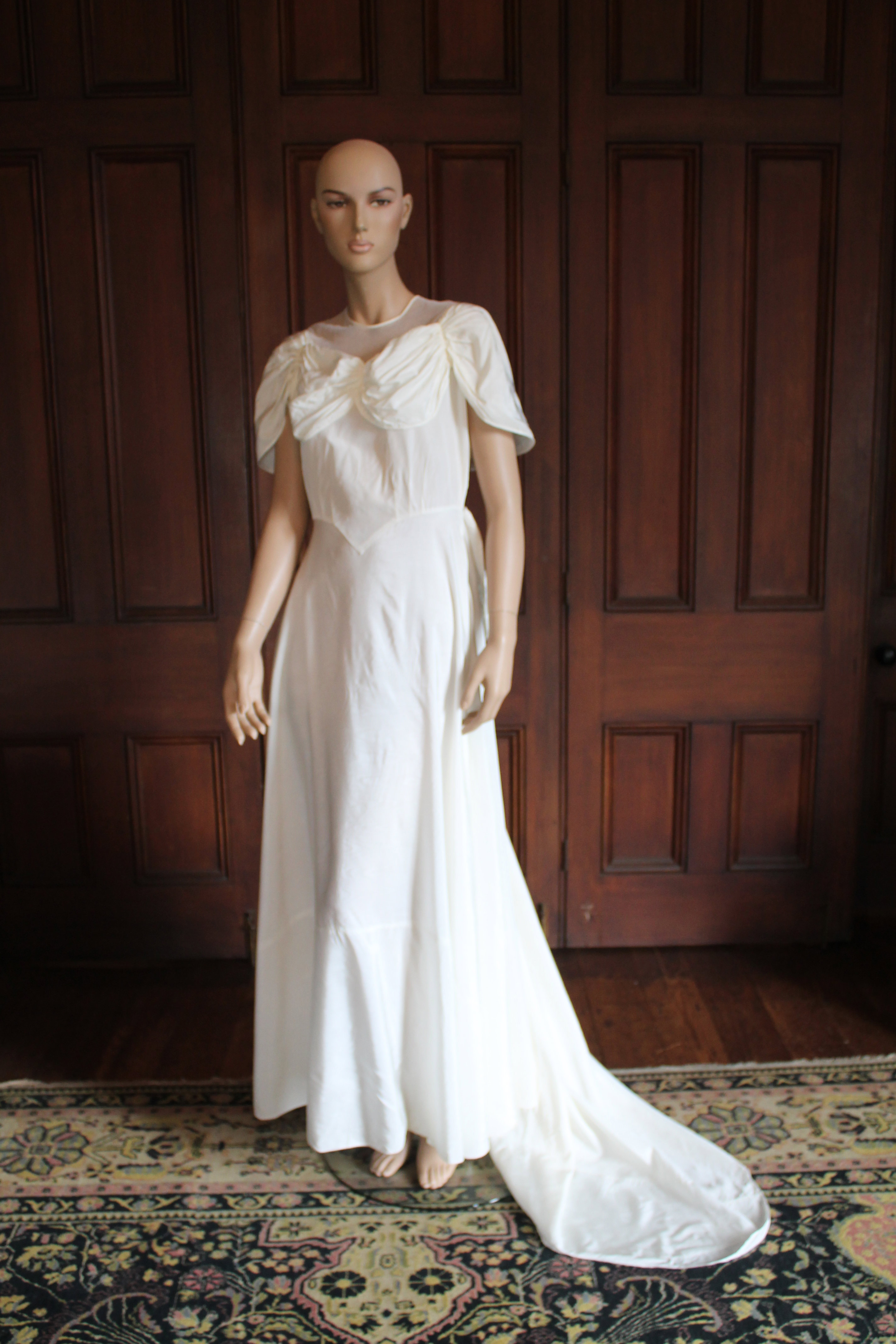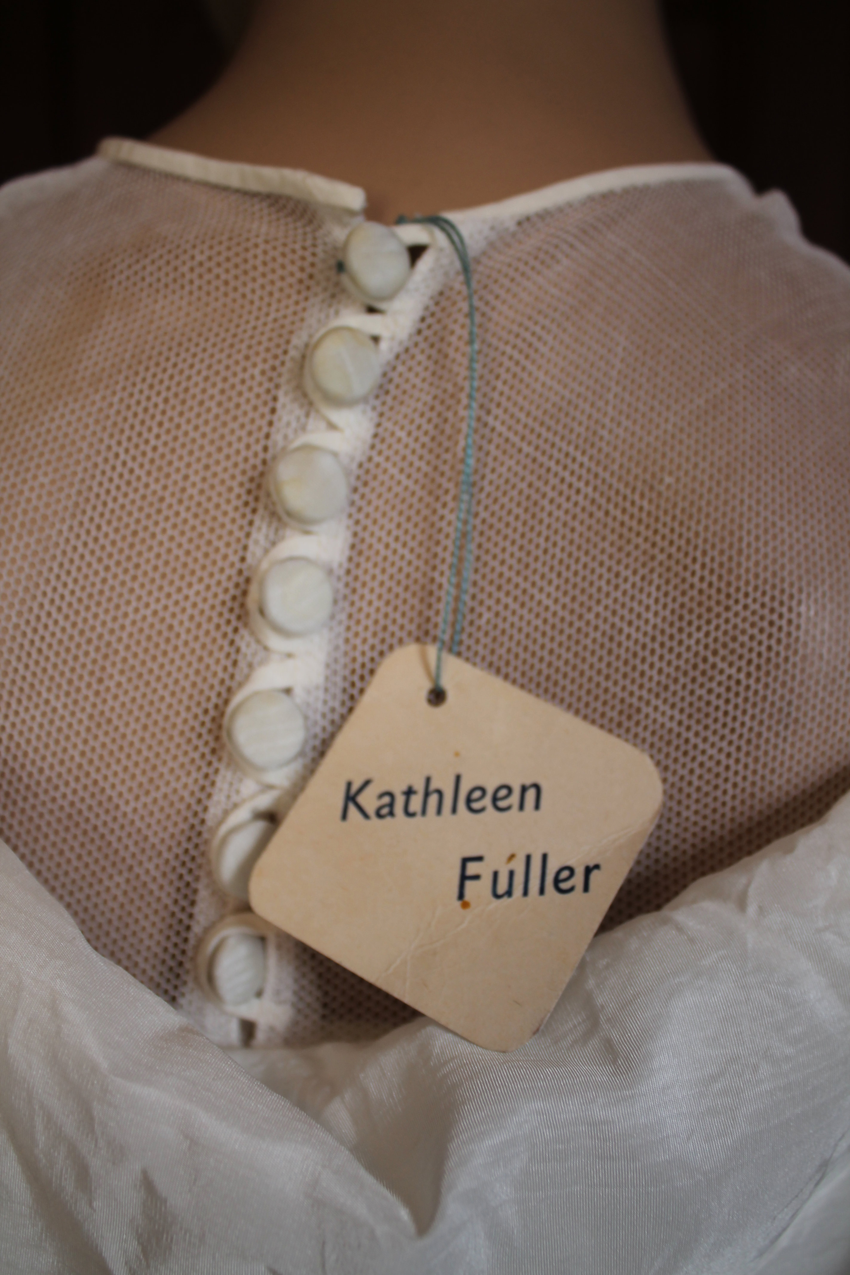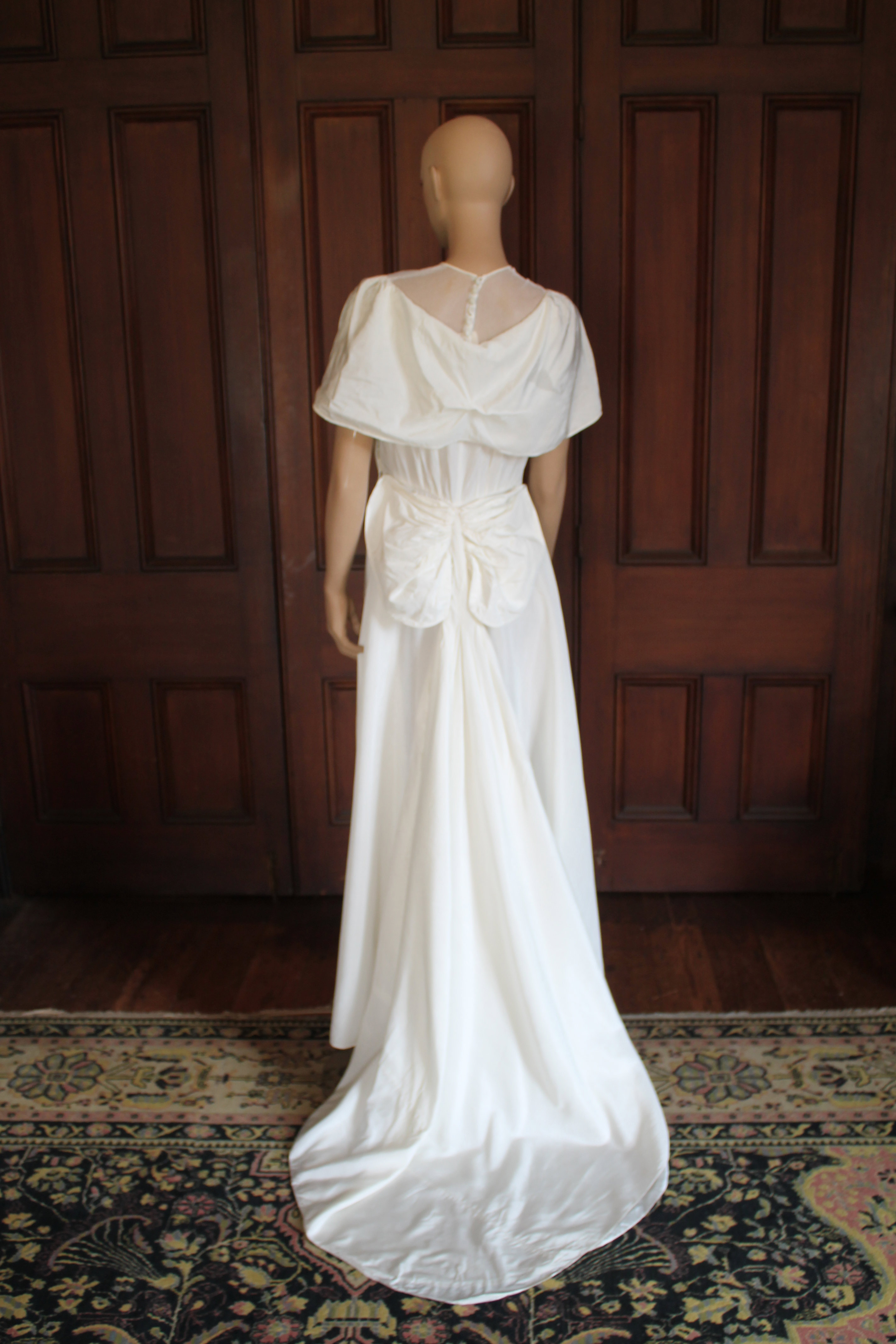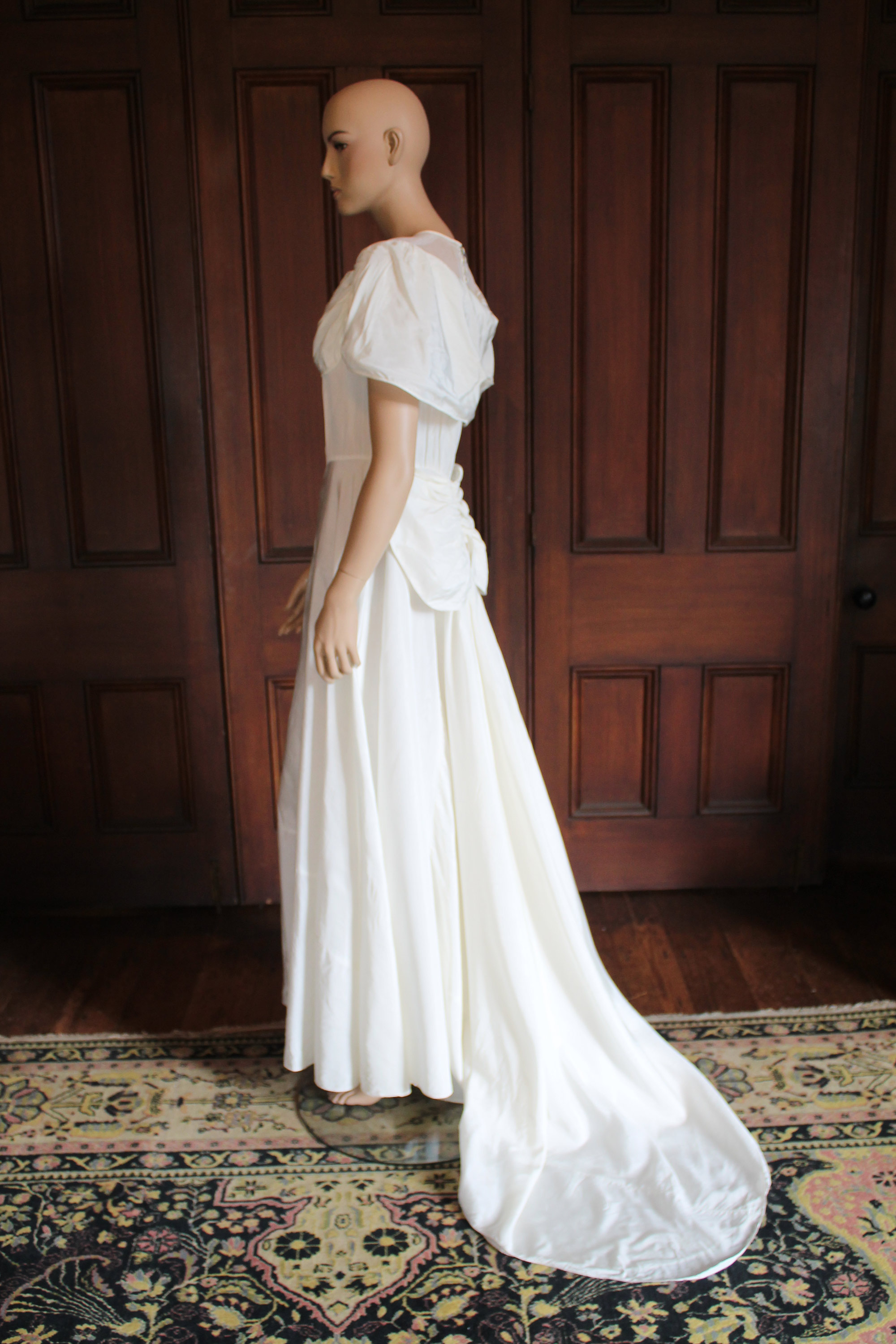 The beautifully light synthetic taffeta from which this was made is called moiré, which refers to its ‘watered’ appearance. The effect, which would have been visible when the bride moved, was produced by passing the fabric through rollers, with pressure and heat causing the pattern to set. The designer, Kathleen Fuller, was skilled at making the most of beautiful fabric and avoiding the use of extraneous trimmings. Here she has used a swathe of the same fabric to appear as if a short cape around the shoulders, with vertical ruching applied at the front to form romantic puffs over the bust. This bow-like detail is repeated at the lower back where it serves as a subtle bustle and a clever way to insert the ends of the long panels forming the short train.