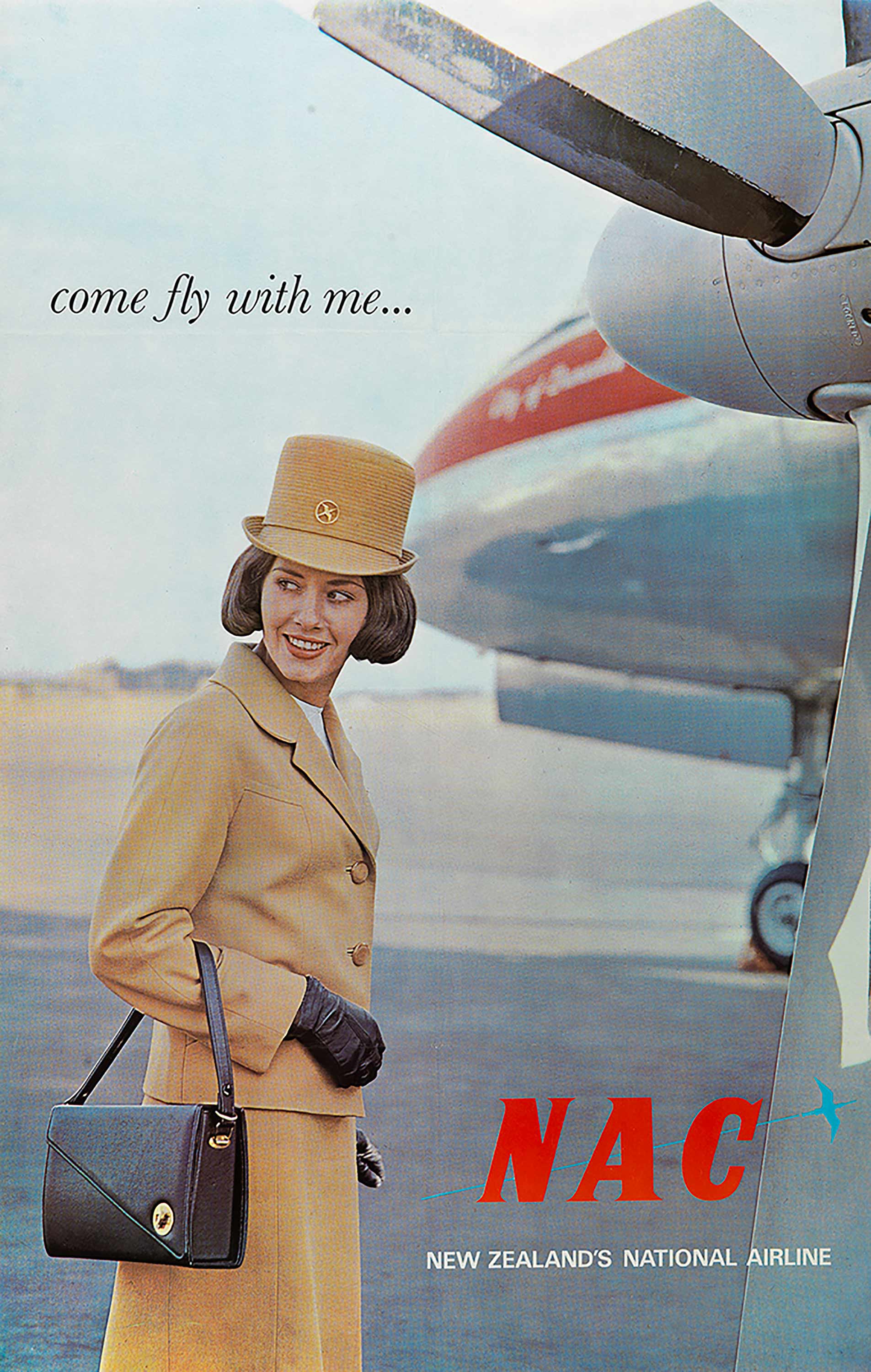 The redesign of the National Airways Corporation (later Air New Zealand) uniform in 1966 was the first time that the airline had taken on a complete change of design and colour. It was first revealed in Europe in February 1966 where it was highly praised for its fresh design. 'Golden Cloud' was very carefully designed by Babs Radon designer Barbara Herrick and, while its loose-fitting line was a departure from her usual tailoring, it successfully achieved the ease of movement which the NAC staff required in their day-to-day work. The hostesses responded favourably to Barbara's design saying "We don't really think of it as a uniform – it's more like a smart suit." Barbara chose a distinctive golden topaz colour, designed into a three-piece suit, coat and hat, as the unusual shade complemented a wide range of skin colourings and set the New Zealand hostesses apart from the usual blues, greens and browns of airline uniforms. The fabric was produced at Wellington Woollen Mills, and the uniforms were made by Classic Manufacturing. The first blouses featured a small bow at the neckline with three decorative pearl buttons ran down from the bow. The blouses also had double cuffs with pearl cuff links supplied. The second rendition of the blouse didn't have the bow but had a mandarin collar with pleated front panelling. Both blouses were designed to be worn in flight, without the jacket. The hat was designed and manufactured by Plummers Ltd and featured a 9ct gold Godwit framed in a circle – NAC's insignia. The hat and breast badges were both designed by NAC staff. The first hat was fabric with rows of stitching to give it structure; the second version was made of felt. They were known as the 'Colman's Mustard pots'. Black gloves and a handbag were also part of the uniform, but jewellery, earrings and nail polish were forbidden.