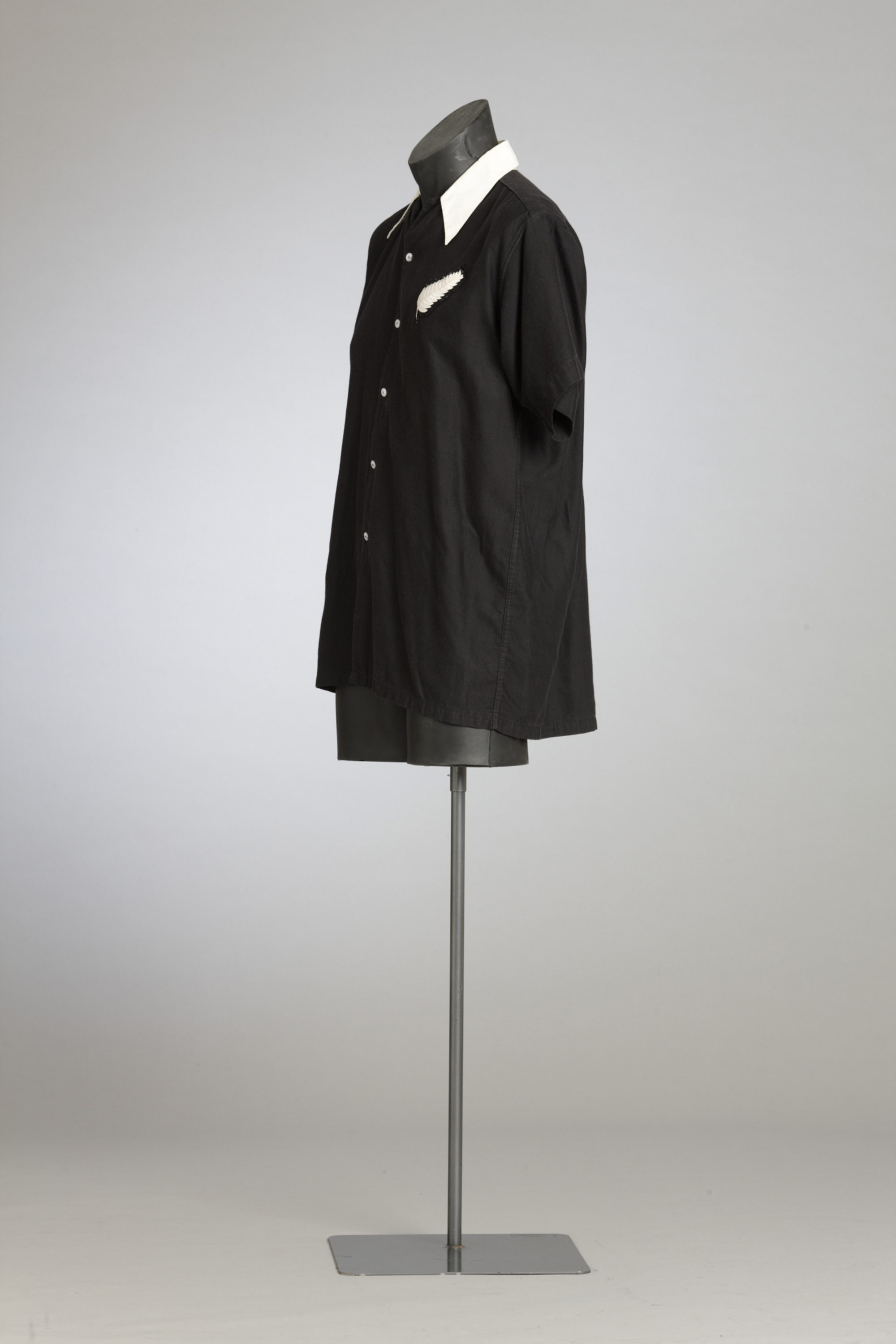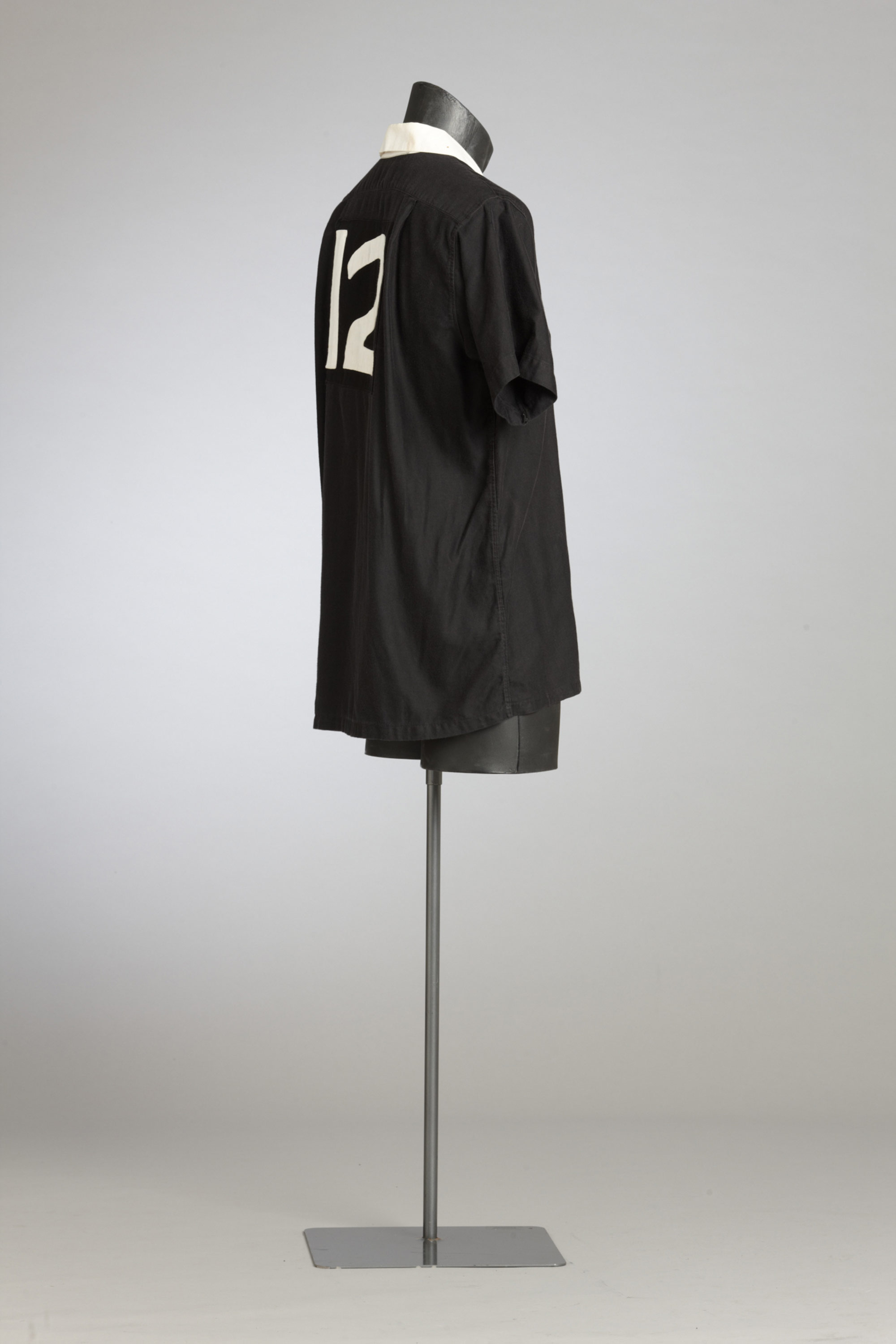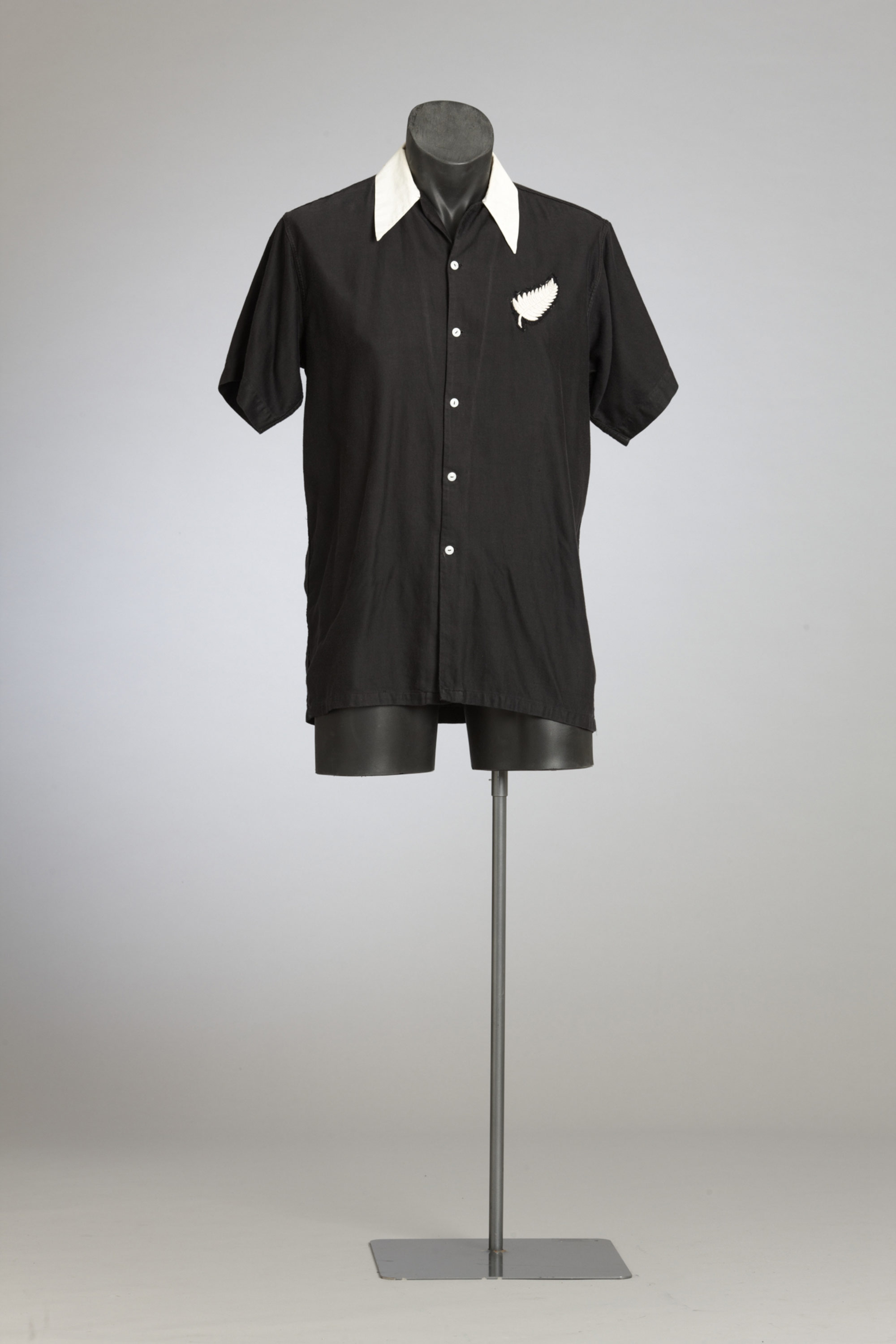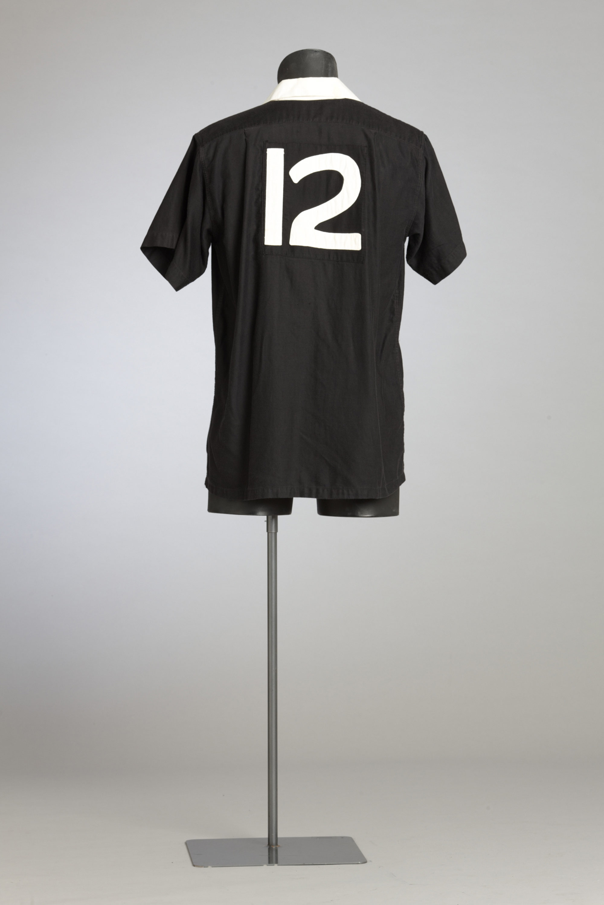 This shirt was worn by Leo Hope-Ede, who started as an inside forward for the Metro College Club before he represented New Zealand on the Association Football Pacific Tour in 1951 and again in 1952, playing a total of 12 games. This number 12 shirt was worn by Leo on the 1951 tour. They were not then called the All Whites because like most New Zealand teams, their uniform was a black shirt. It had a white collar, with a silver fern on the left breast, white shorts and black socks with white tops. The All Whites now play in an all-white strip, rather than the traditional Kiwi sporting black. This is because FIFA regulations reserve the black strip for international referees. The All Whites nickname is also a play on the All Blacks. Read more about wearing the colour black in the New Zealand Fashion Museum publication Black: The history of black in fashion, society and culture in New Zealand.