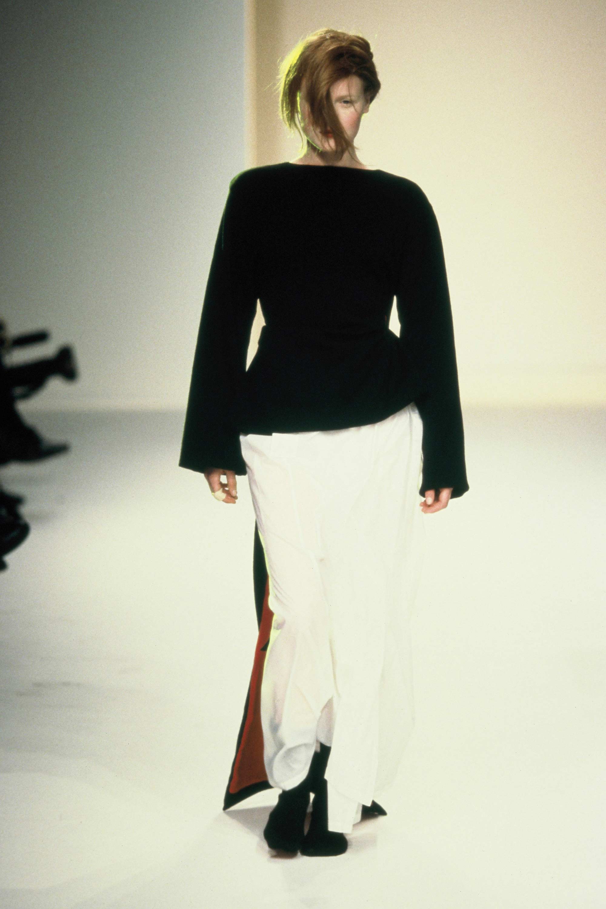 The 'New Zealand Four' was the collective name given to labels NOM*d, Zambesi, Karen Walker and World in 1999. Selected to participate at two London Fashion Weeks, they received favourable critical response from the international fashion press, an important confirmation to New Zealanders that our designers are world class. Selection for the 1999 London Fashion Week prompted NOM*d designer Margarita Robertson to extend her knitwear label to include woven garments. Robertson rejected high fashion’s use of luxury fabrics and was inspired by uniforms and functional clothing, including women’s bowling uniforms, as evident in the white parka nylon skirts. The re-configuration of clothing is another NOM*d theme, exemplified by the woollen socks with a latex sole – becoming shoes. Trips to Japan and Japanese designers Rei Kawakubo (Comme des Garçons) and Yohji Yamamoto have influenced Robertson’s utilitarian, androgynous approach to fashion. NOM*d was established in 1986. Designer Margarita Robertson lives and works in Dunedin. The label’s trademark dark wit reflects the city’s relaxed non-conformity and gothic undertones. "Black ... it’s perfect for any occasion!", she says. Read more about wearing the colour black in the New Zealand Fashion Museum publication Black: The history of black in fashion, society and culture in New Zealand.