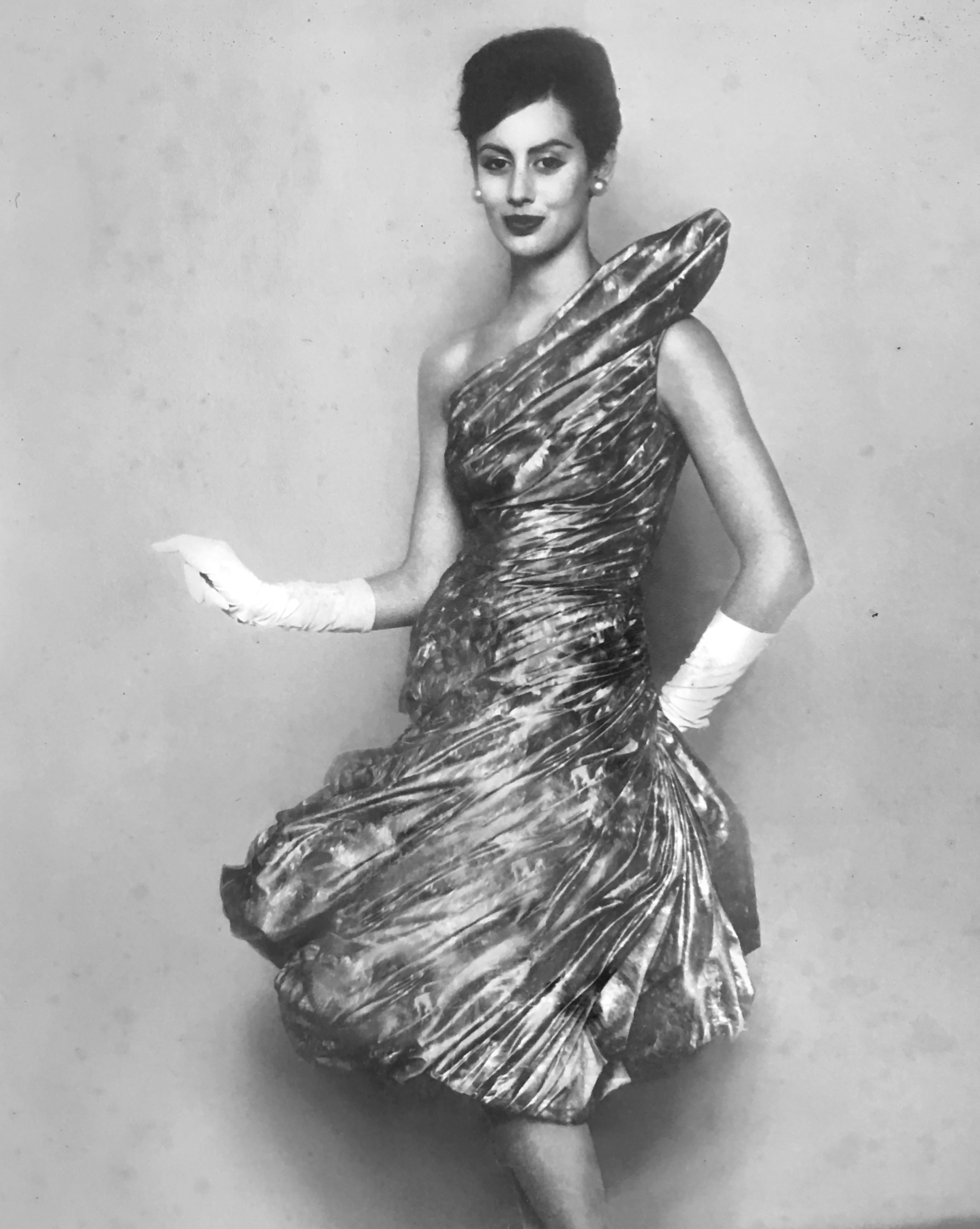 In 1965, Auckland Star newspaper asked the Milne & Choyce designer Bruce Papas to design an exclusive dress for a fashion feature. He made the dress from a silk that he thought was perfect for draping. Ana Nielson often modelled Bruce's designs, including his award-winning garment from 1961, Golden Peacock gown.