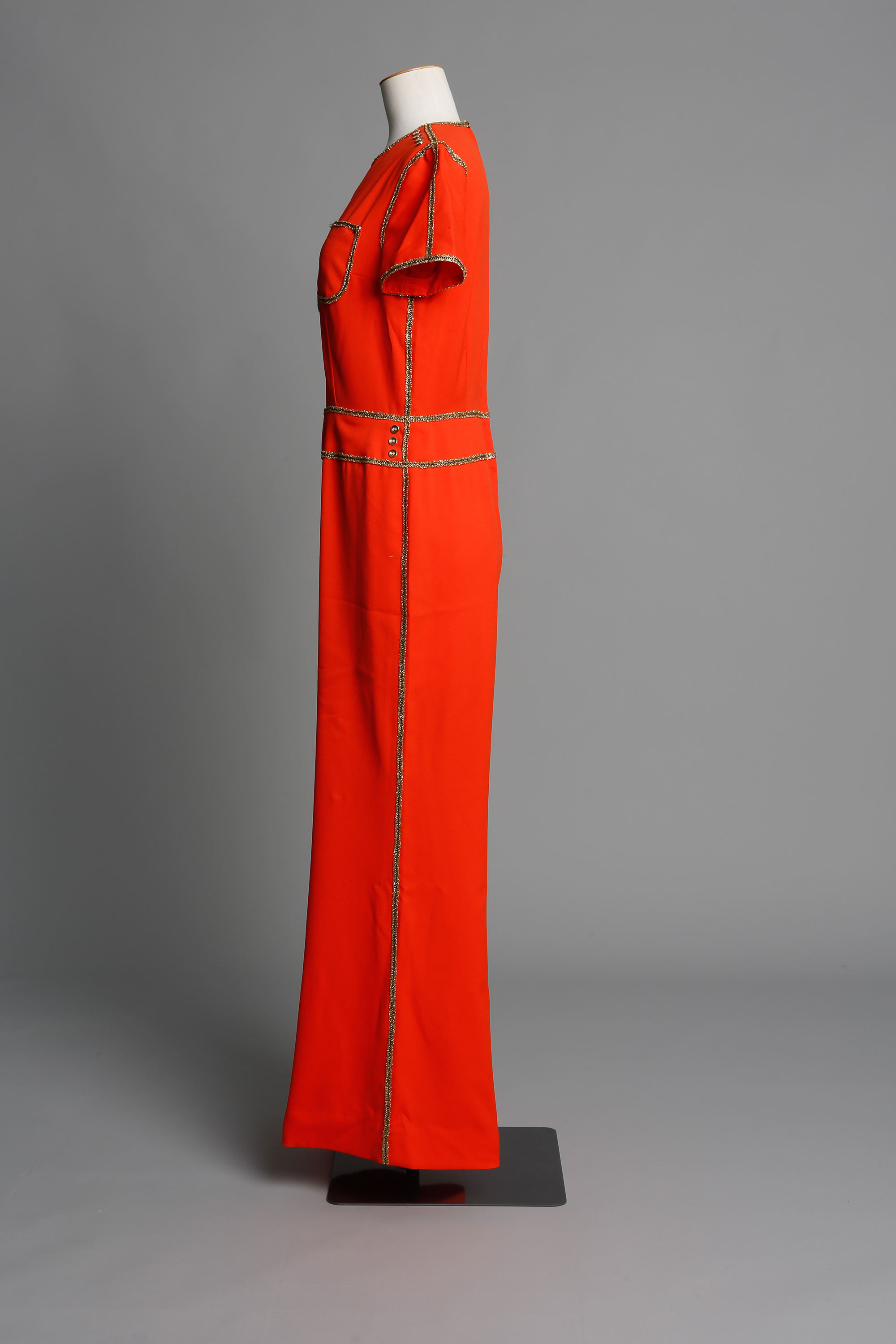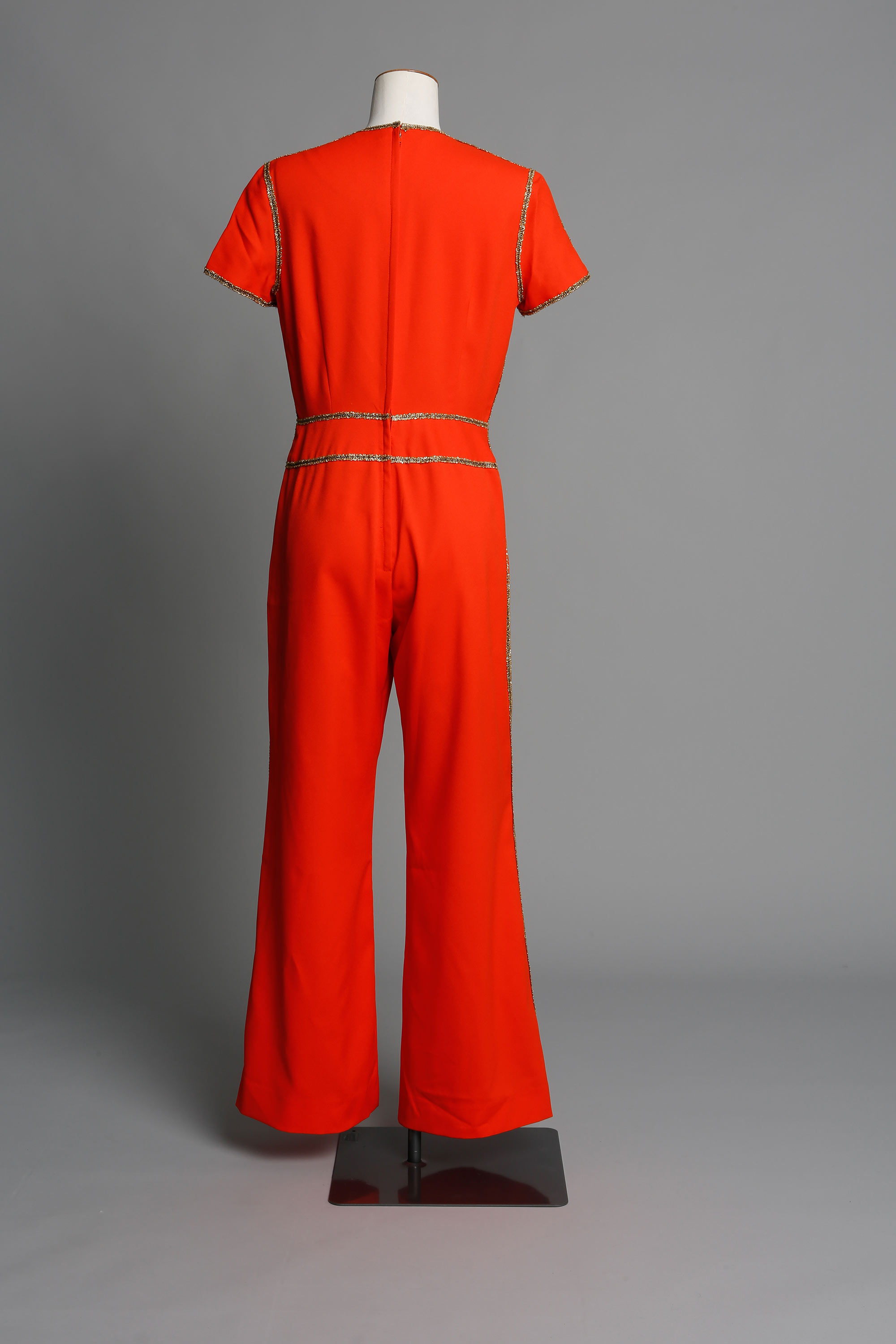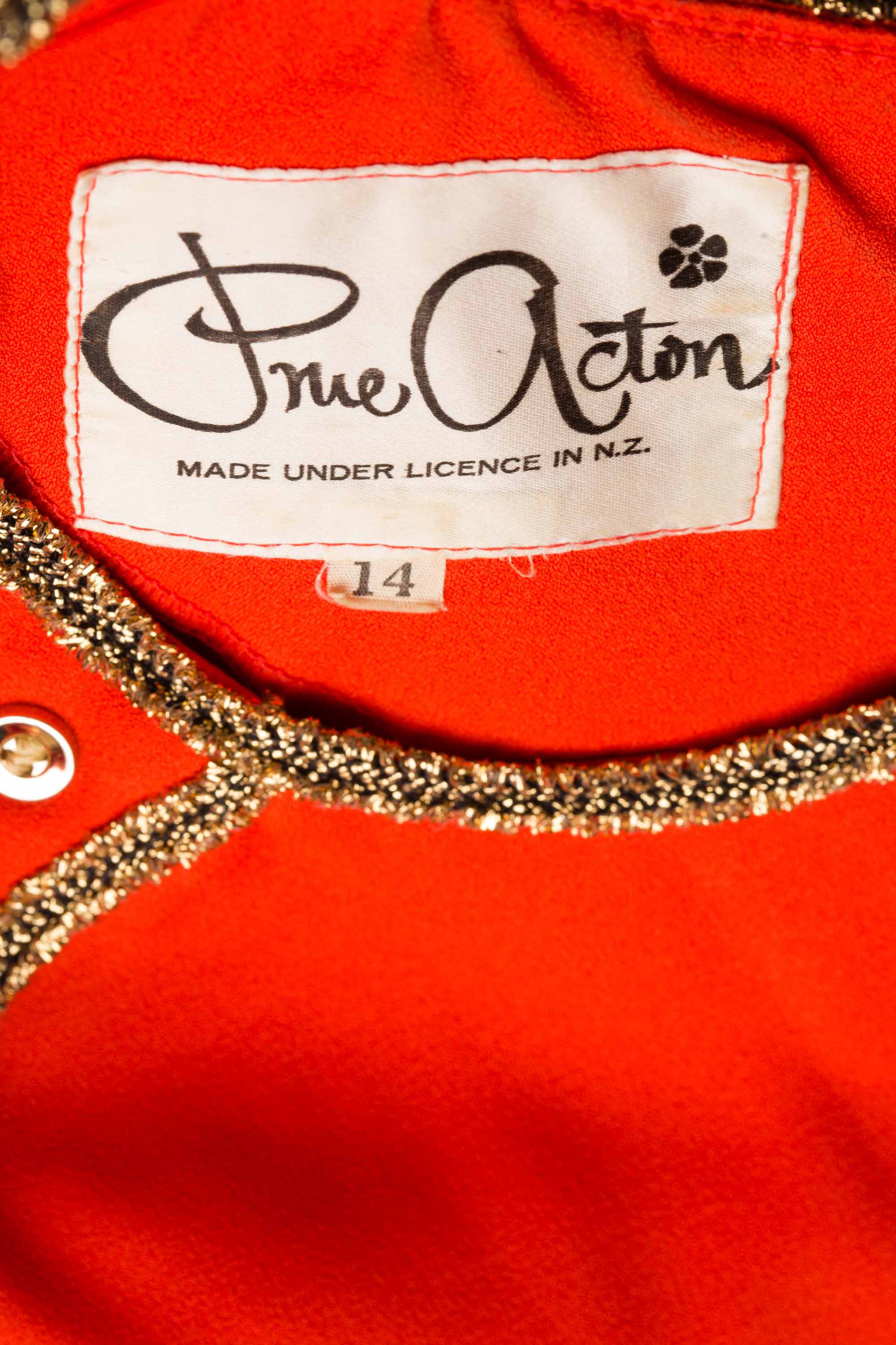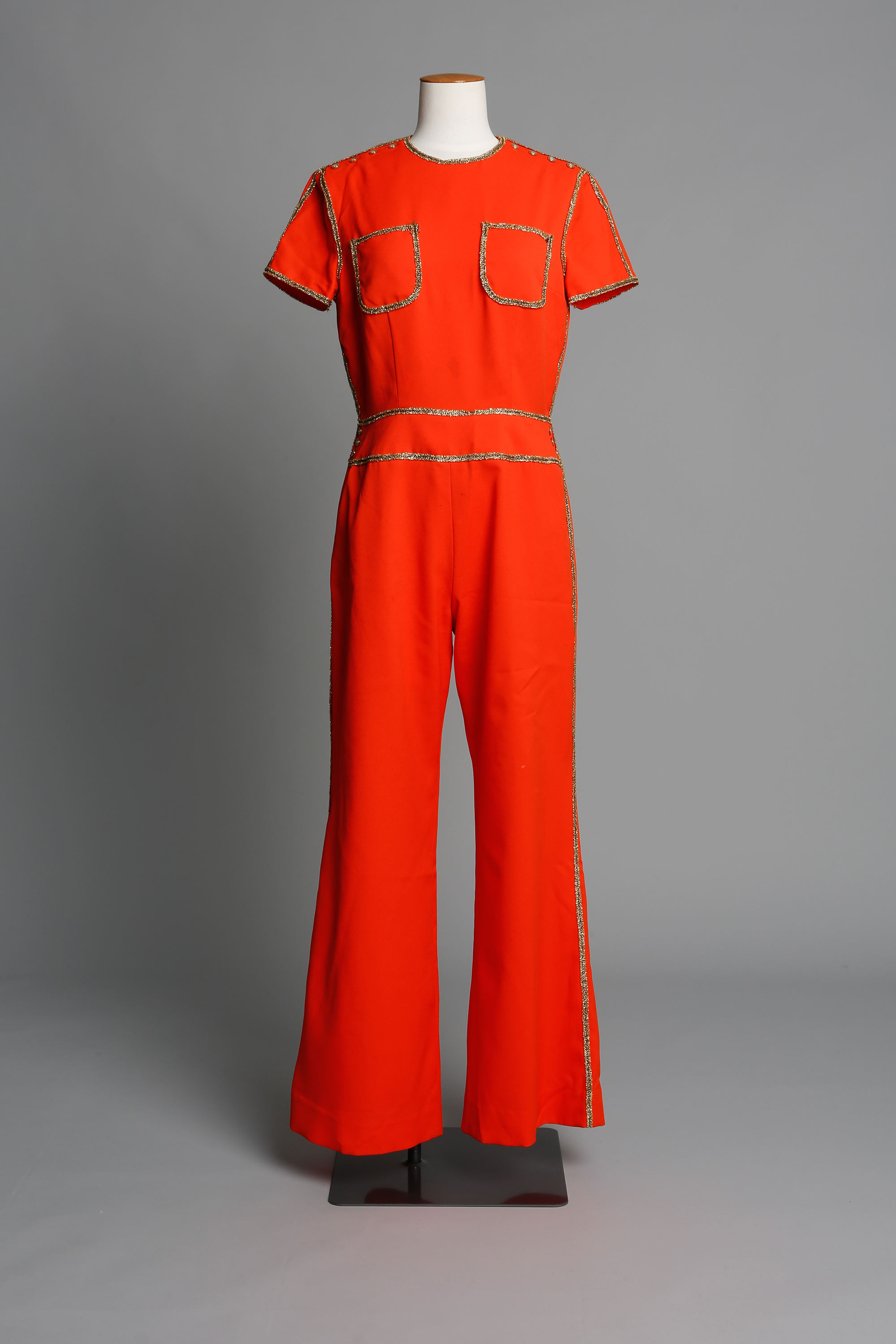 Prue Acton began her design career in a "cubby hole" in Flinders Lane in Melbourne, working with her mother to design and produce her first range. In 1965, New York department store, Lord and Taylor, put her garments on their racks where they "sold like the proverbial hot cakes" (Thursday magazine 1971). "A thousand garments were sold in the first week, and this was followed by a replacement order for 1500 a week later." Lord and Taylor also negotiated for the clothes to be made under licence in New York – the beginning of Prue's successful international design business. Prue Acton fashions were made under licence in New Zealand by F M Ritchie Ltd. This orange jumpsuit was typical of her designs, described by Thursday magazine as "well-cut high fashion garment(s) with a great deal of attention given to detail". Read more about 1970s fashion in the New Zealand Fashion Museum publication The Age of Aquarius: A 70s Revolution in Fashion.