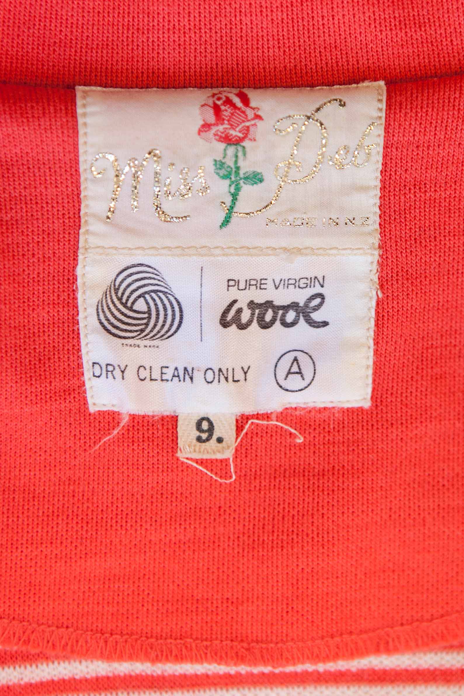 The fabric for this Miss Deb ensemble was manufactured in New Zealand. It featured a thin white stripe and came in three colours – orange, aqua and black.