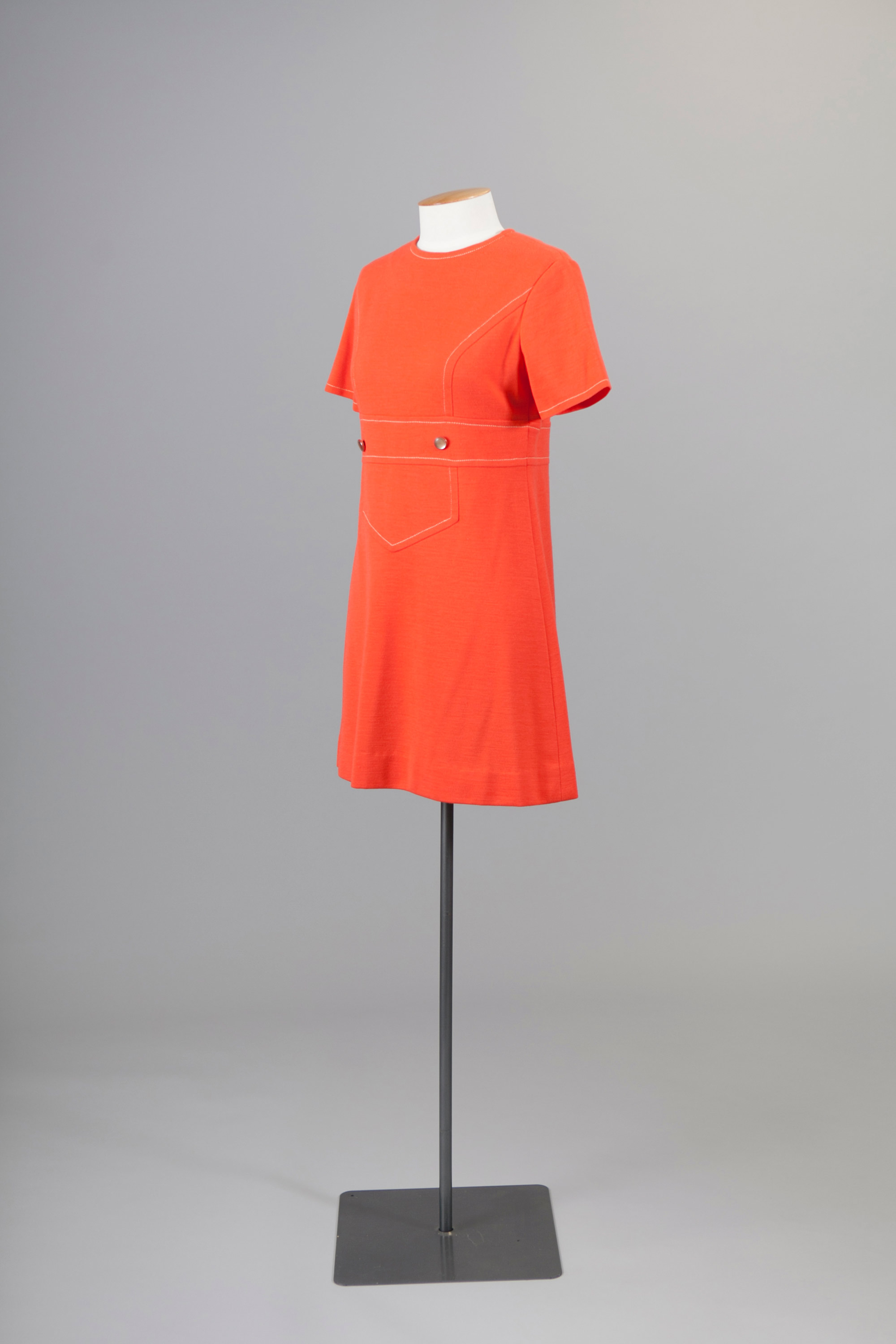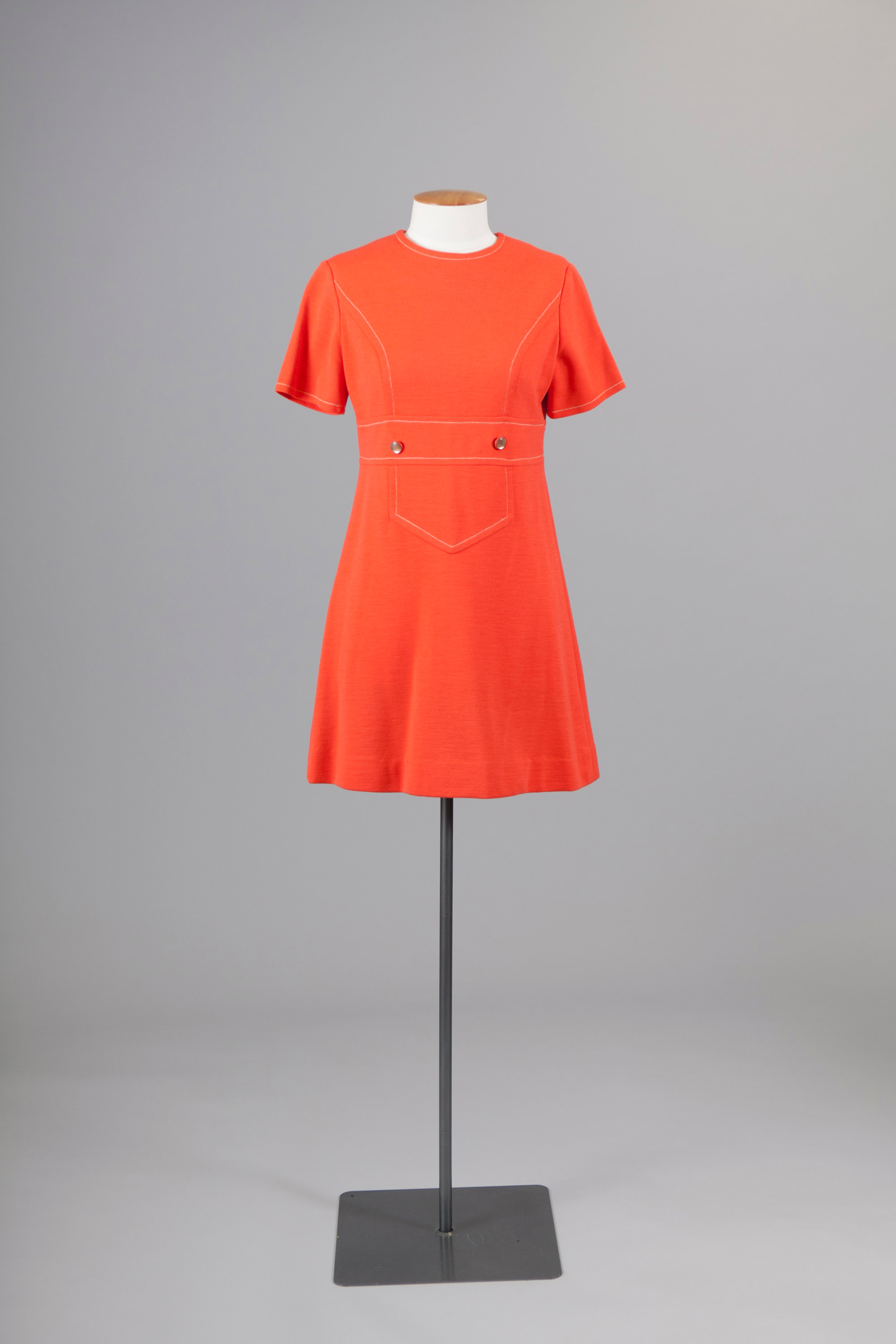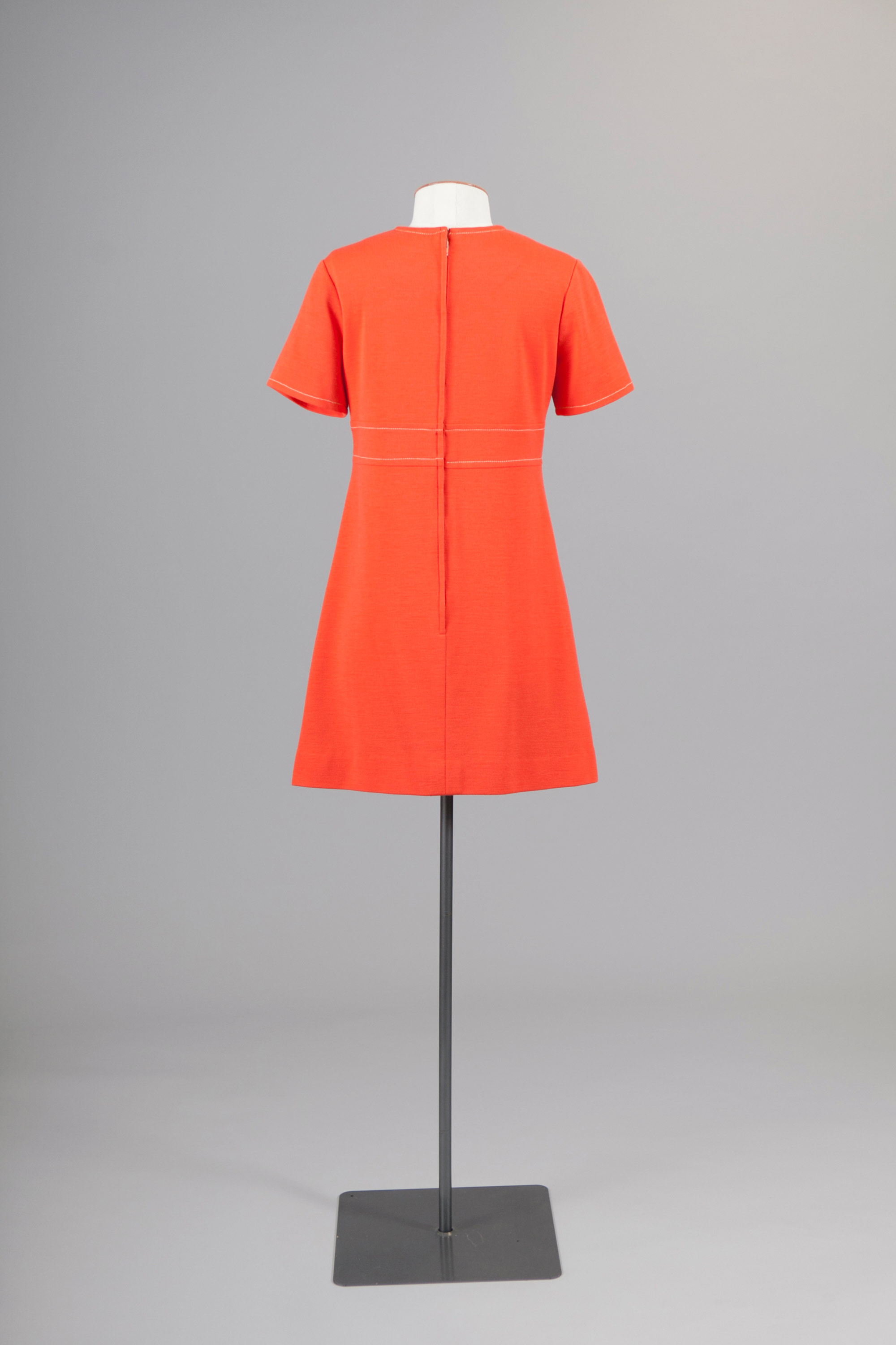 The coat and dress features topstitching that draws attention to the cut of the garments.