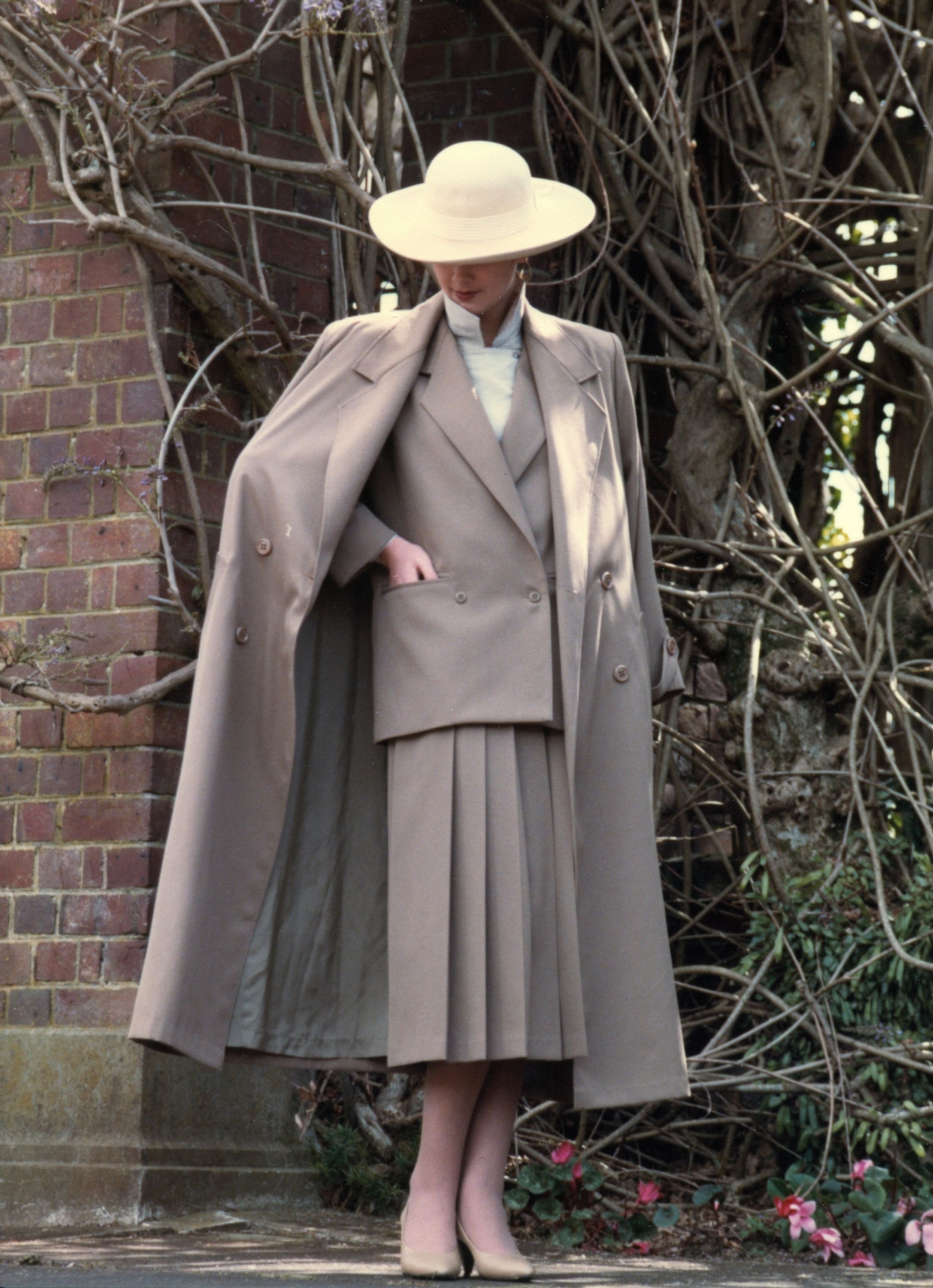 Overcoat and matching suit with double-breasted jacket and knife-pleated skirt