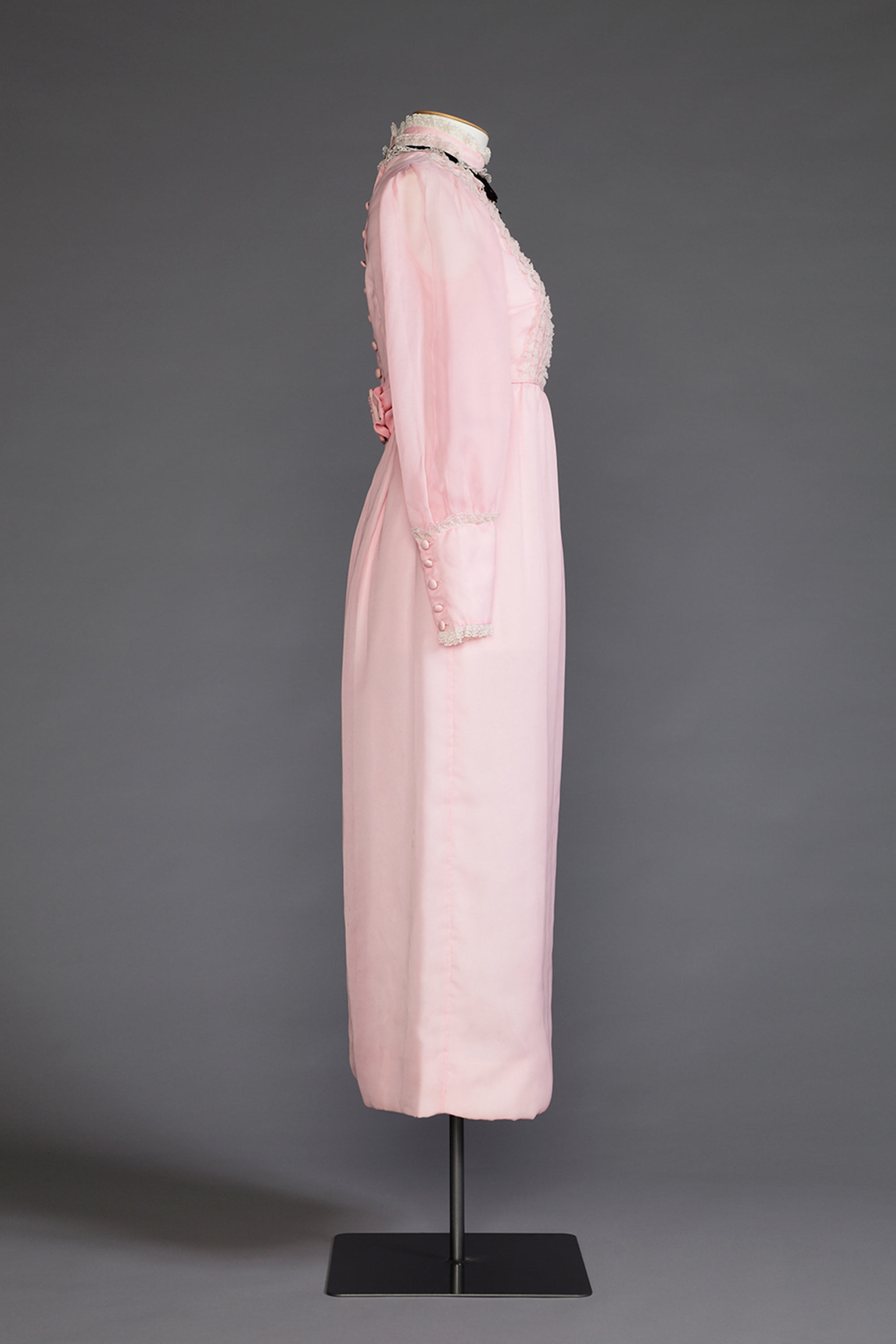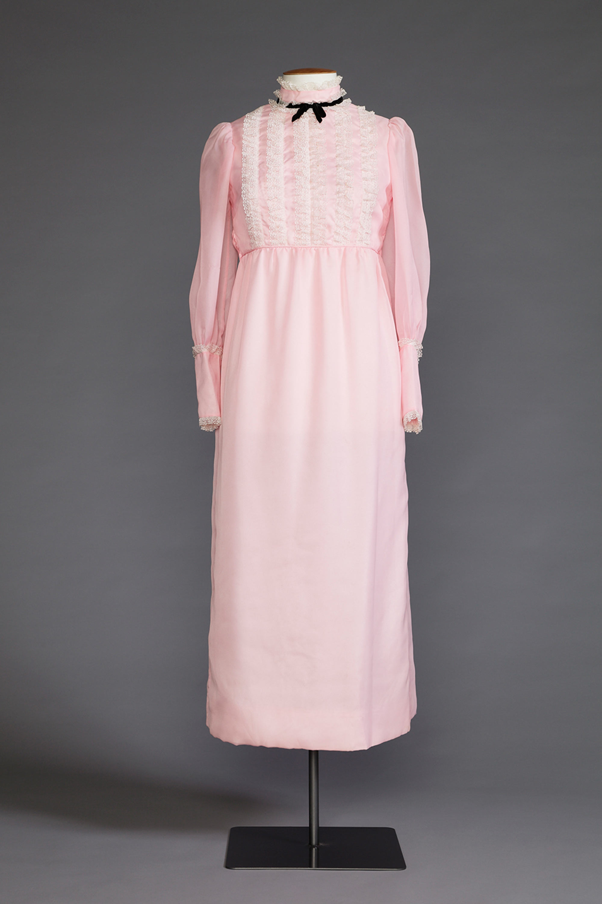 A confection of femininity; pale pink, detailed with hand covered buttons and belt, lengths of lace and a demure black velvet bow. The Victorian style, with full sleeves, deep cuffs and high neckline may seem unusual as we associate late 1960s fashion with