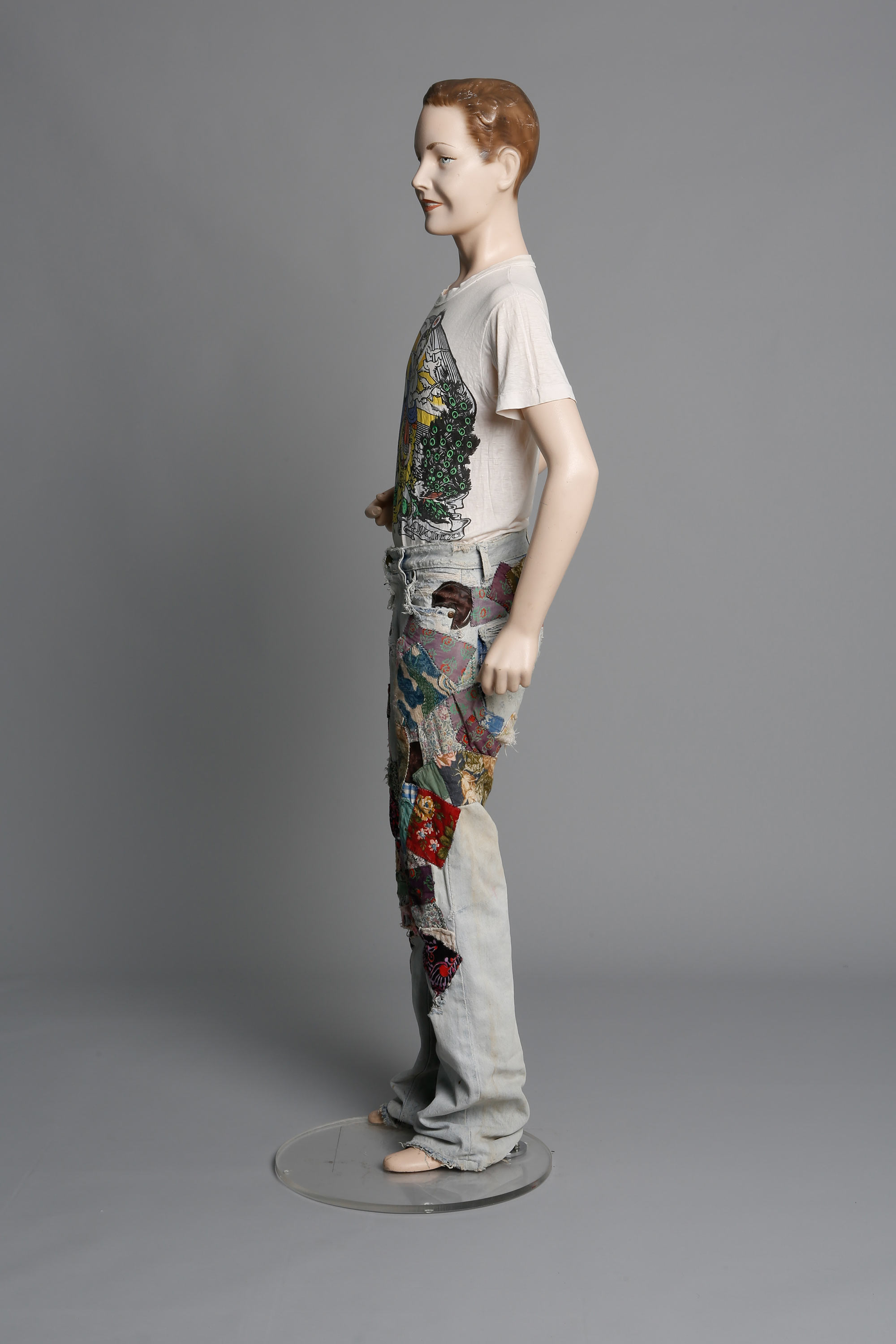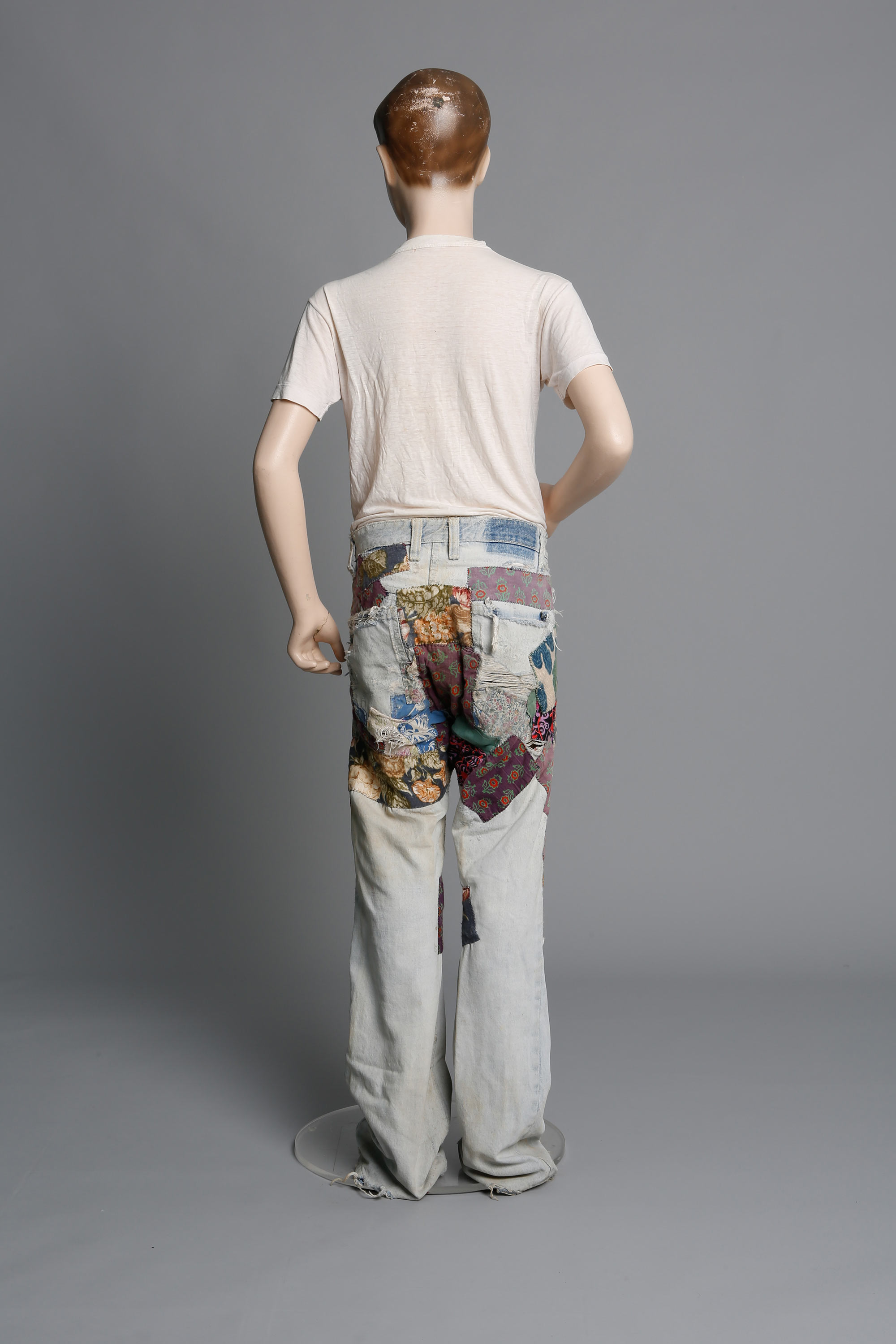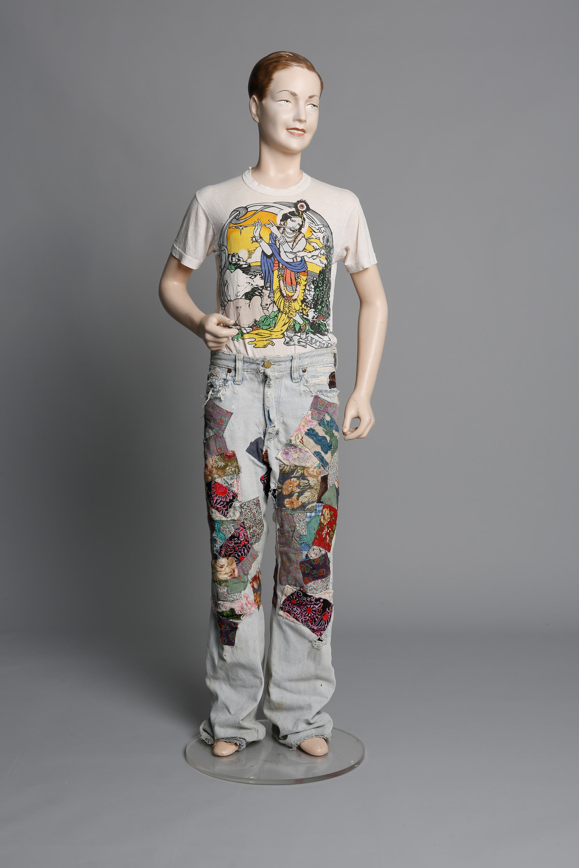 Glen’s mother taught him to sew. He was the only one interested out of her three children. Glen sewed all the patches on the jeans himself - breaking a few needles in the process as he pulled things around a bit in the narrow knee part of the leg. "Some of the fabric is old Indian cloth and other patches are old material from home and around – anything with a pattern." The jeans are Amco. "I only wore Amco for about 20 years. They have always had their factory down Rosebank Road and are still in the Harbourside Biz Park off Rosebank Road." Glen worked on the Hare Krishna stand at the Cook Street Market in about 1973. "They used to import and sell all kinds of things – sand candles, embroidered Indian shirts, incense and other things. I was always hanging out and around Cook Street – either selling or buying or going to the Christmas parties." He also used to work at the Sun Shop on Queen Street where he thinks the Krishna t-shirts were printed. Read more about 1970s fashion in the New Zealand Fashion Museum publication The Age of Aquarius: A 70s Revolution in Fashion.