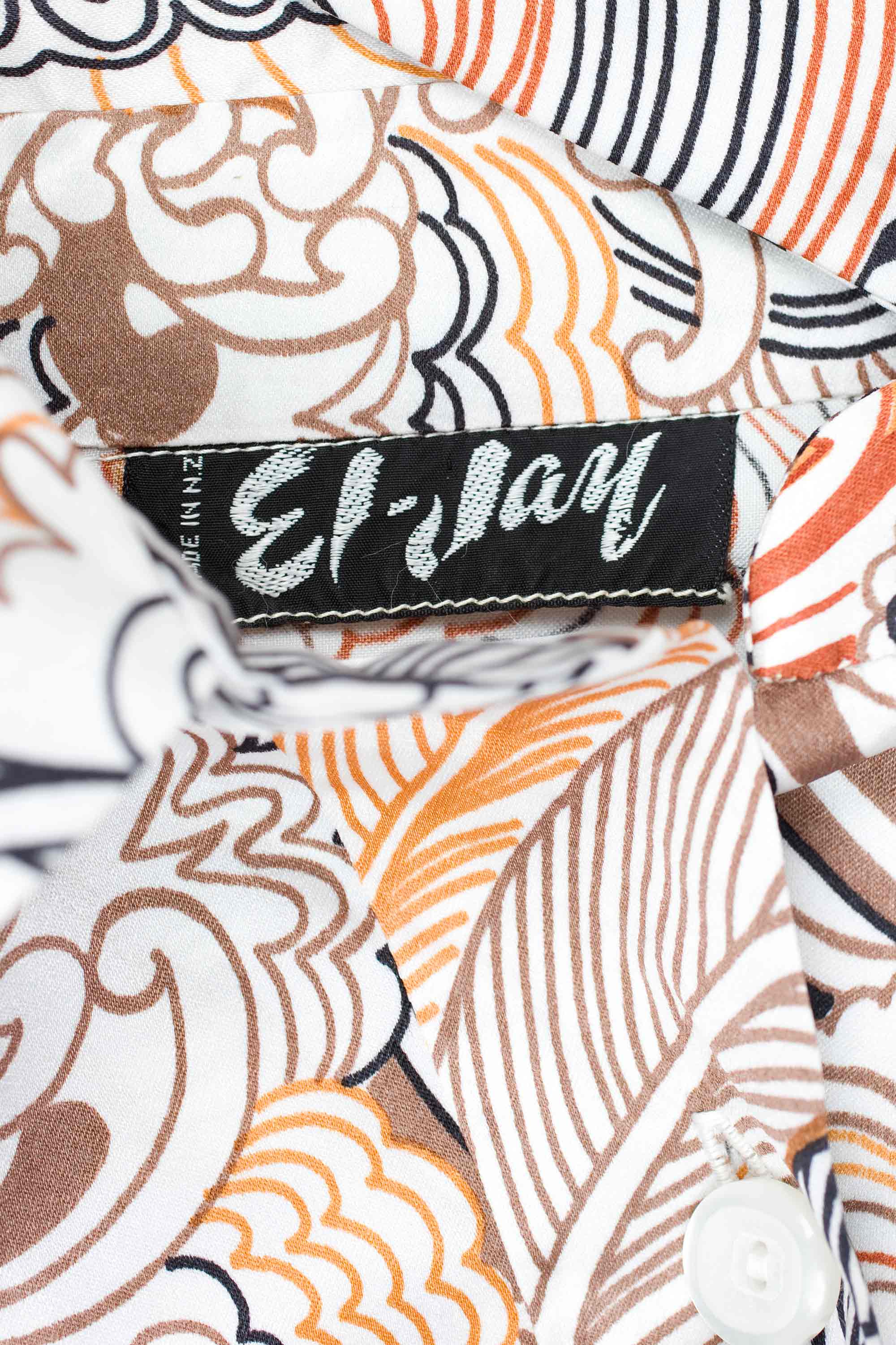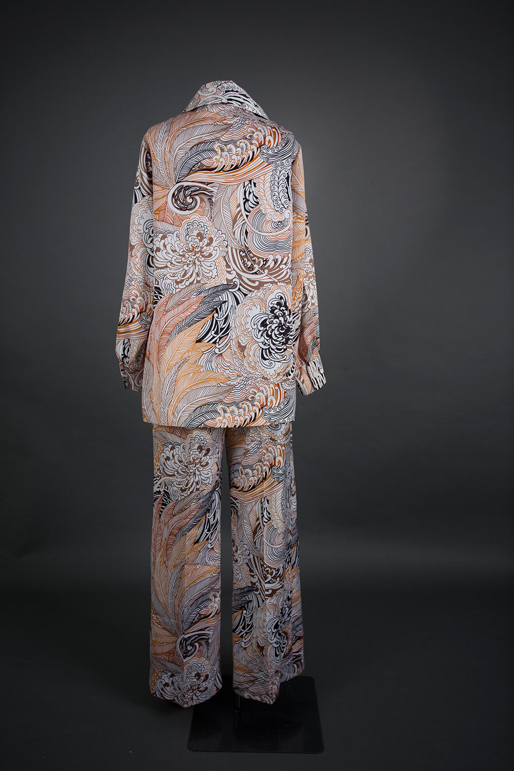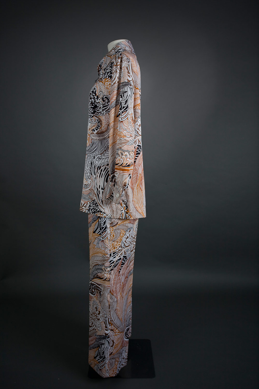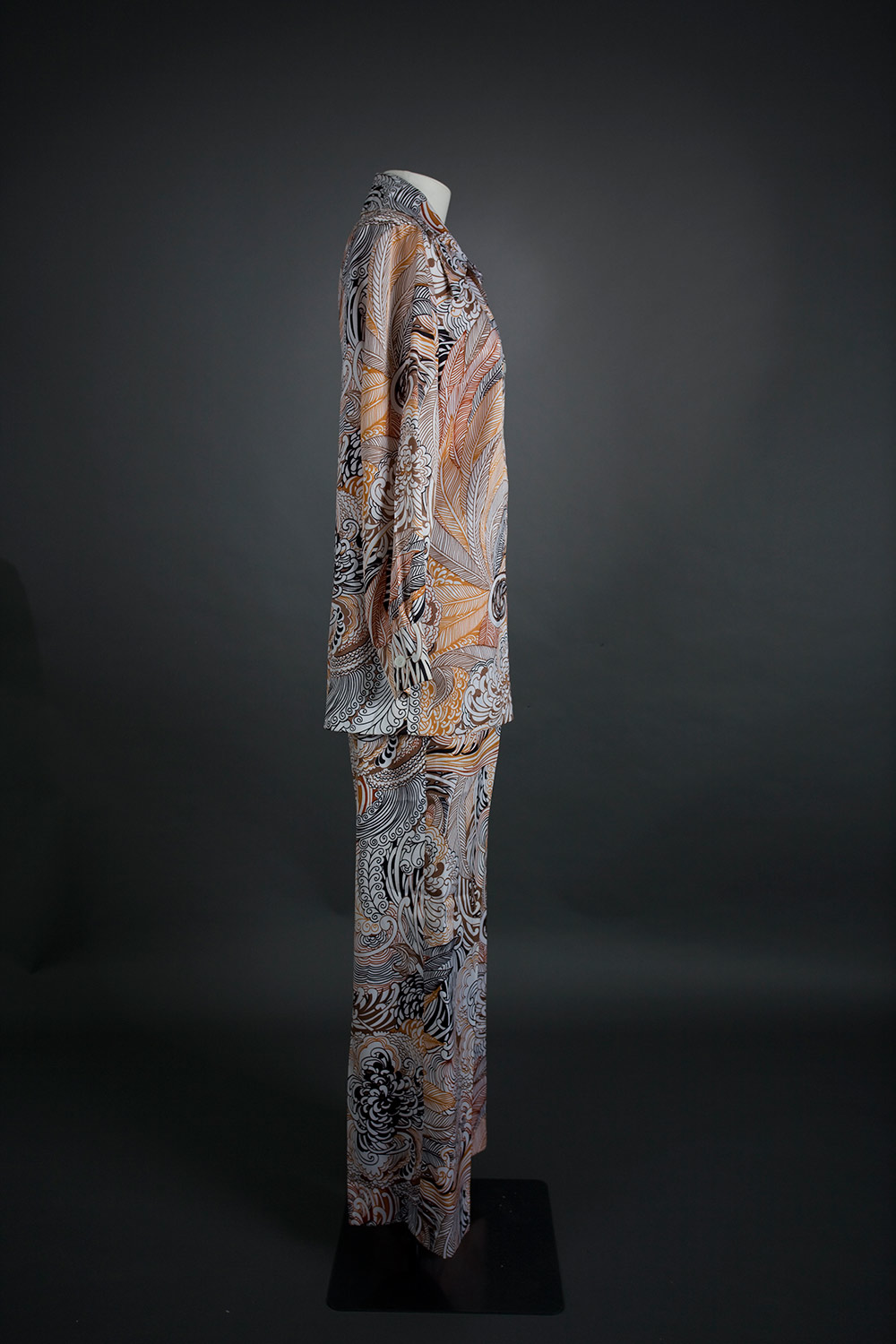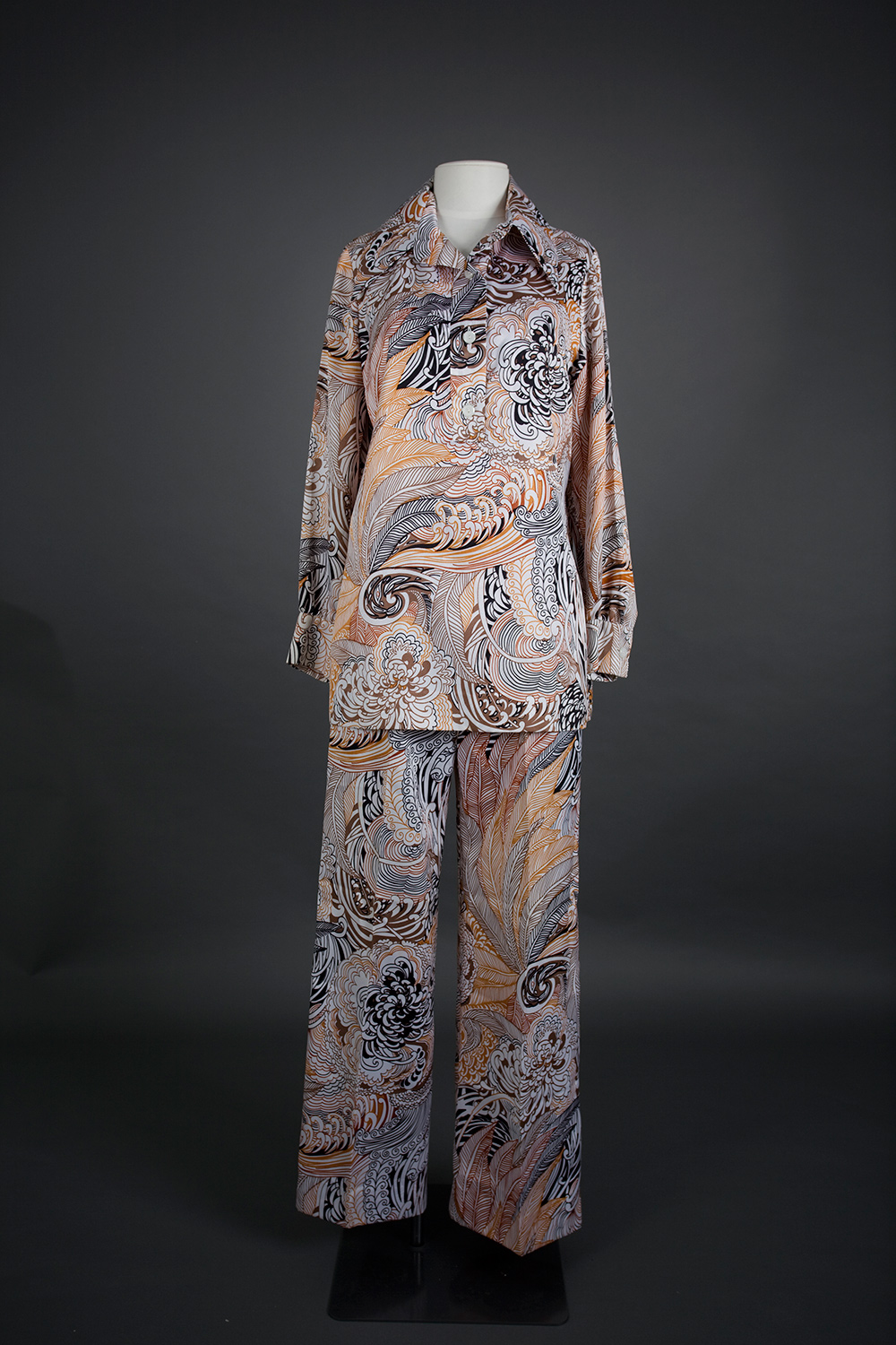 The relaxed cut of the trousers and the long line tunic were designed with comfort in mind and were appropriate attire when entertaining at home. Read more about Gus Fisher and the El Jay label in the New Zealand Fashion Museum publication Looking Terrific: The story of El Jay.