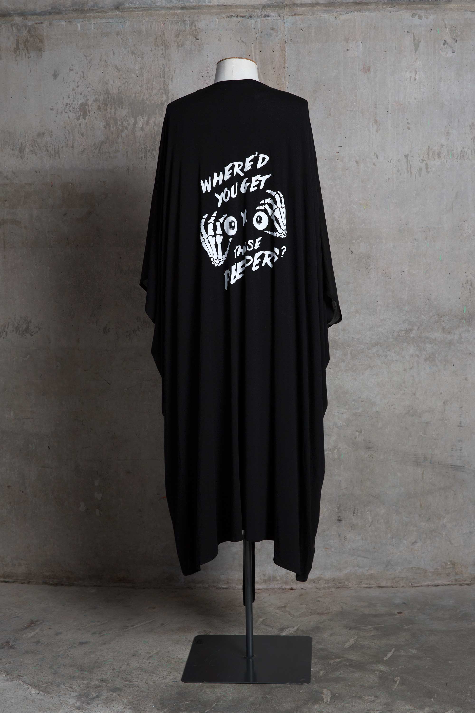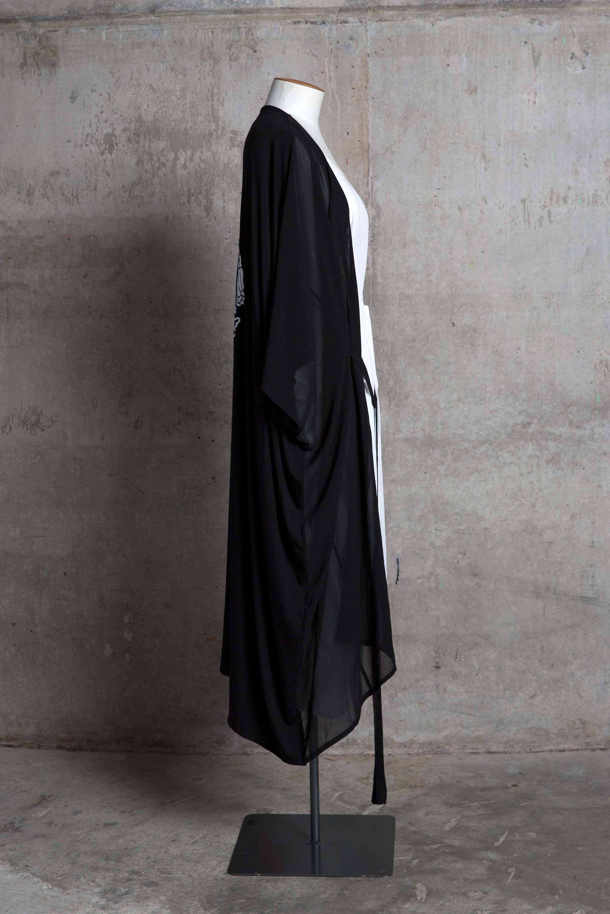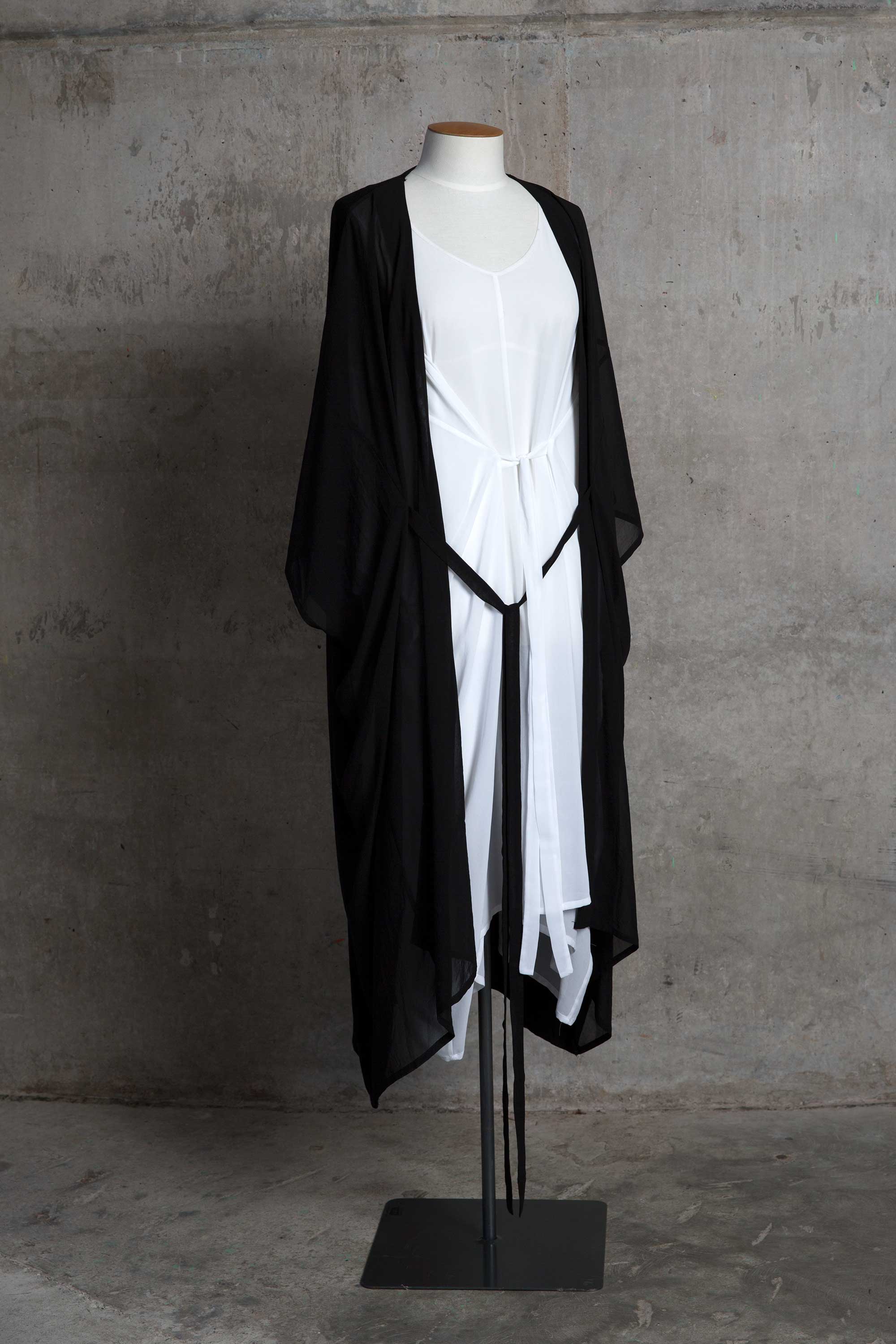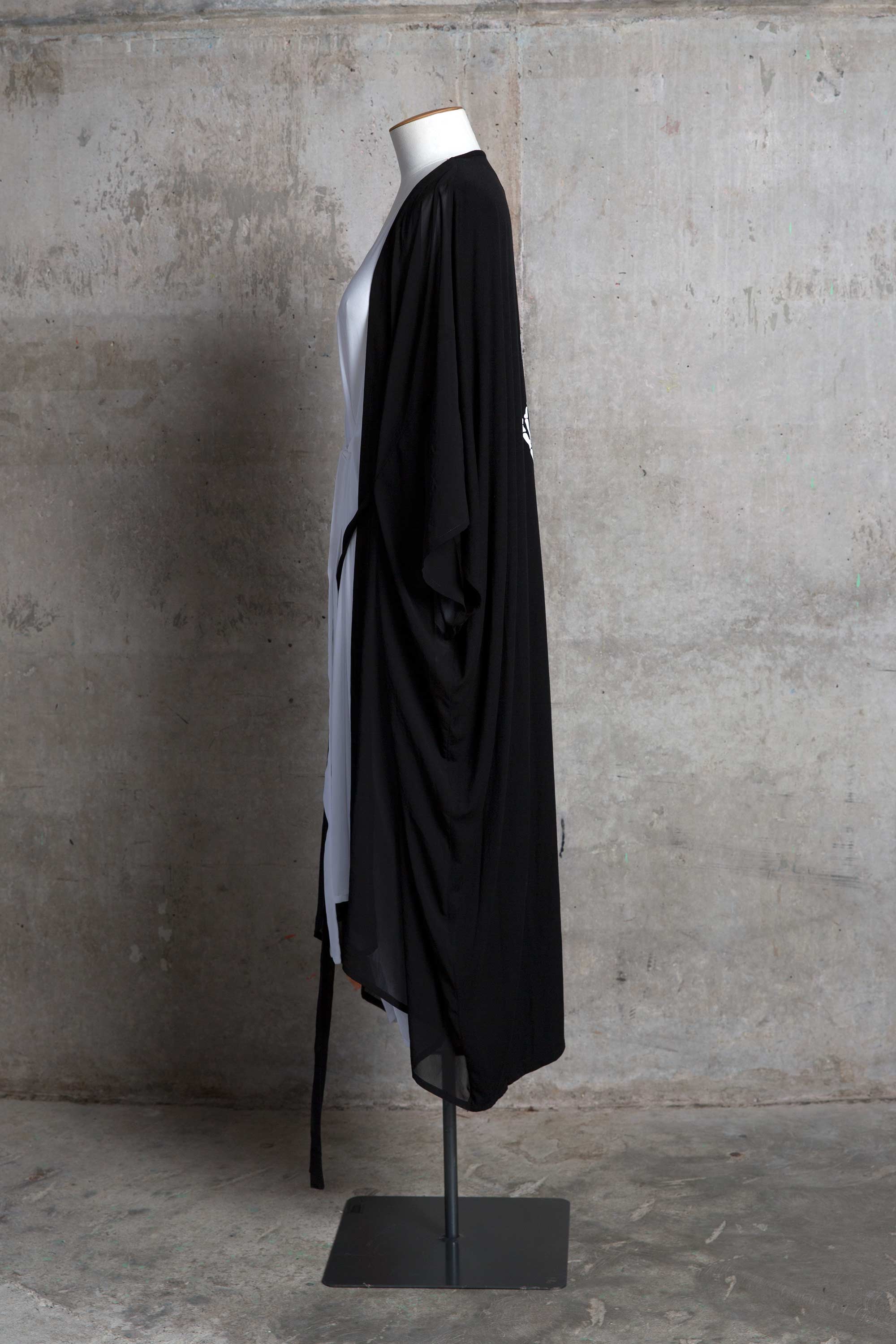 This ensemble is typical of Maaike with its black and white colour schemeĀ and draped, printed-over layers.
