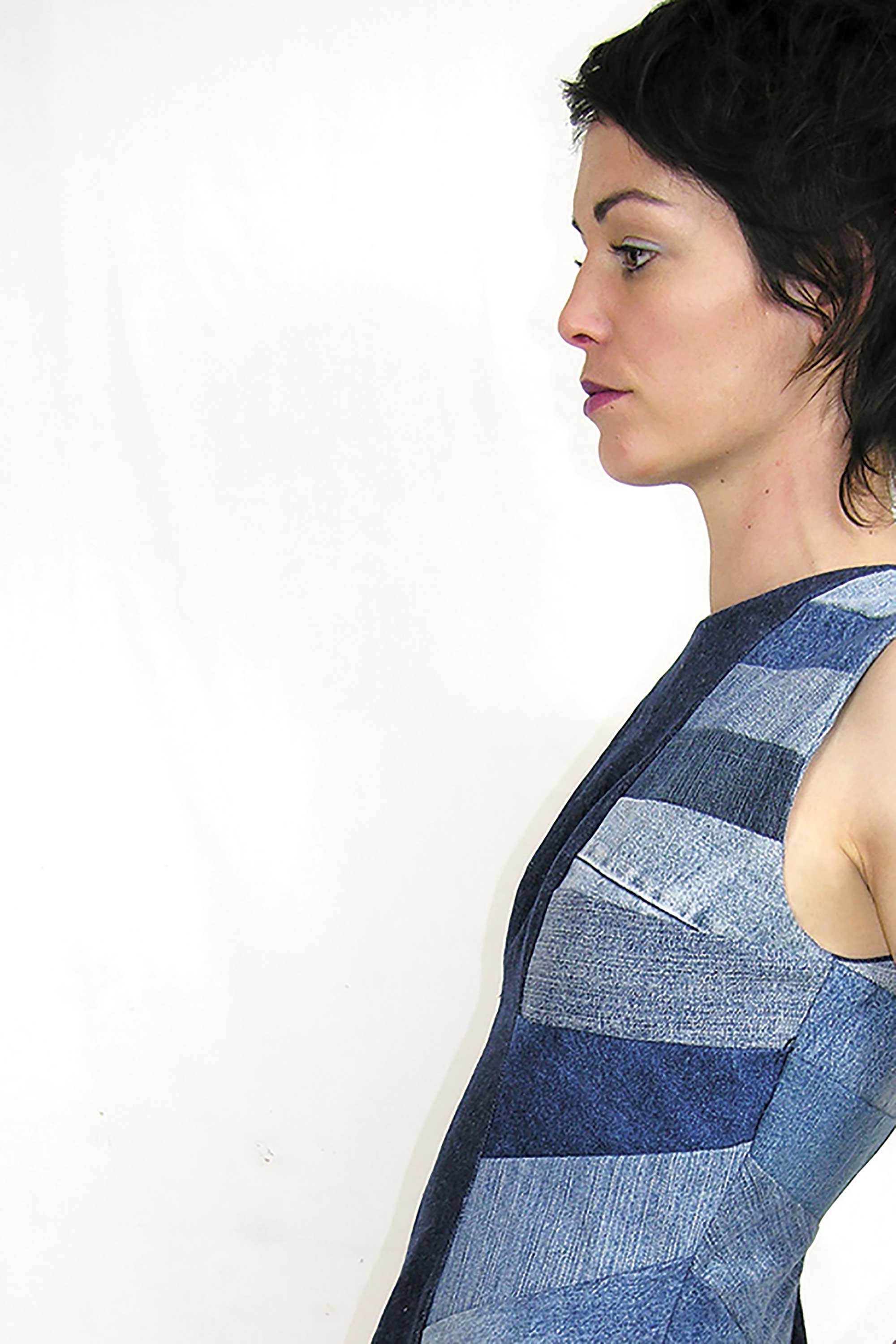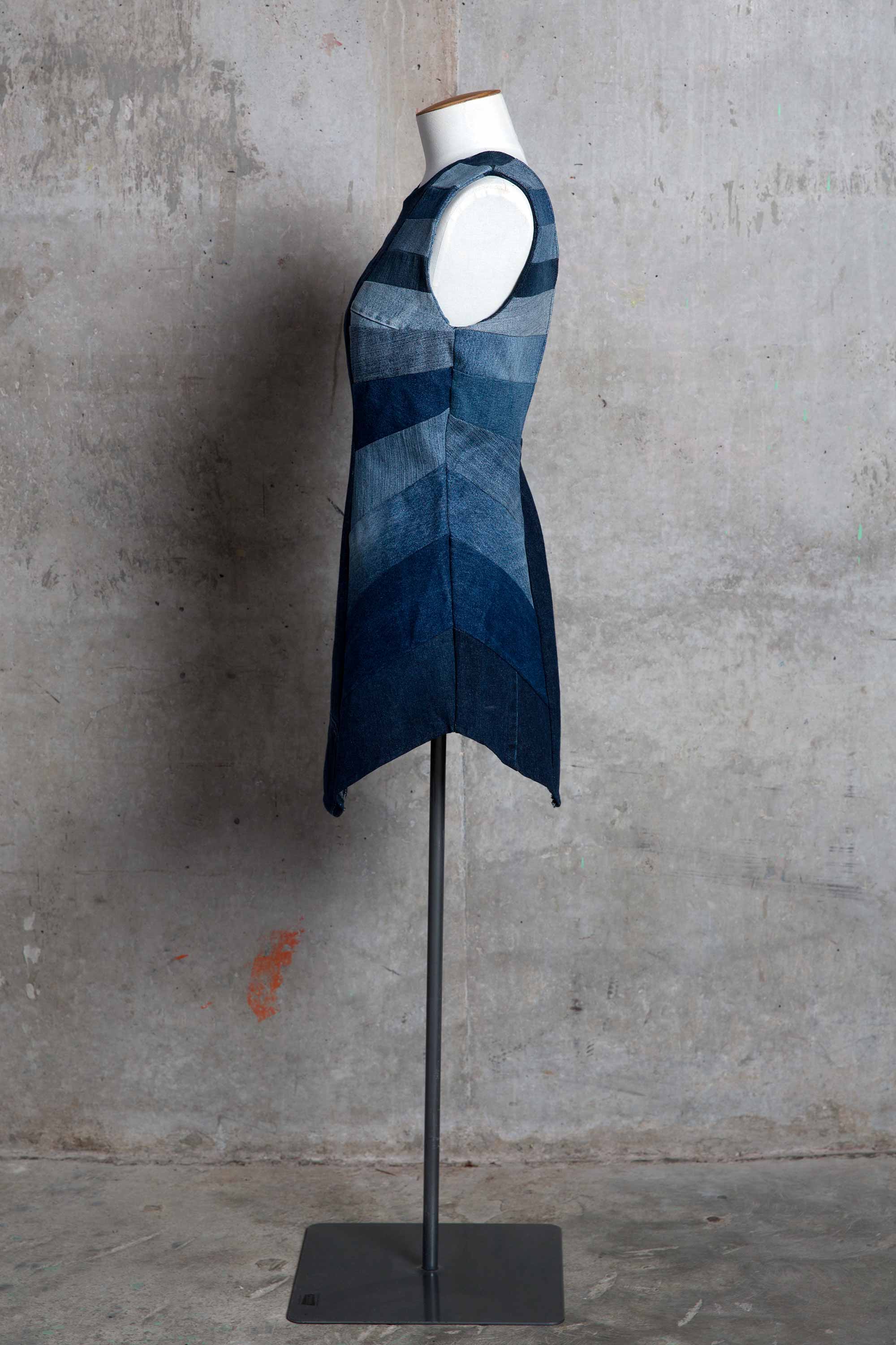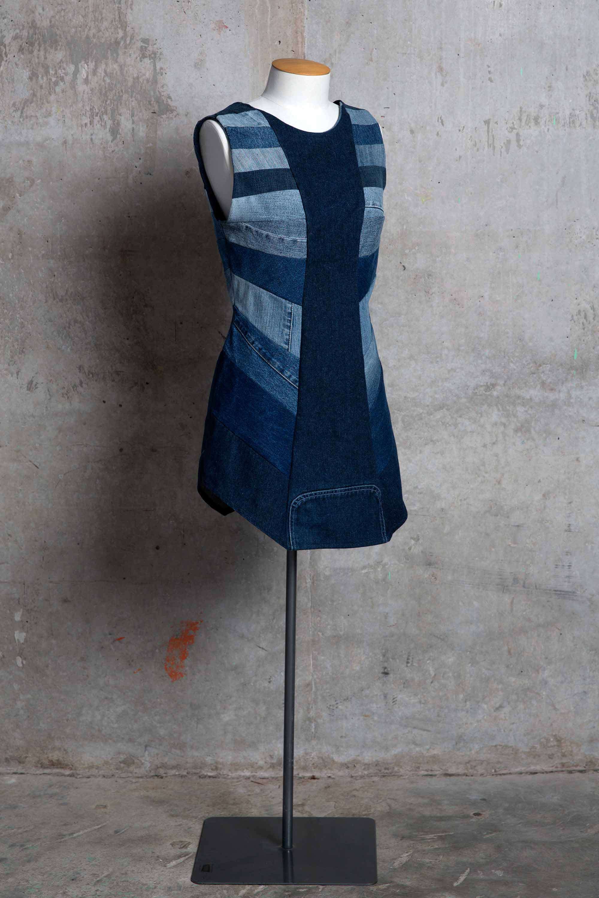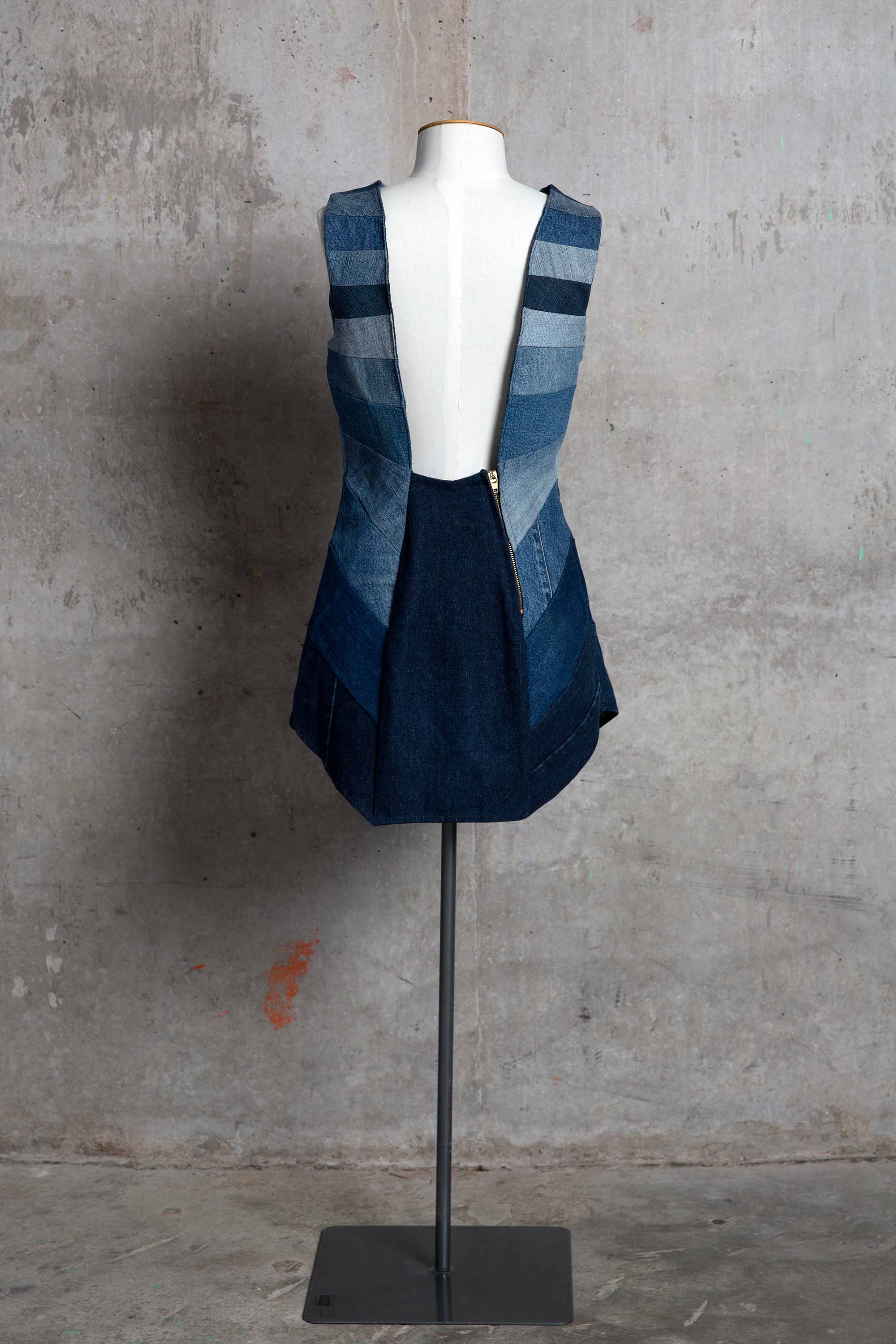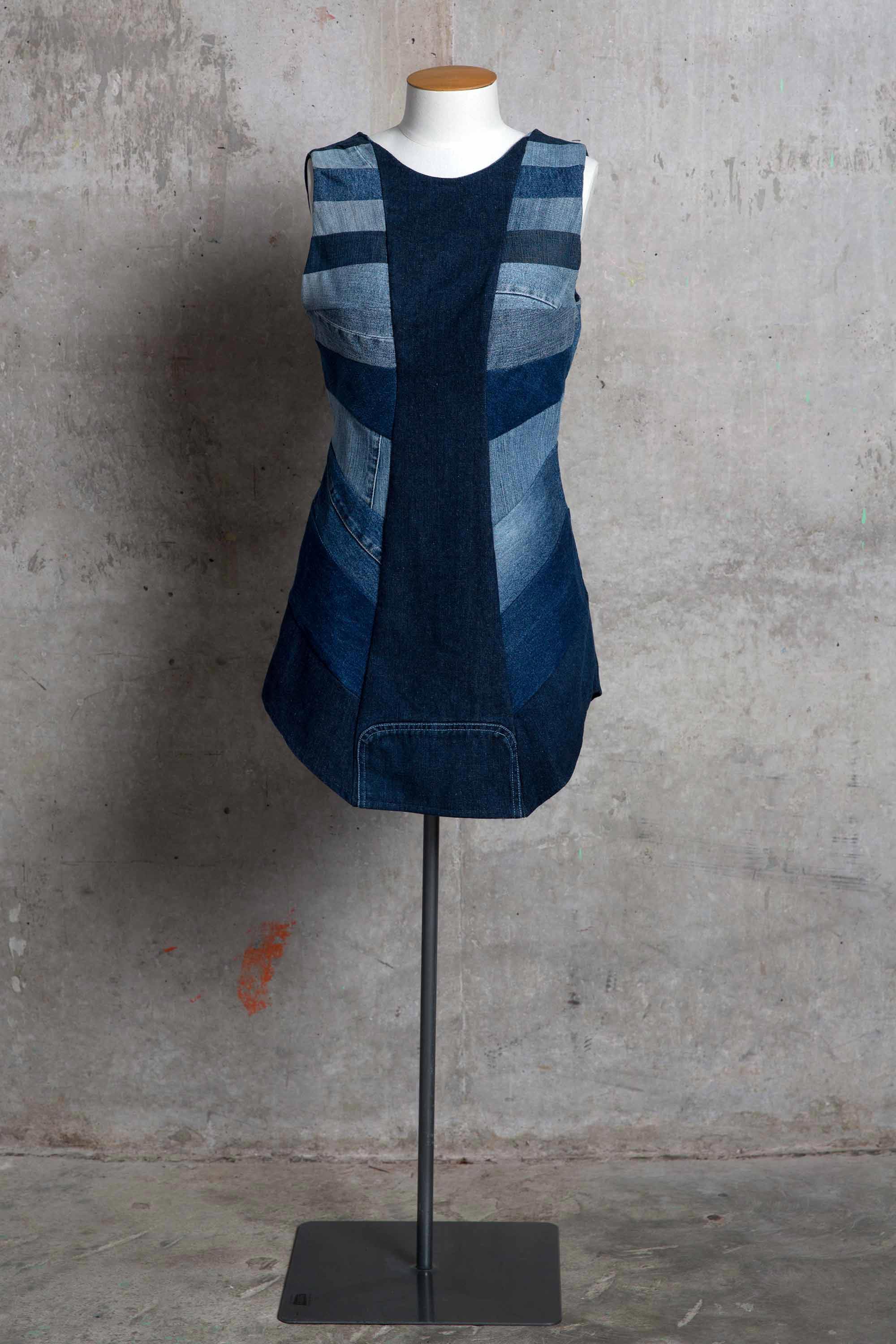 Melanie Child was inspired to make this dress from preloved denim after learning of the volume of pre and post consumer textile waste that goes into landfill each year. "Denim jeans are one of the most mass produced items of clothing and I wanted to reflect this with the multiple panels graduating in hue down the dress." Melanie wanted to demonstrate how much of a resource remains in preloved and discarded clothing, that high end clothing can be made from what many people consider as waste or worthless.