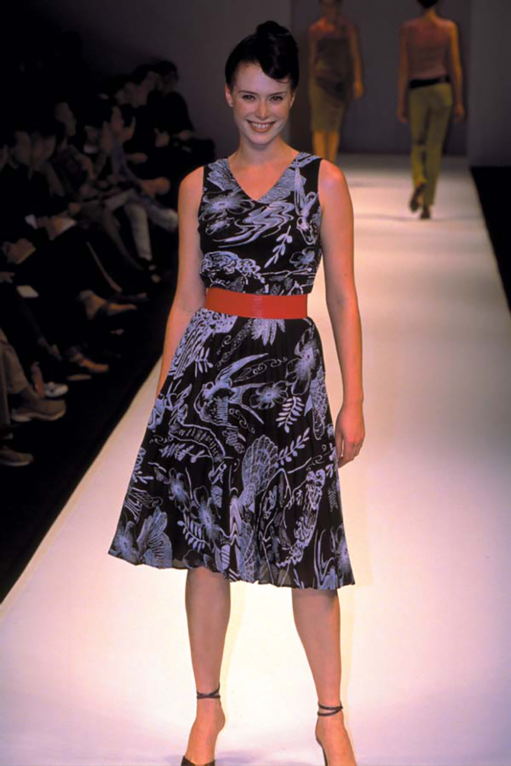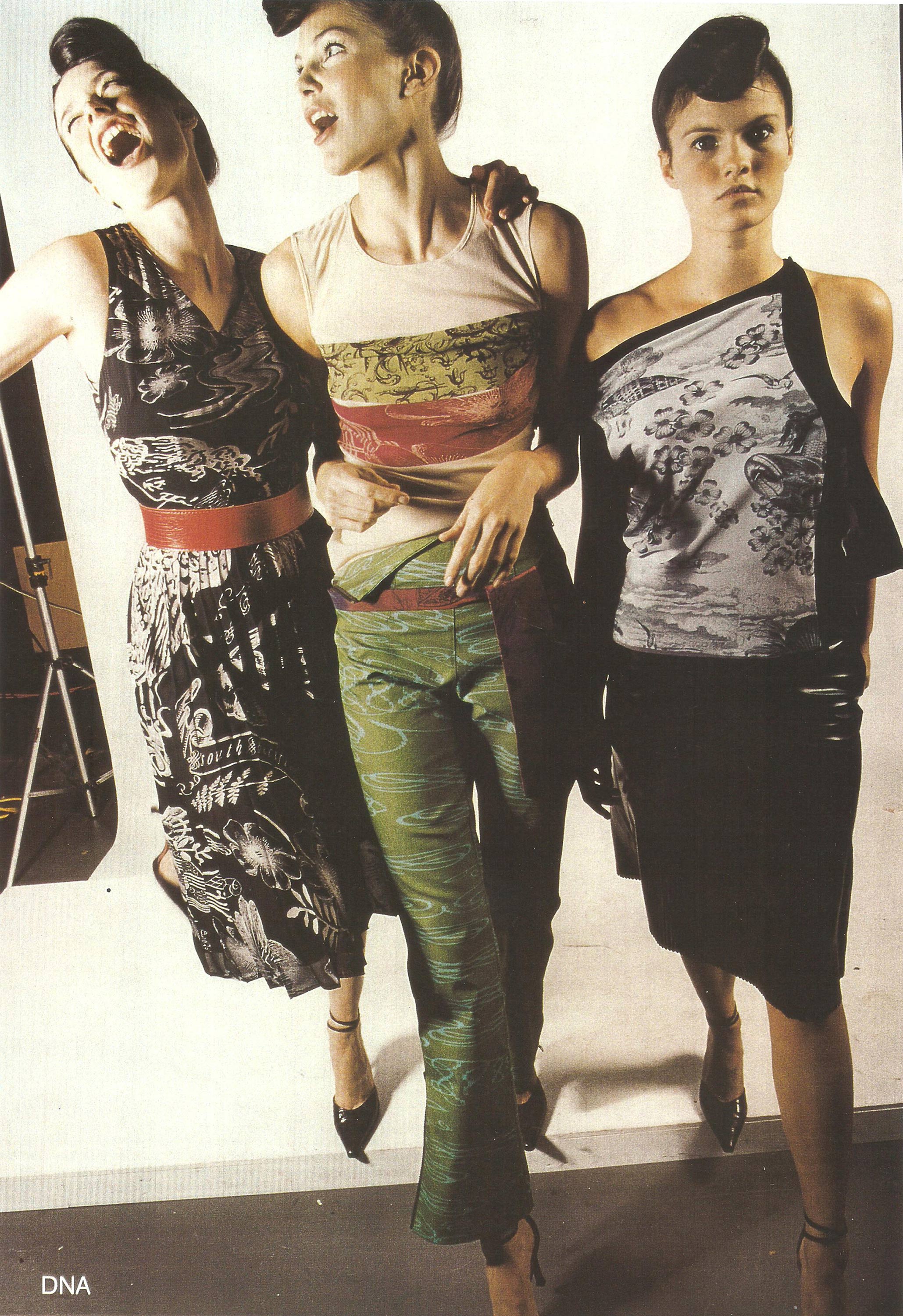 "Slightly suburban, slightly antipodean, hugely nostalgic ..." - DNA's summer 2001/2002 collection, South Pacific Rhapsody, was influenced by cake tin pictures of native New Zealand tui birds, gingham dressed tea-room girls and PVC-clad milkboy cowboys. The DNA label was started by Doris de Pont and Adrienne Foote in 1994. Their first collection established the basic motifs of their collaboration: fashion-forward garment shapes, unique collaged screenprinted fabrics that often combined classical statuary and botanical or other scientific engravings, and a limited but flexible colour palette. Alice Rycroft styled the collection for Australian Fashion Week.