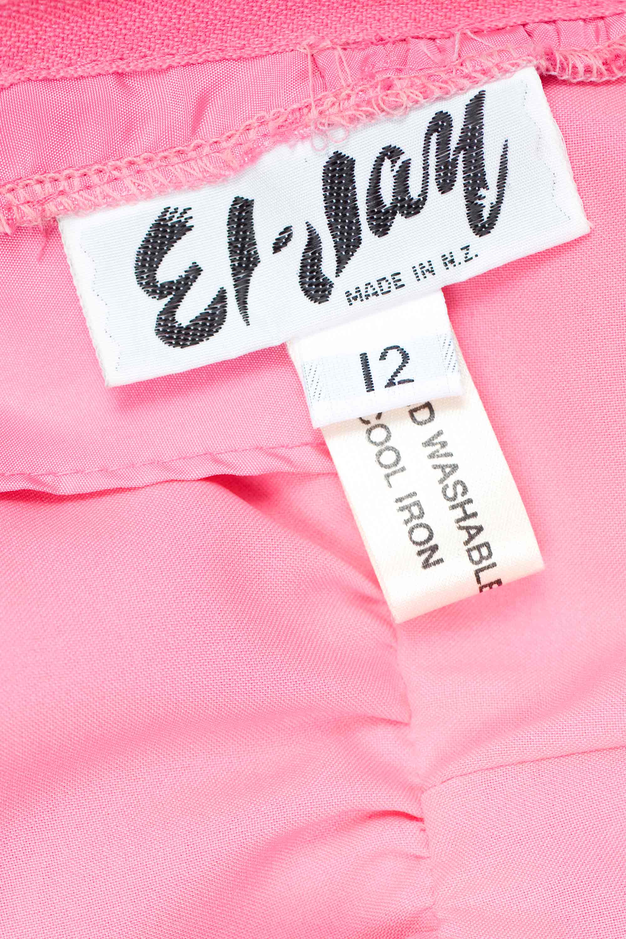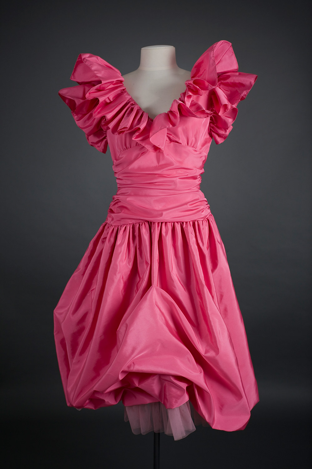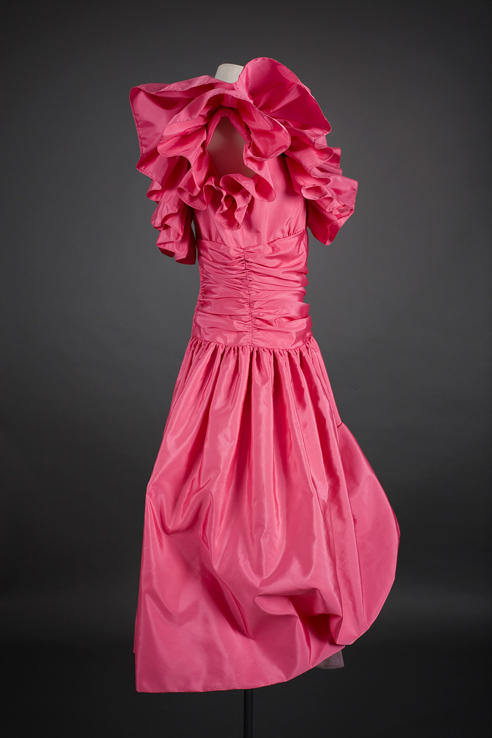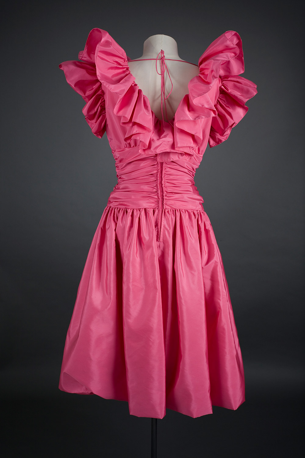 The ruching, flamboyant ruffles and frills of this dress are typical features of a mid to late 1980s party dress. It should be worn with big hair and big earrings. Read more about Gus Fisher and the El Jay label in the New Zealand Fashion Museum publication Looking Terrific: The story of El Jay.