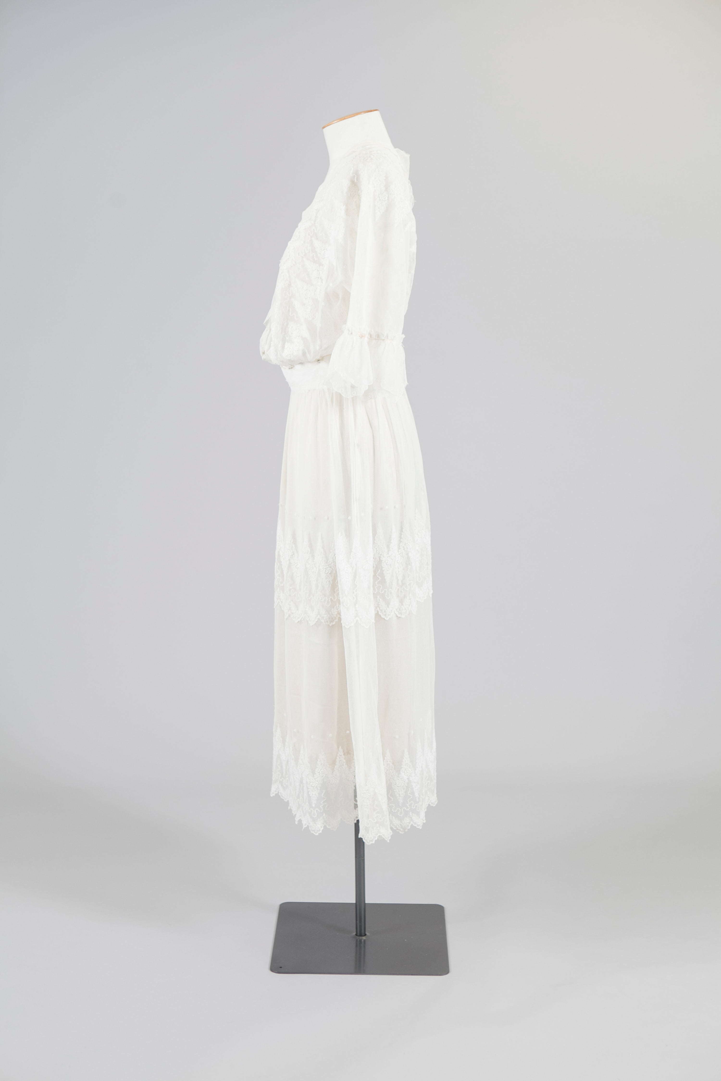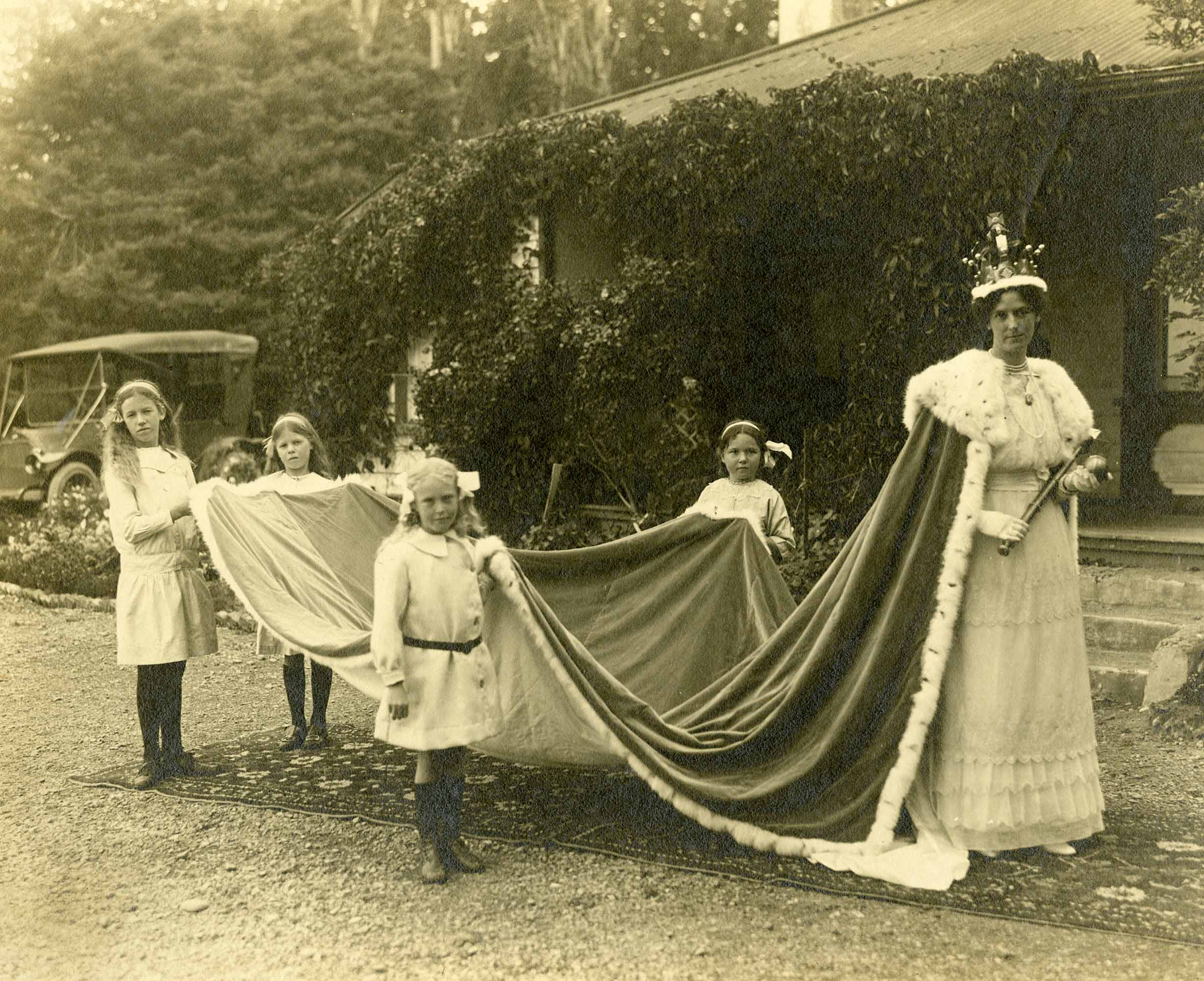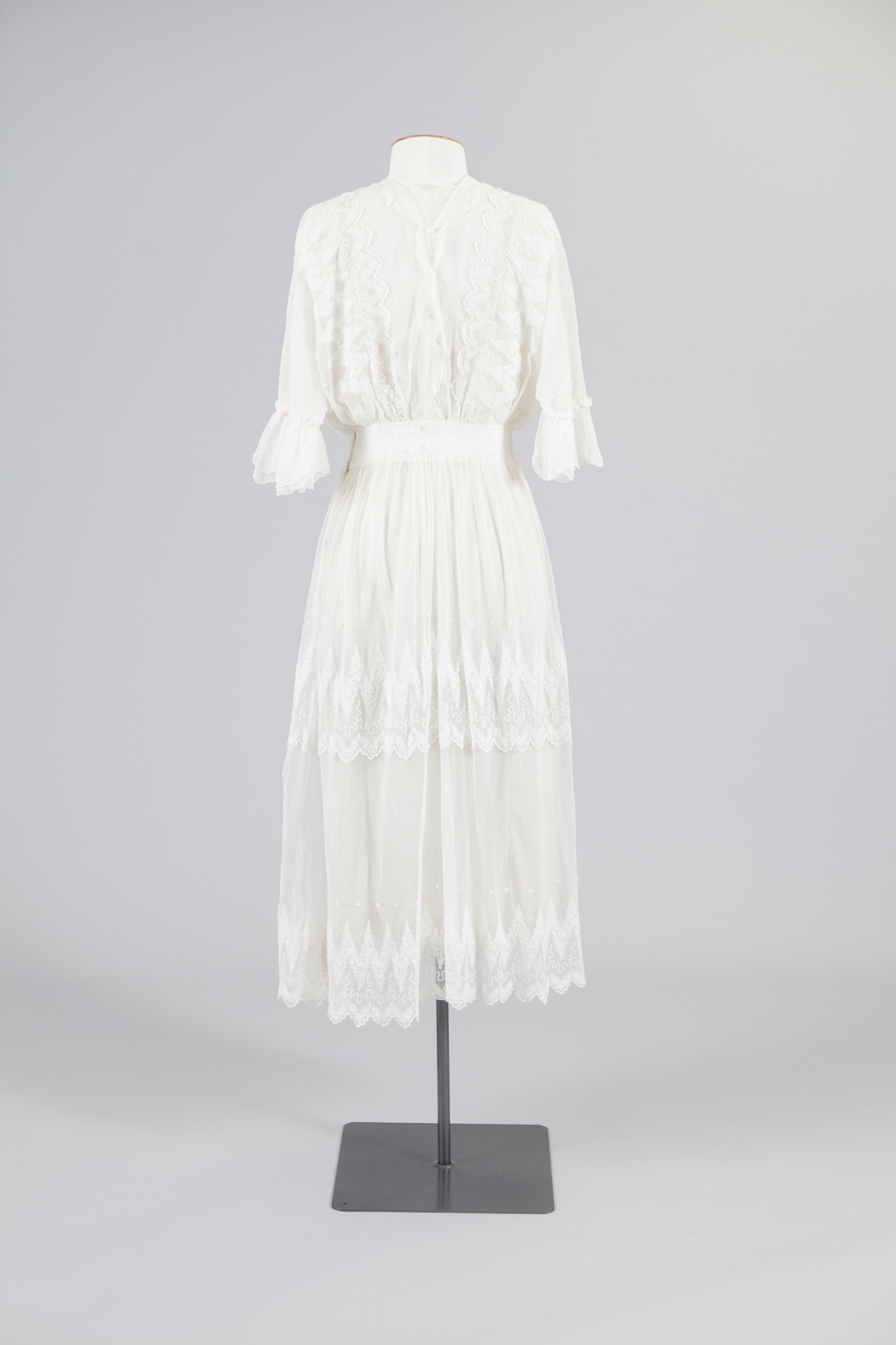 This dress was worn by the winner of the Queens Carnival in Timaru in 1915. The dress was full-length in 1915 – it has since been shortened to reflect changing fashions in hem length. Queens Carnivals were held throughout New Zealand to raise funds for war related causes, such as support for wounded soldiers who were returning home. In addition to talent shows, fancy dress and sporting fixtures, women competed to be Queen. The winner was coronated at the end of the carnival.