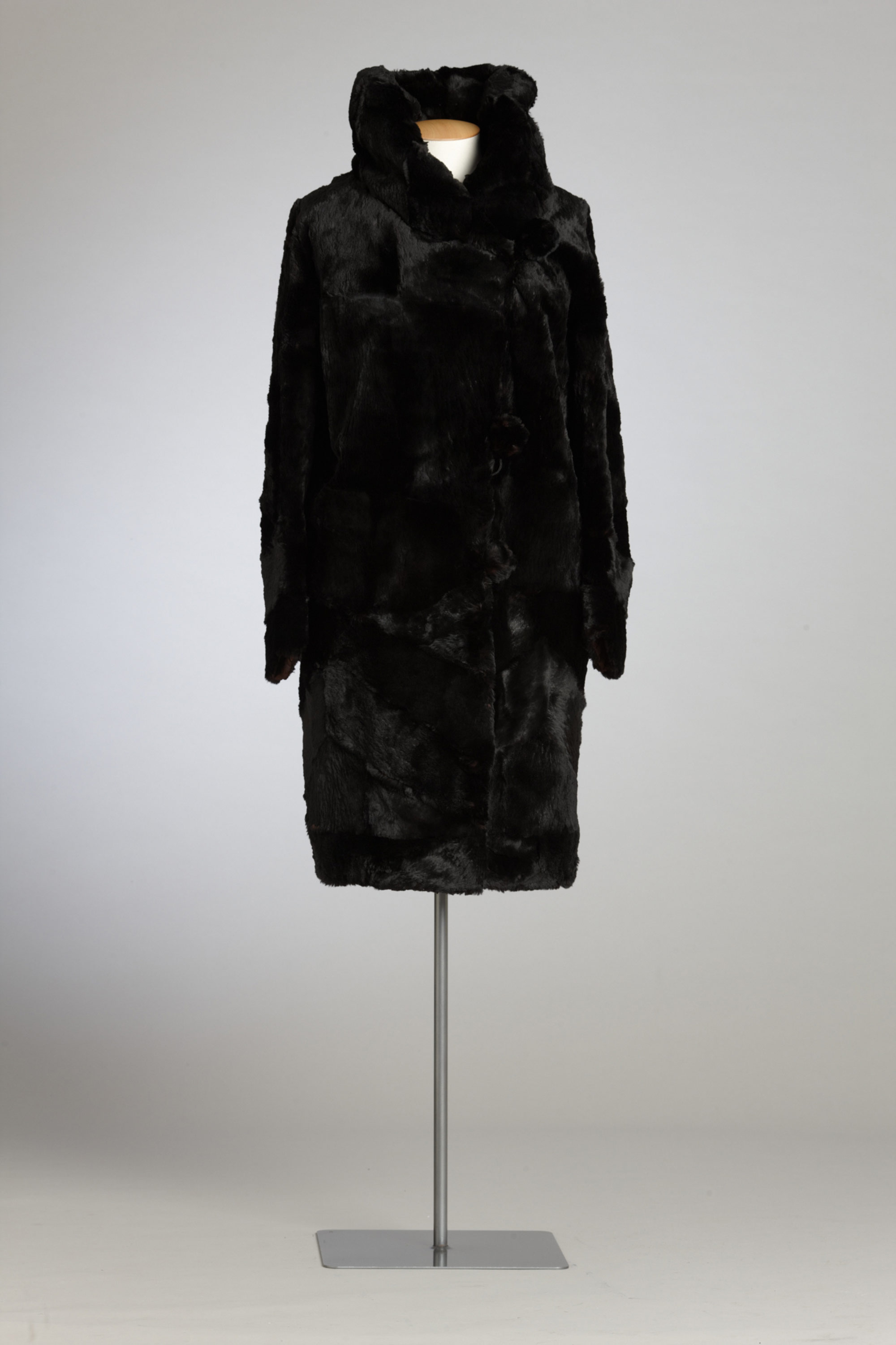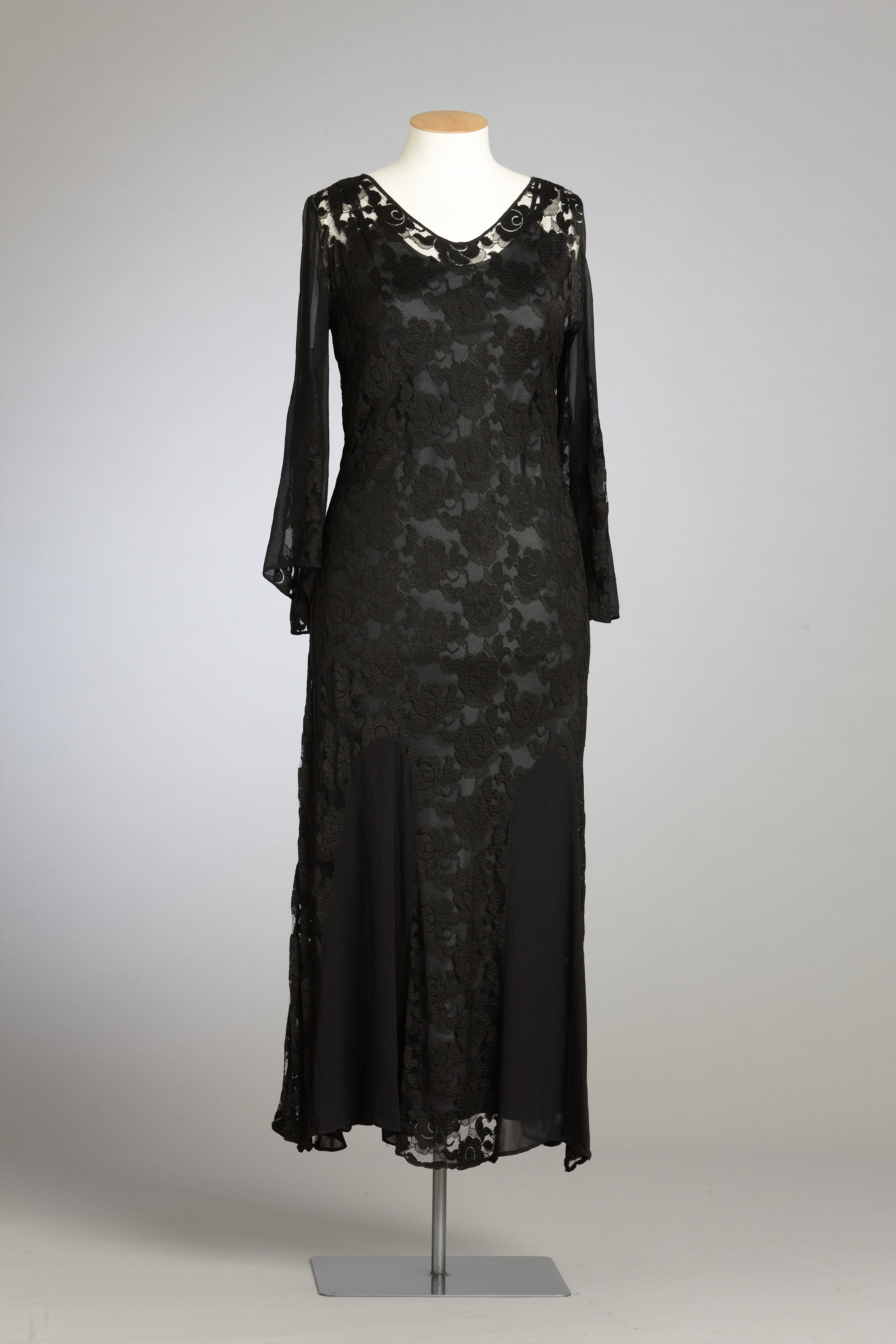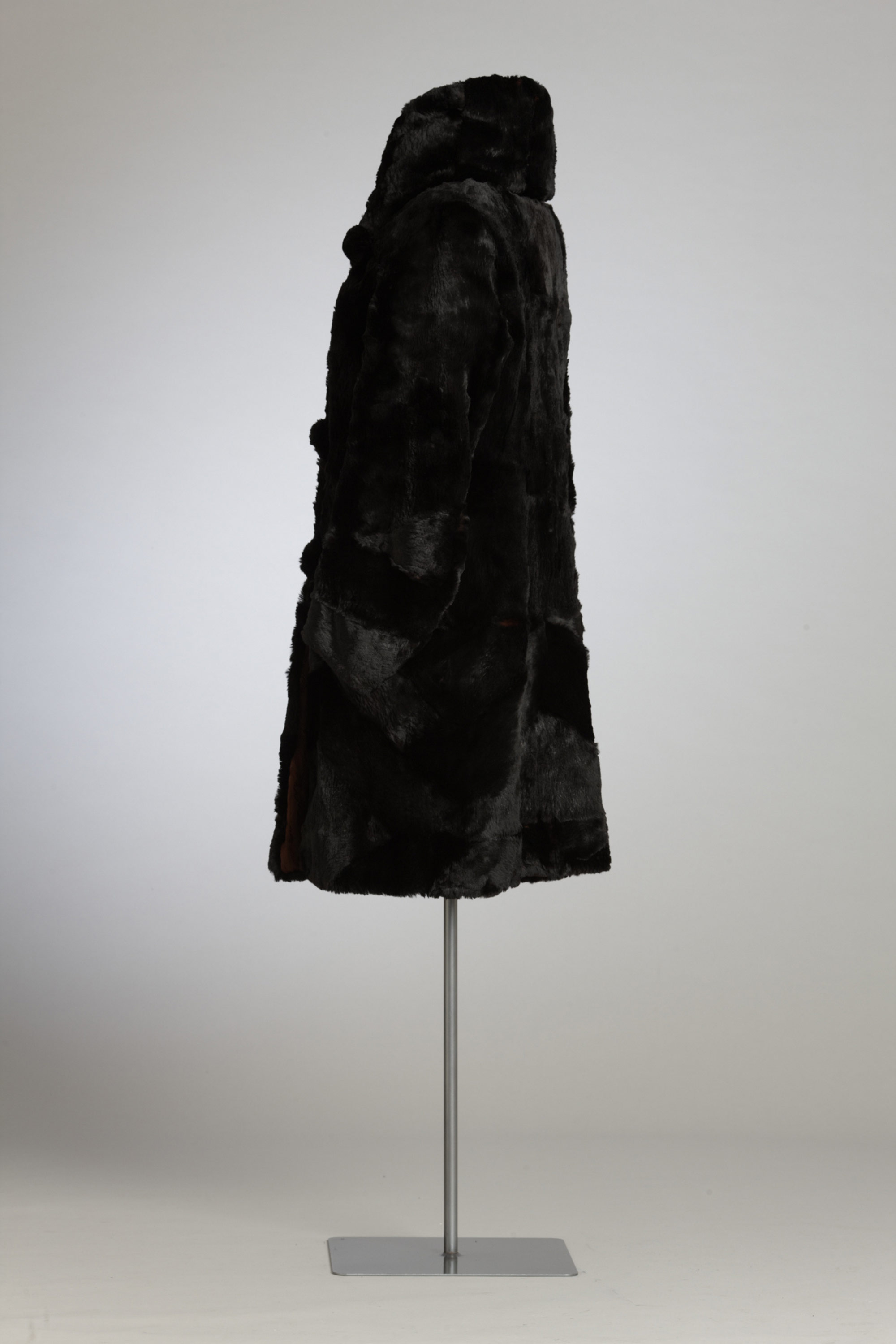 A hat with net trim, a string of beads and a small purse added the finishing touches to this dress and rabbit fur coat, which were owned by Gertrude Martha Campbell (née Jane) of Christchurch. Gertrude would have been in her early fifties when she first wore this outfit, although somewhat differently from this presentation because the coat was originally a jacket. It has been lengthened using the same fur, which has been added in a chevron pattern that echoes the cut of the sleeves. Gertrude and her husband Peter had four sons. Their third son preserved this dress, along with Gertrude’s china and linen, for more than 60 years until his own death. It was then inherited by his daughter. Read more about wearing the colour black in the New Zealand Fashion Museum publication Black: The history of black in fashion, society and culture in New Zealand.
