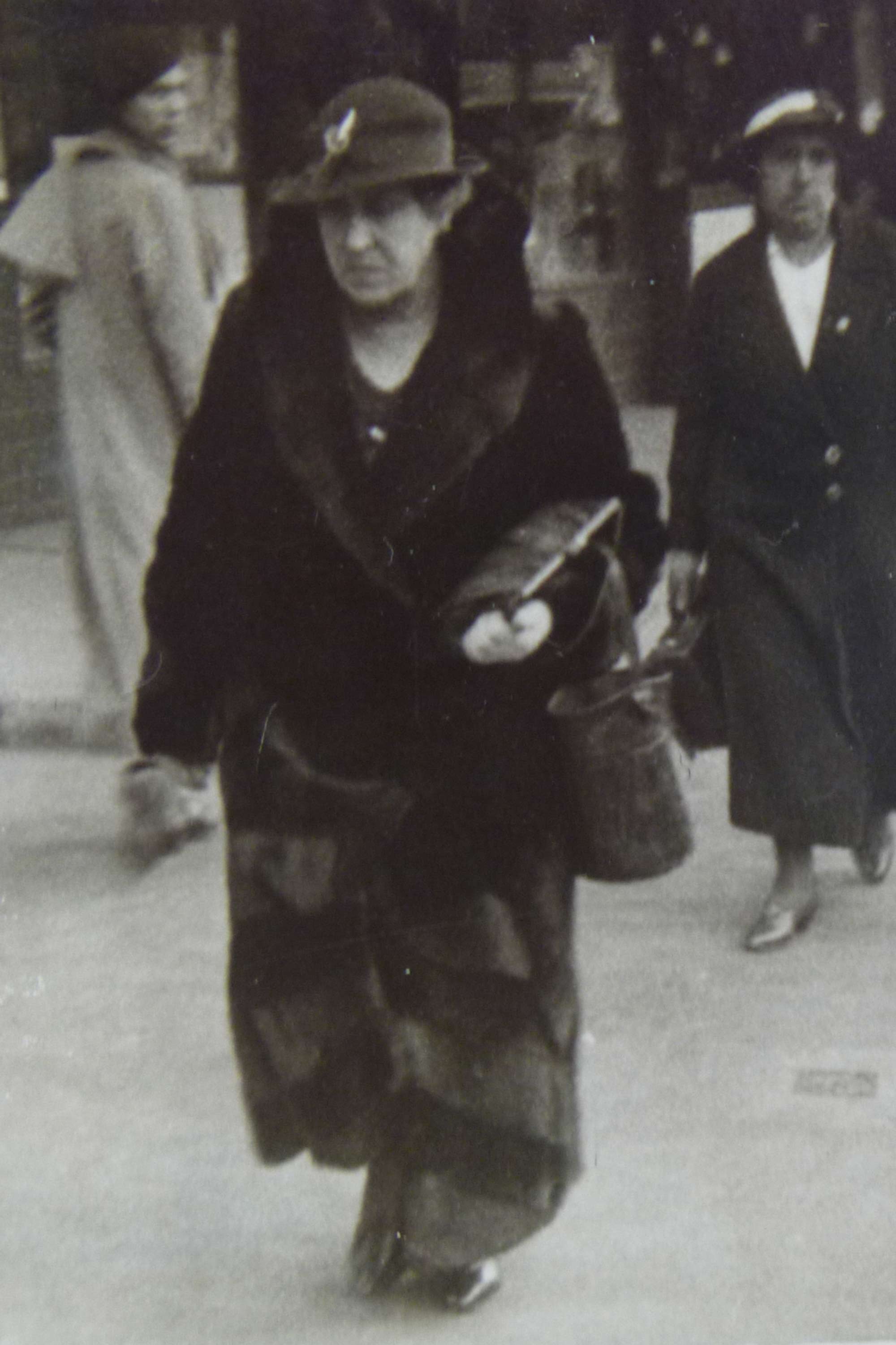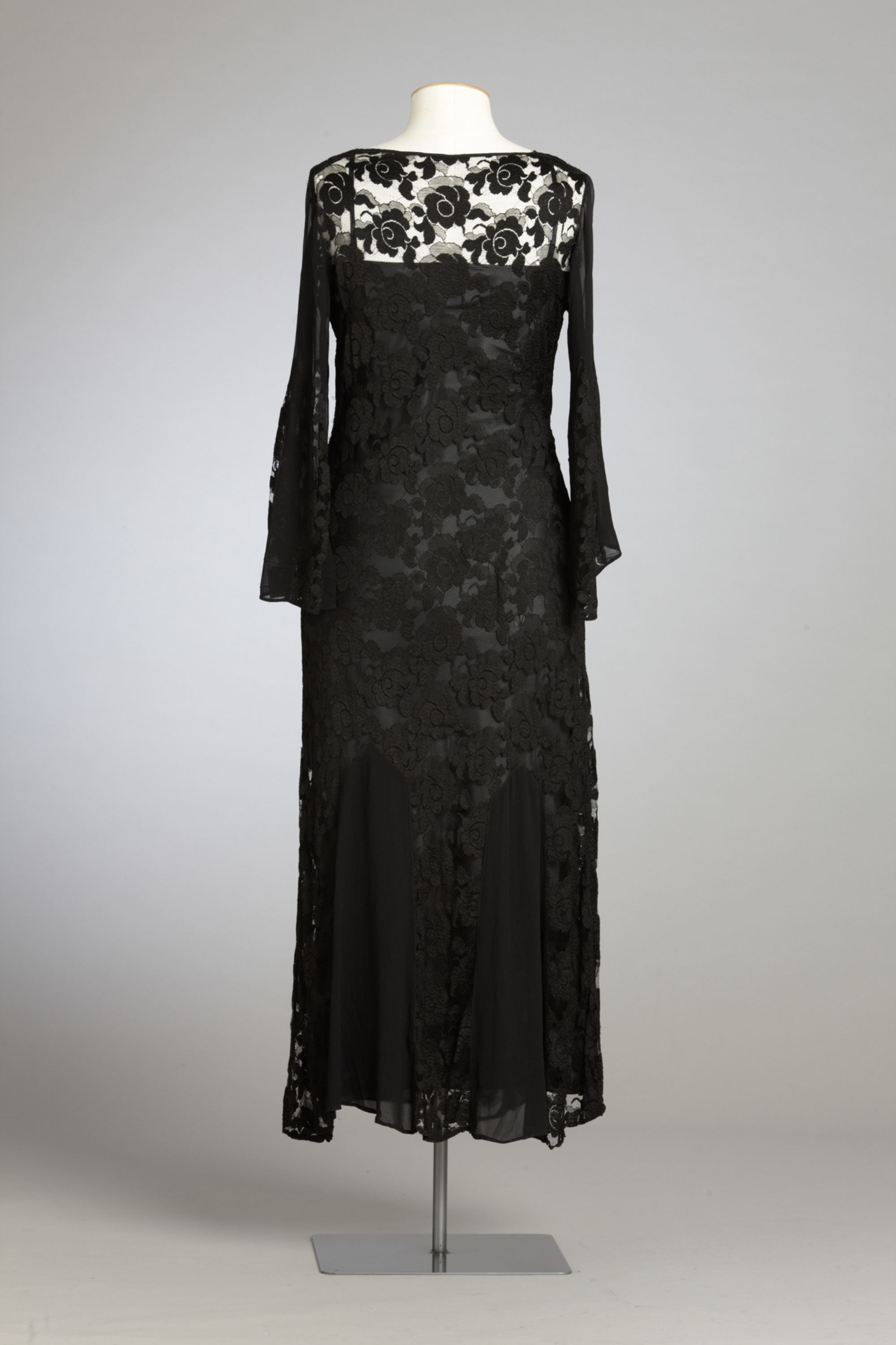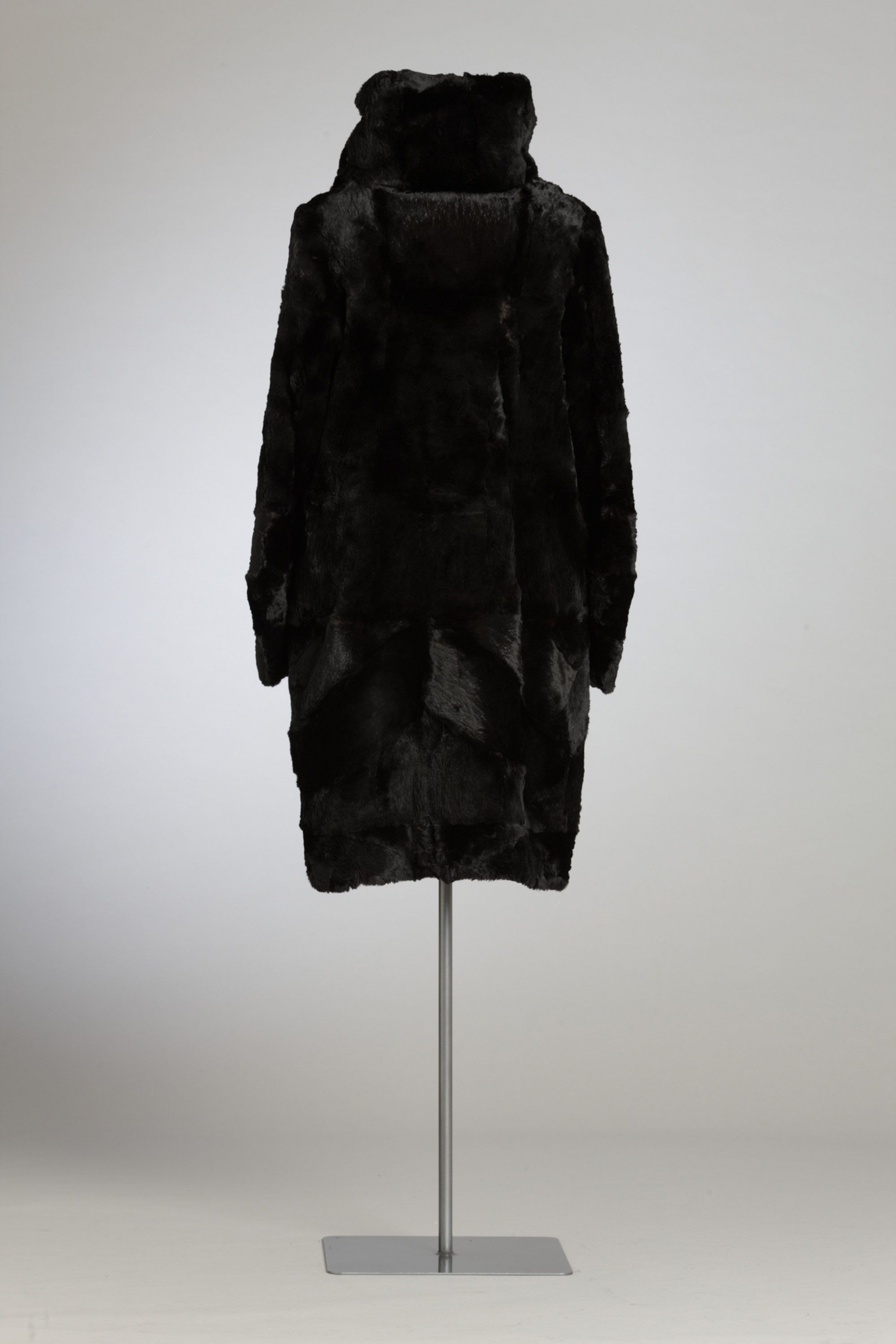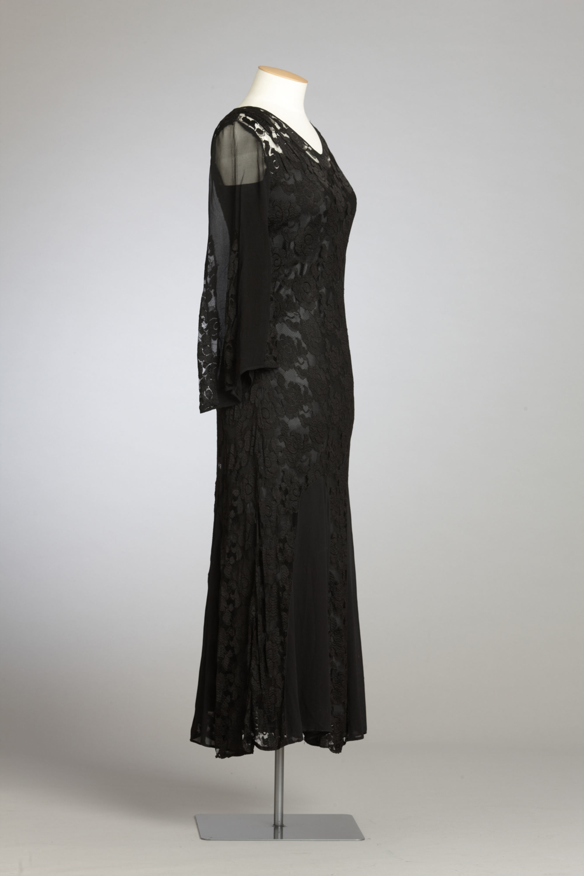 A hat with net trim, a string of beads and a small purse added the finishing touches to this dress and rabbit fur coat, which were owned by Gertrude Martha Campbell (née Jane) of Christchurch. Gertrude would have been in her early fifties when she first wore this outfit, although somewhat differently from this presentation because the coat was originally a jacket. It has been lengthened using the same fur, which has been added in a chevron pattern that echoes the cut of the sleeves. Gertrude and her husband Peter had four sons. Their third son preserved this dress, along with Gertrude’s china and linen, for more than 60 years until his own death. It was then inherited by his daughter. Read more about wearing the colour black in the New Zealand Fashion Museum publication Black: The history of black in fashion, society and culture in New Zealand.