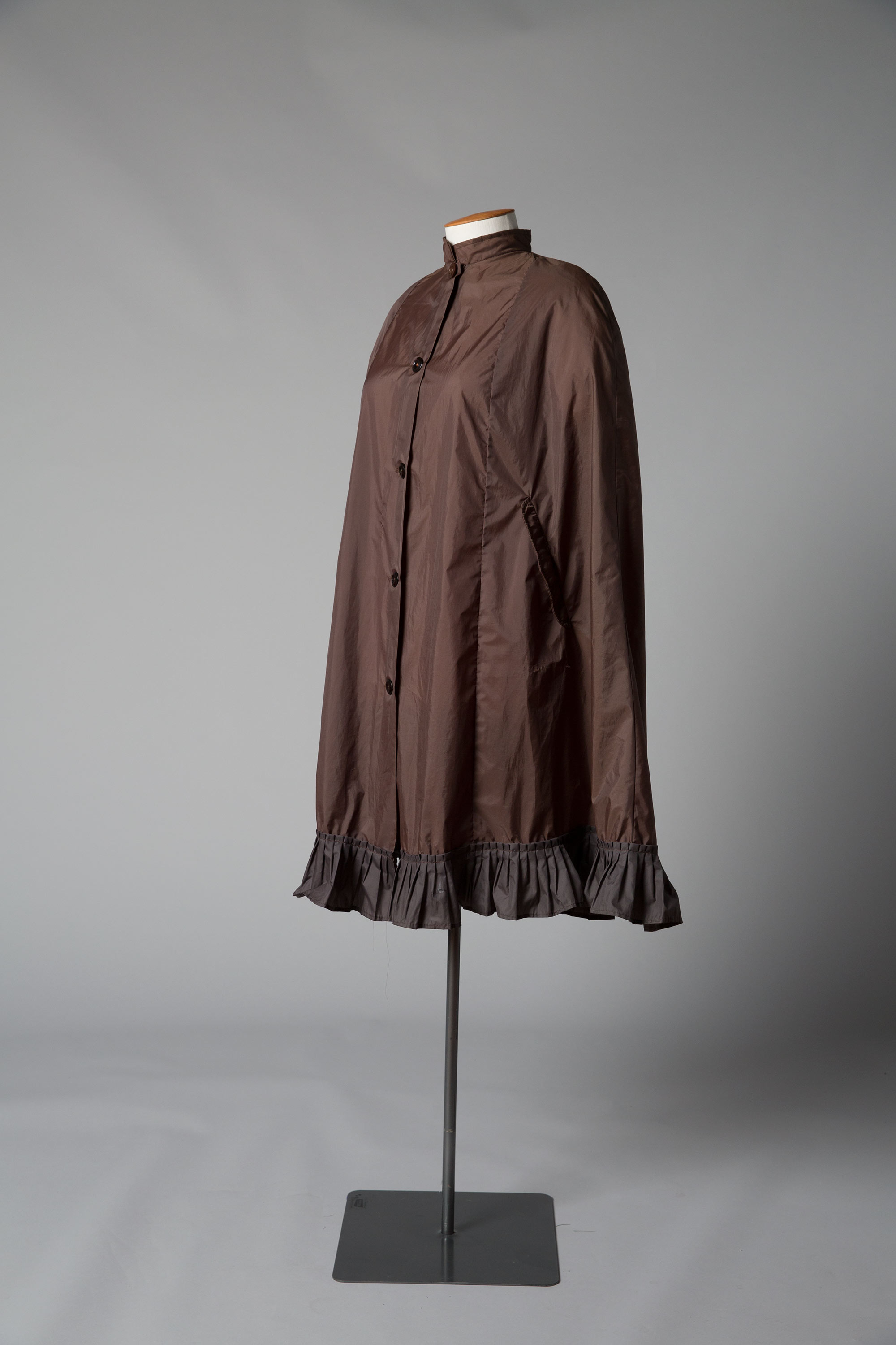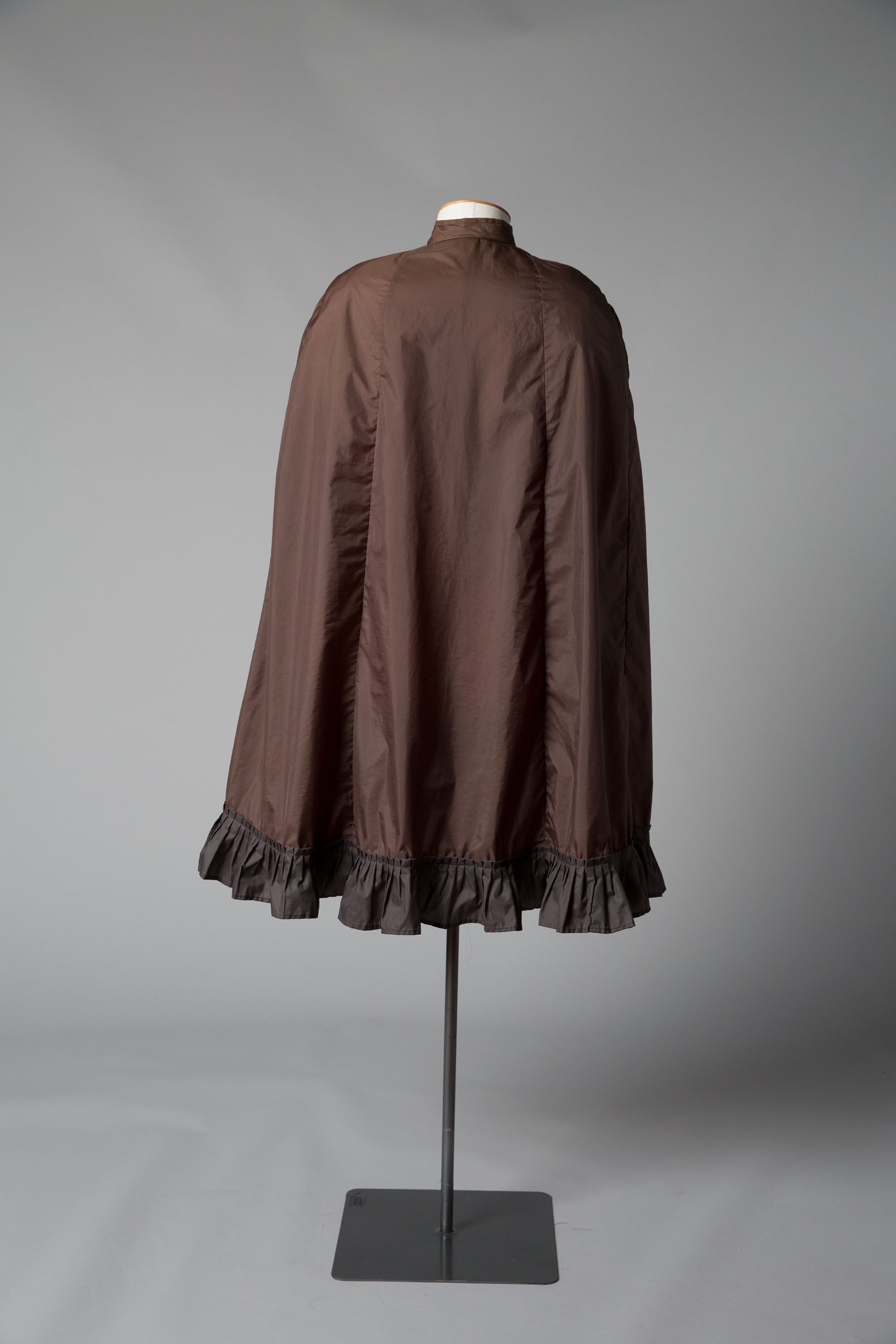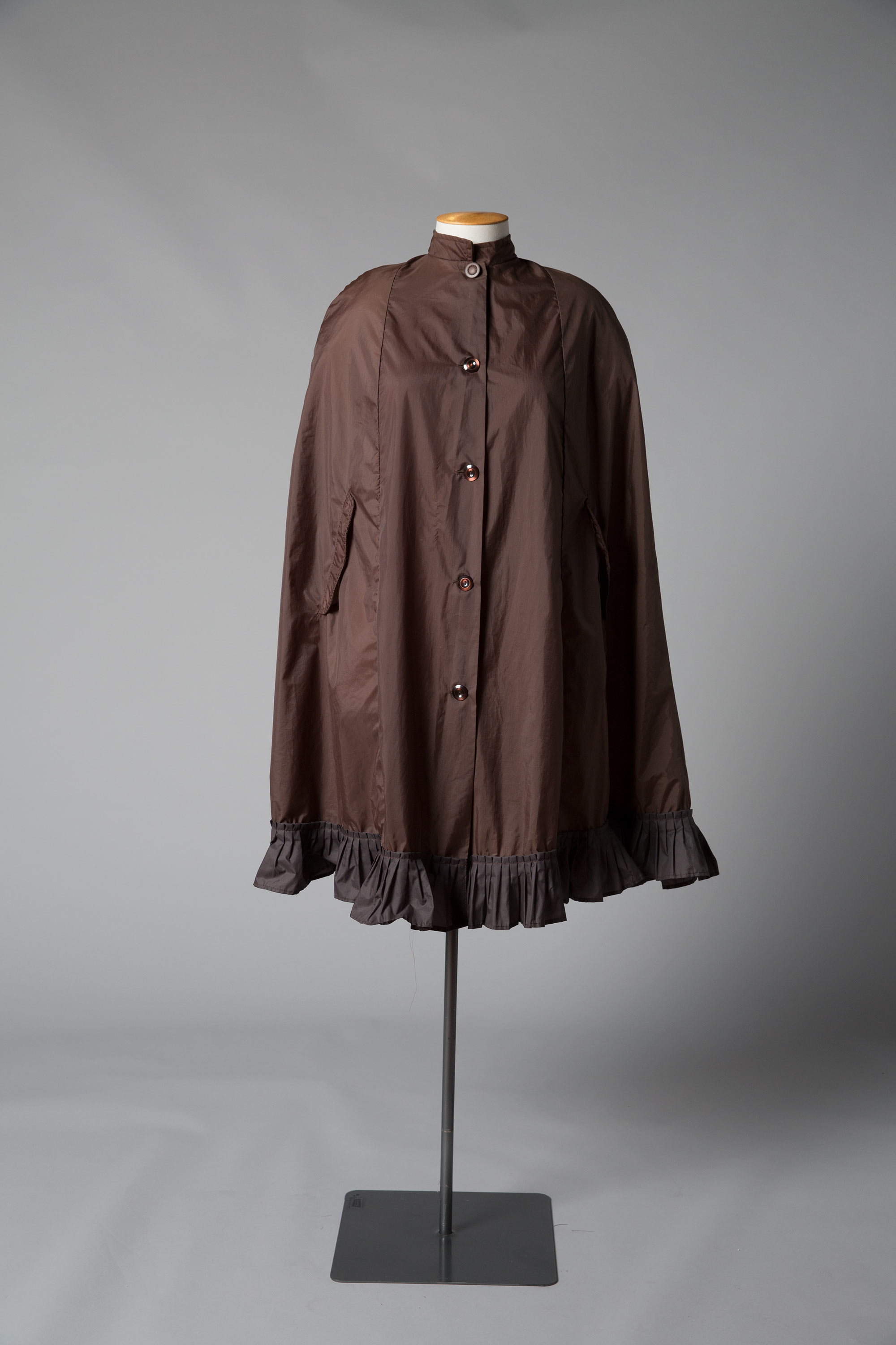 This cape is worn away in the area where a handbag would have been held. Its label, M & C 100, identifies that the cape would have been made to commemorate the 100 year anniversary of the Milne & Choyce department store in 1966.