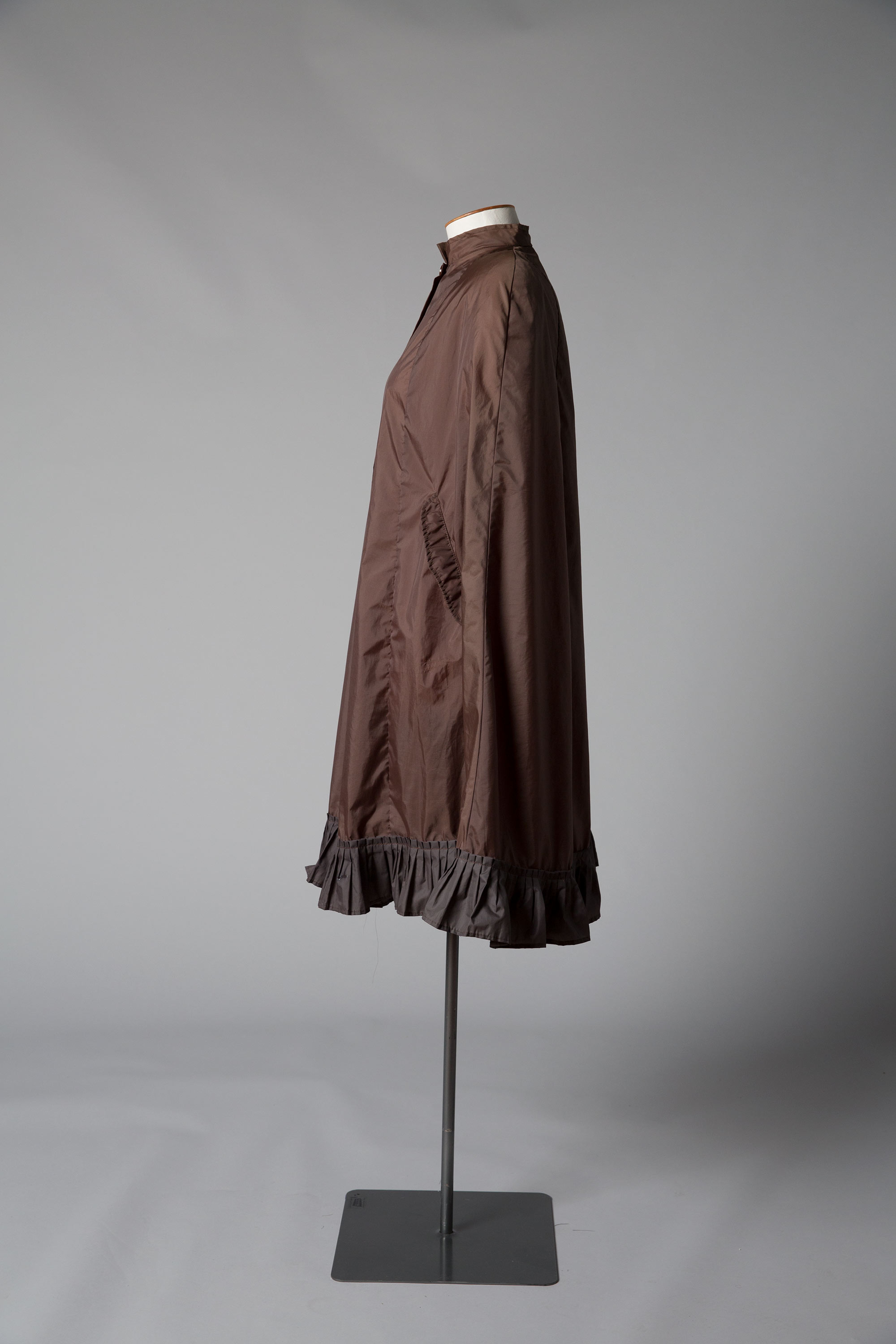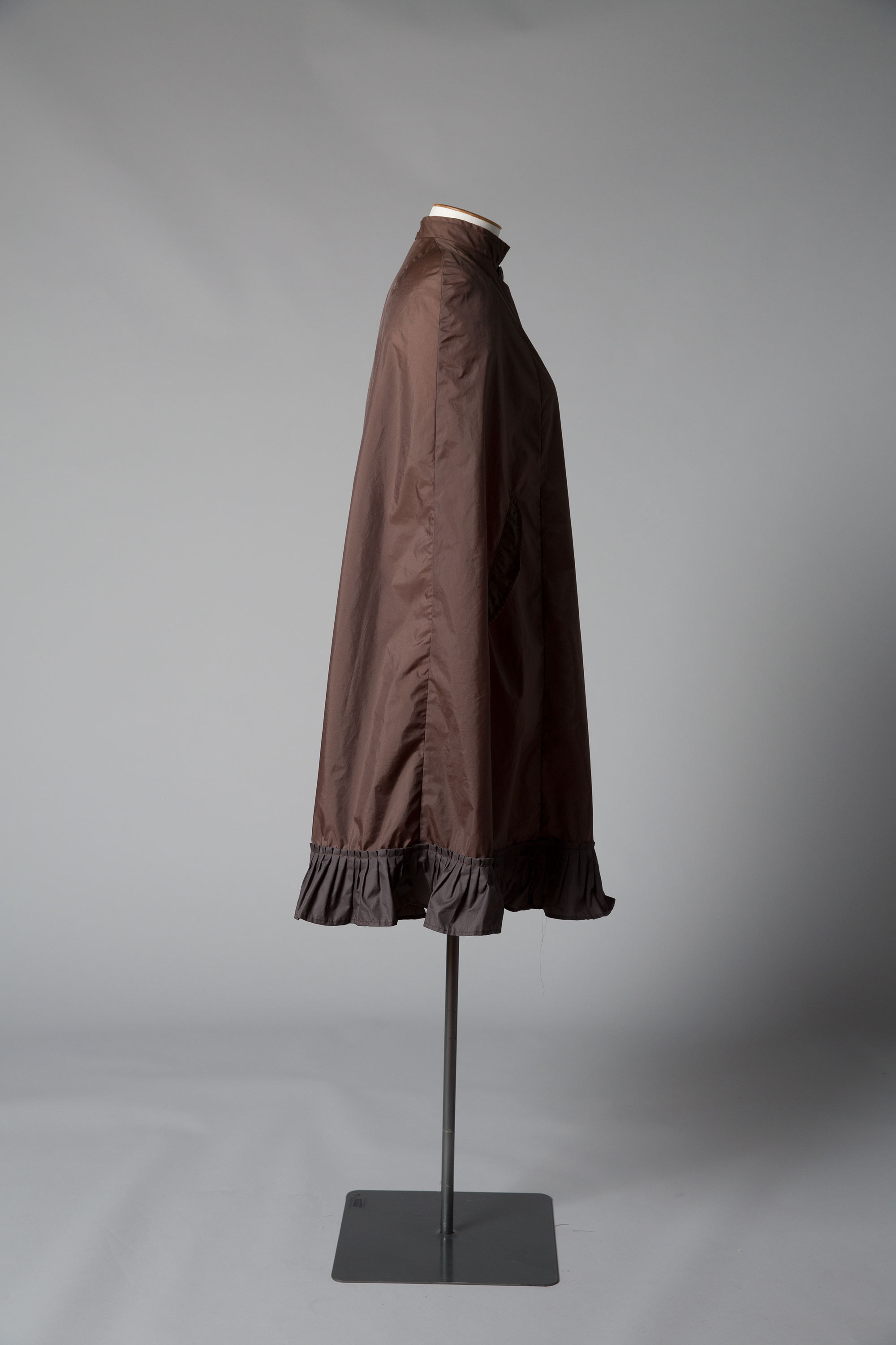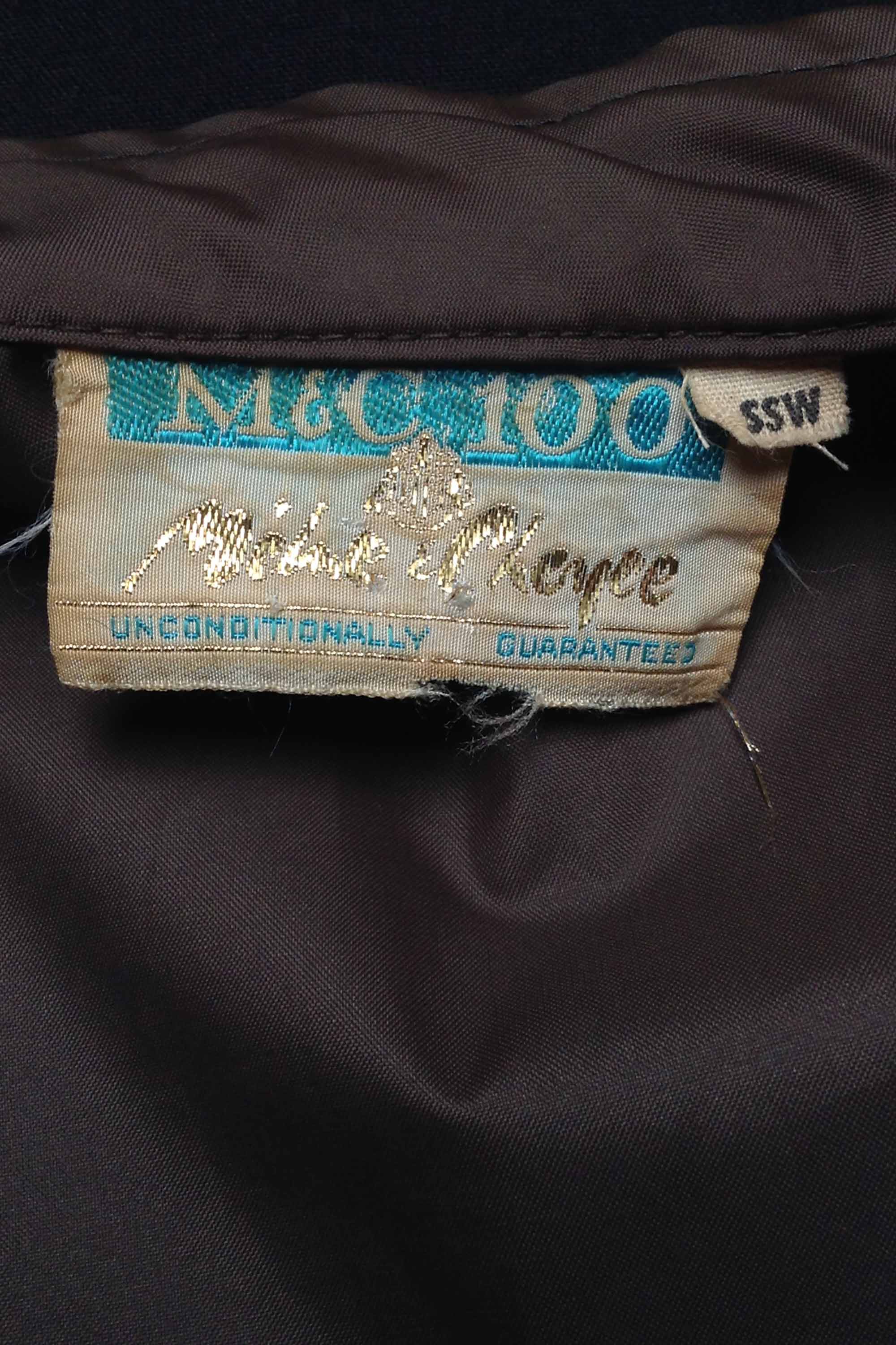 This cape is worn away in the area where a handbag would have been held. Its label, M & C 100, identifies that the cape would have been made to commemorate the 100 year anniversary of the Milne & Choyce department store in 1966.