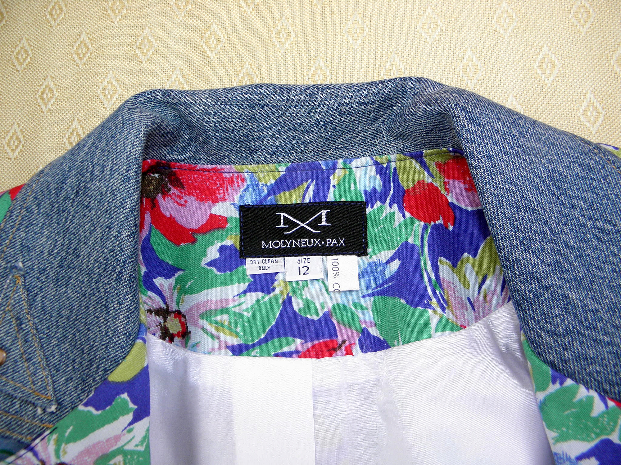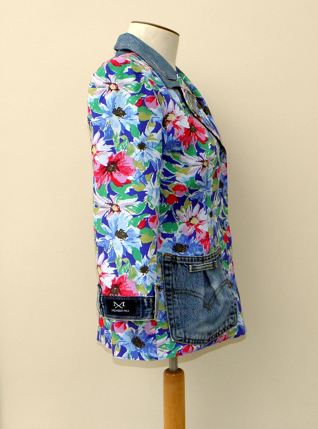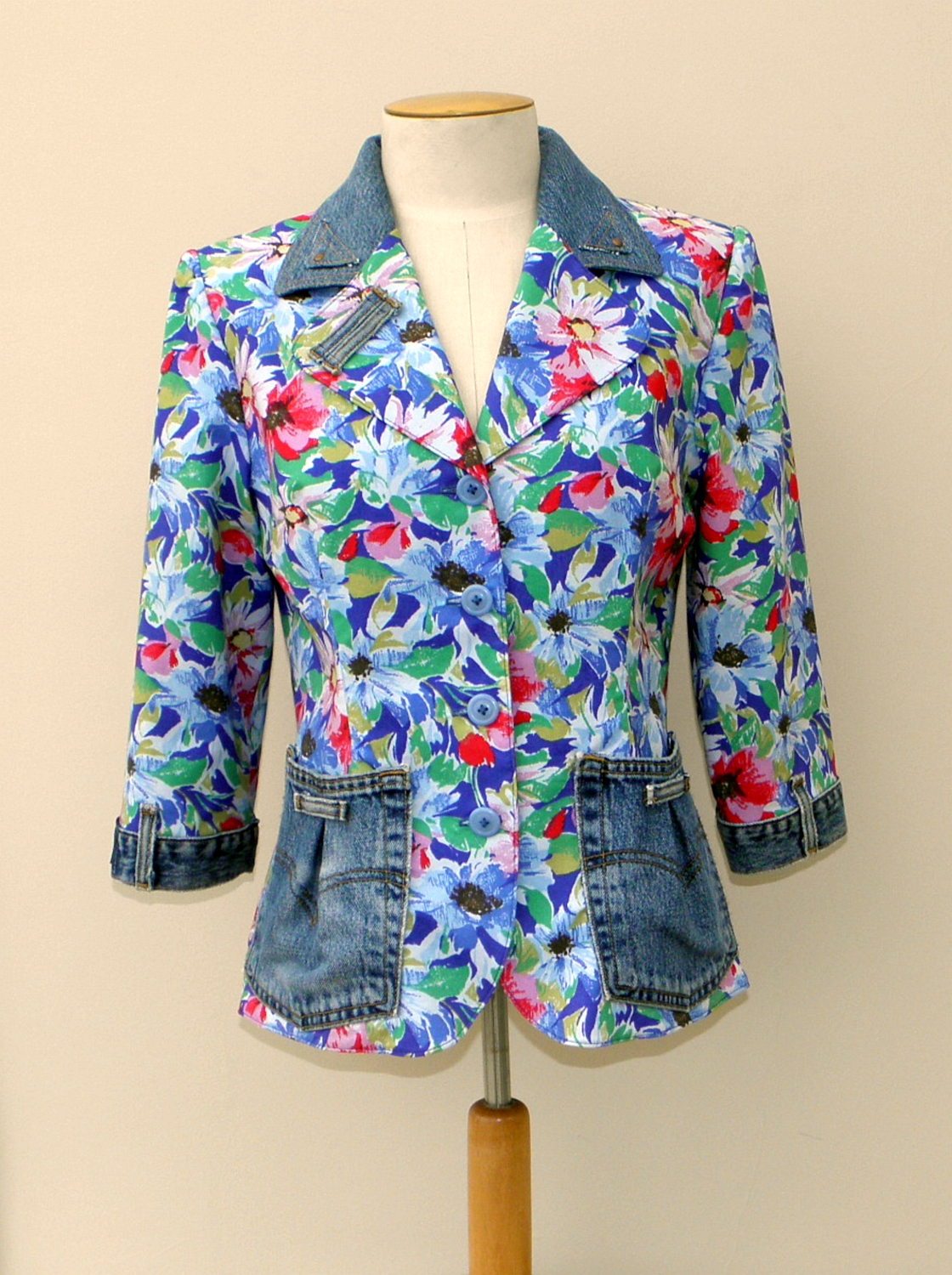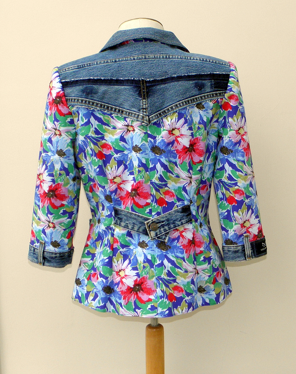 For this colourful jacket, Brian Molyneux has juxtaposed recycled cotton and denim. The floral cotton, which had a white background, was dyed with a blue wash to tone down the white and the flowers to make the colours more complementary to the blue denim. The denim yoke and pockets (with added pleat) are from a pair of men’s old jeans and the waistband from the jeans has been used for the half belt and cuffs.