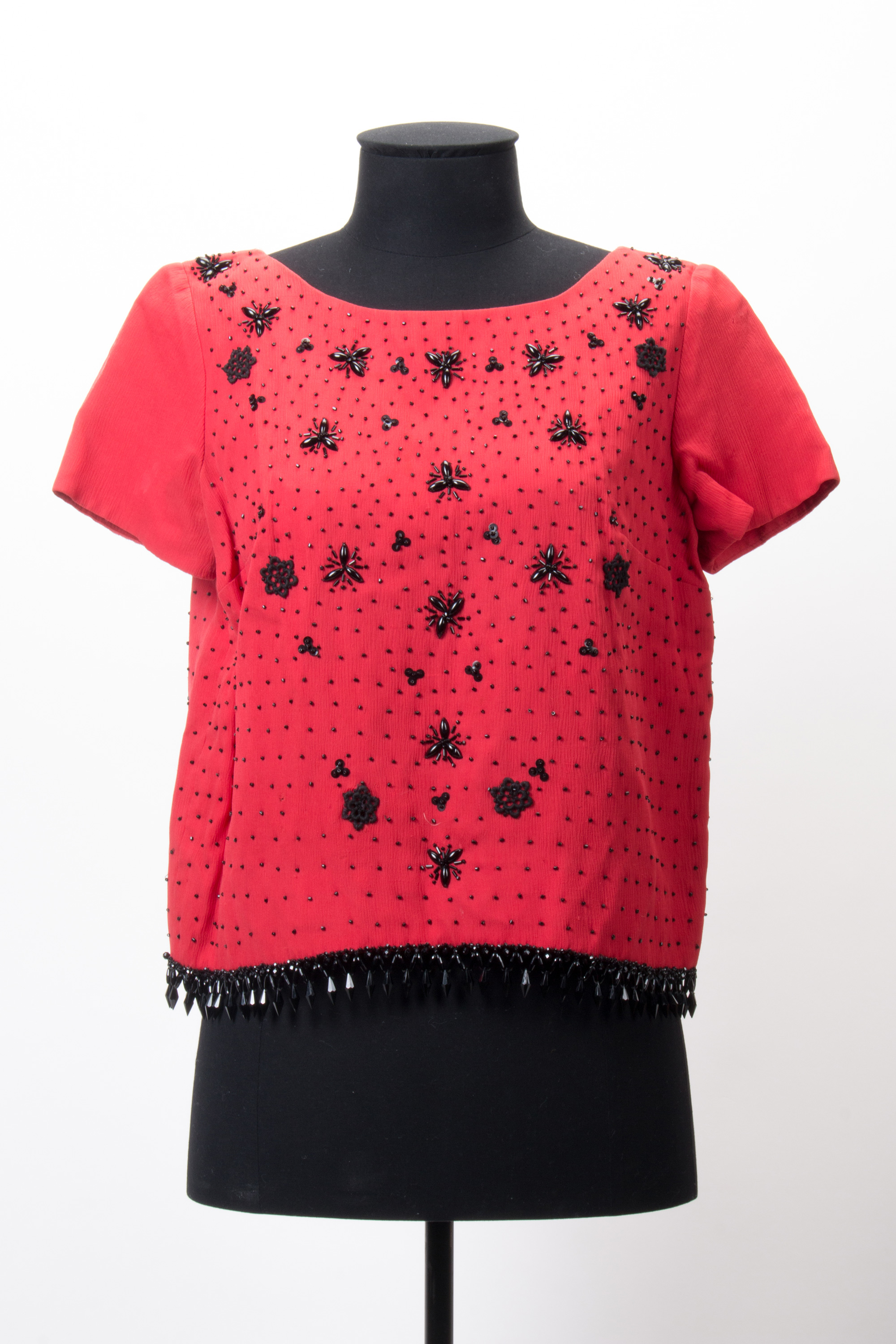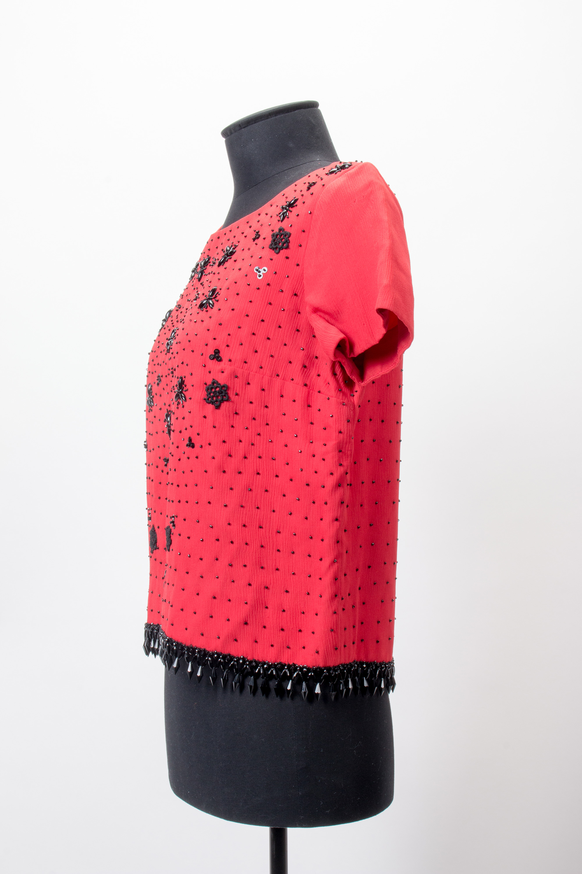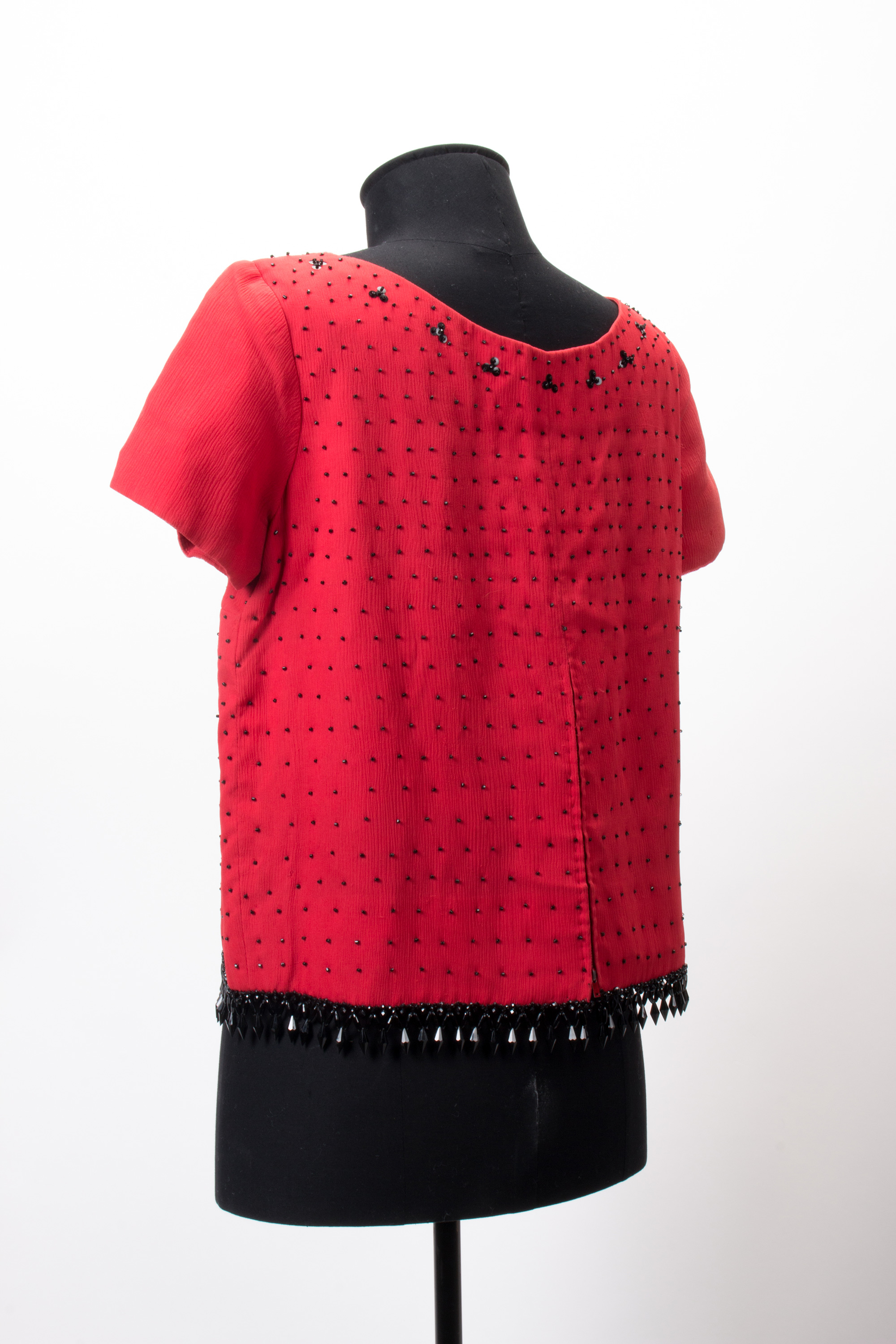 Red blouse with black bead fringe