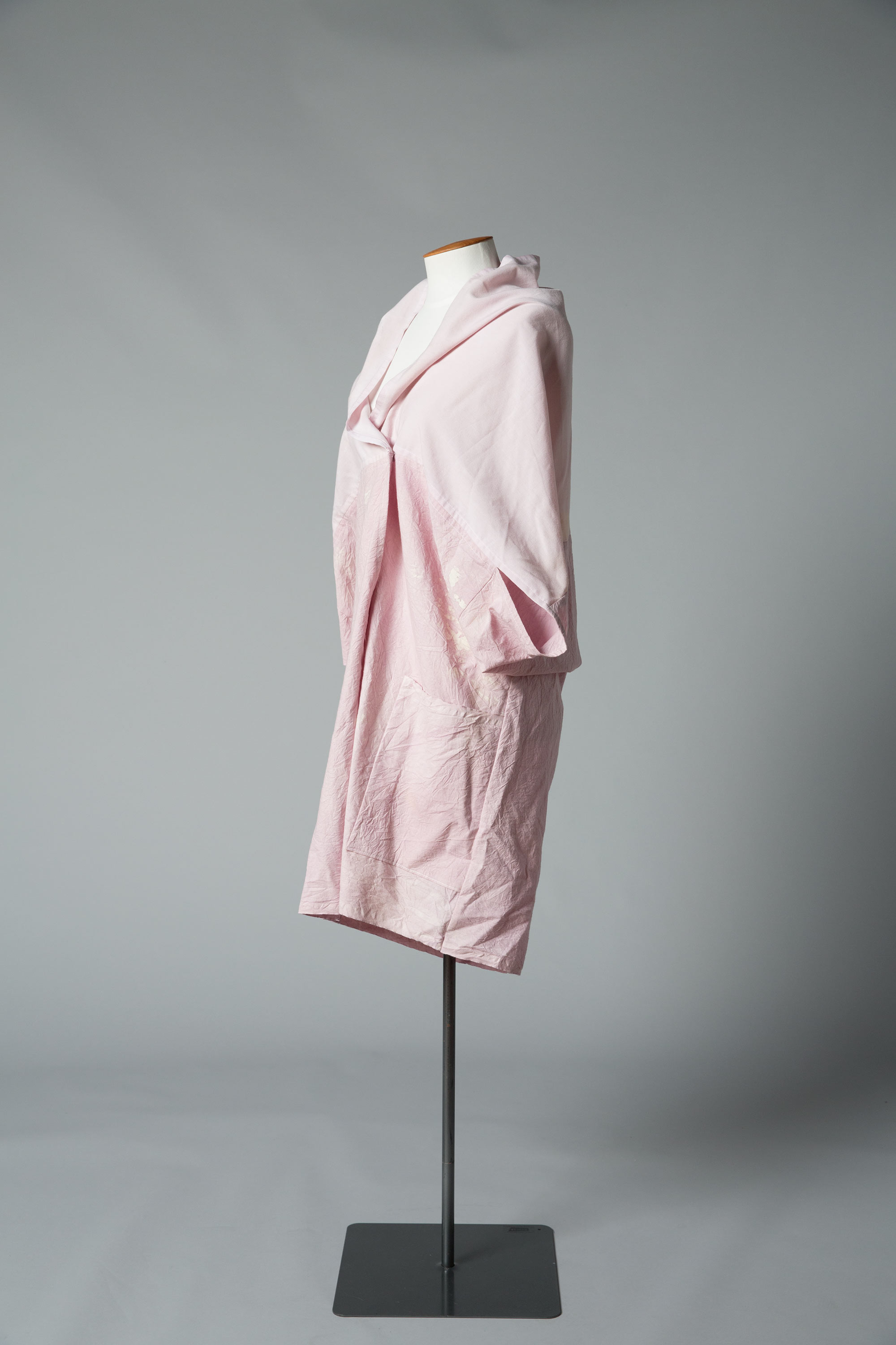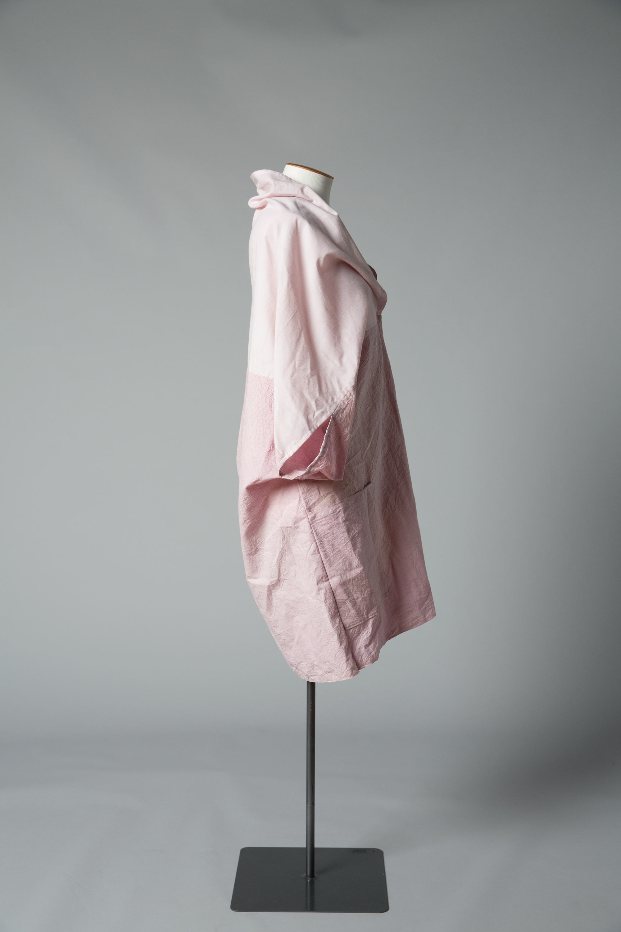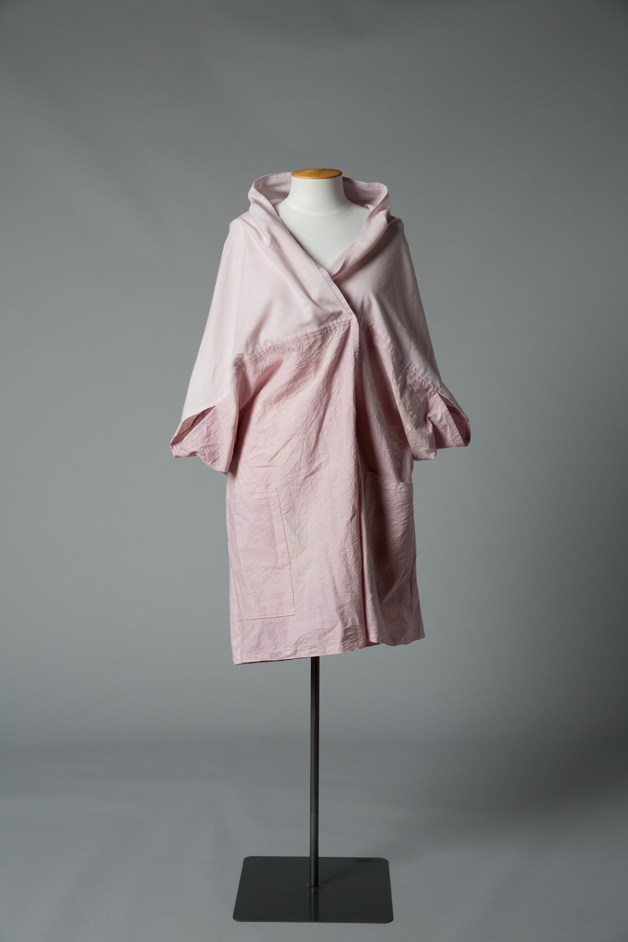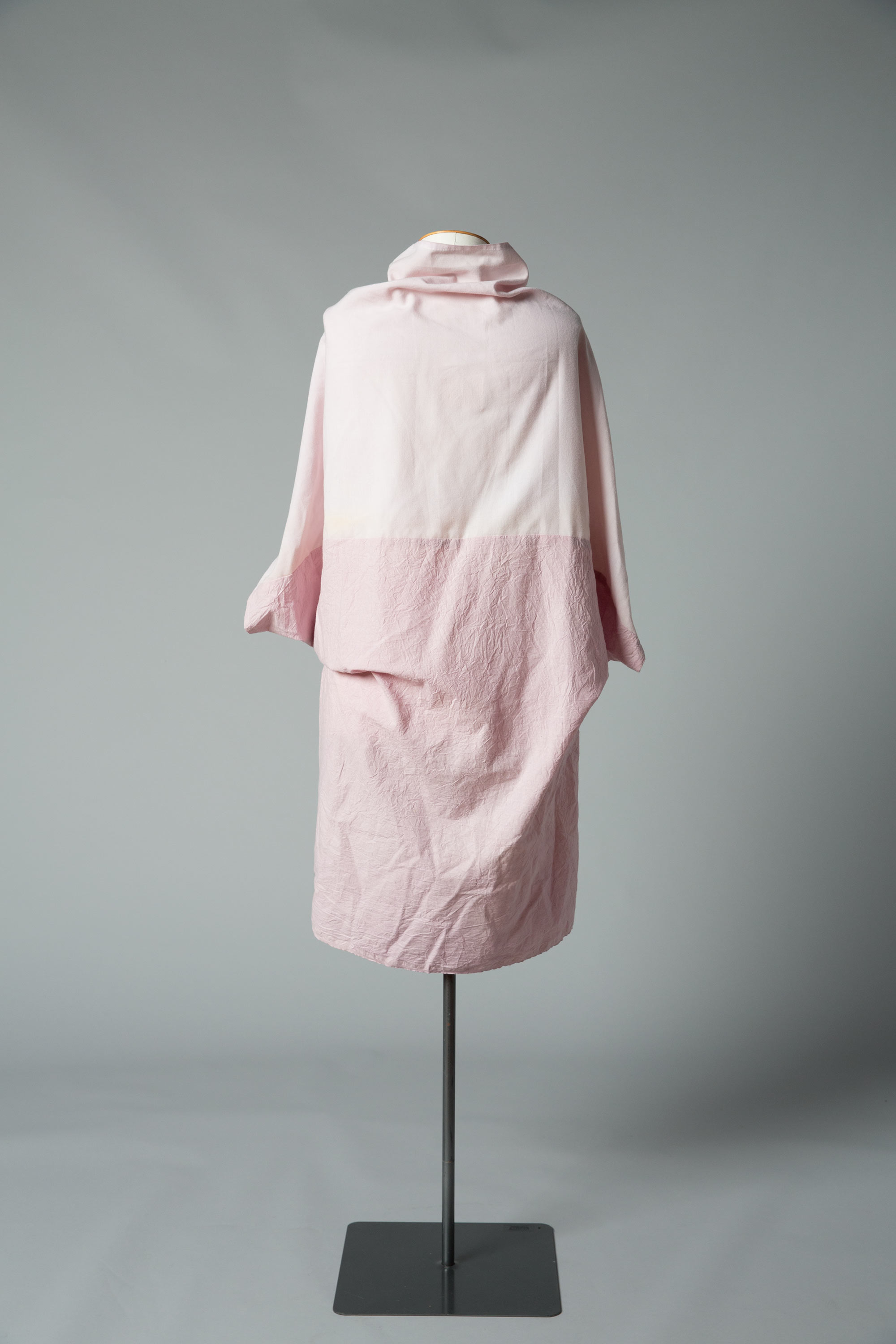 The fabric was hand-dyed with red cabbage, which makes it light sensitive. The pattern was cut so that no fabric went to waste.