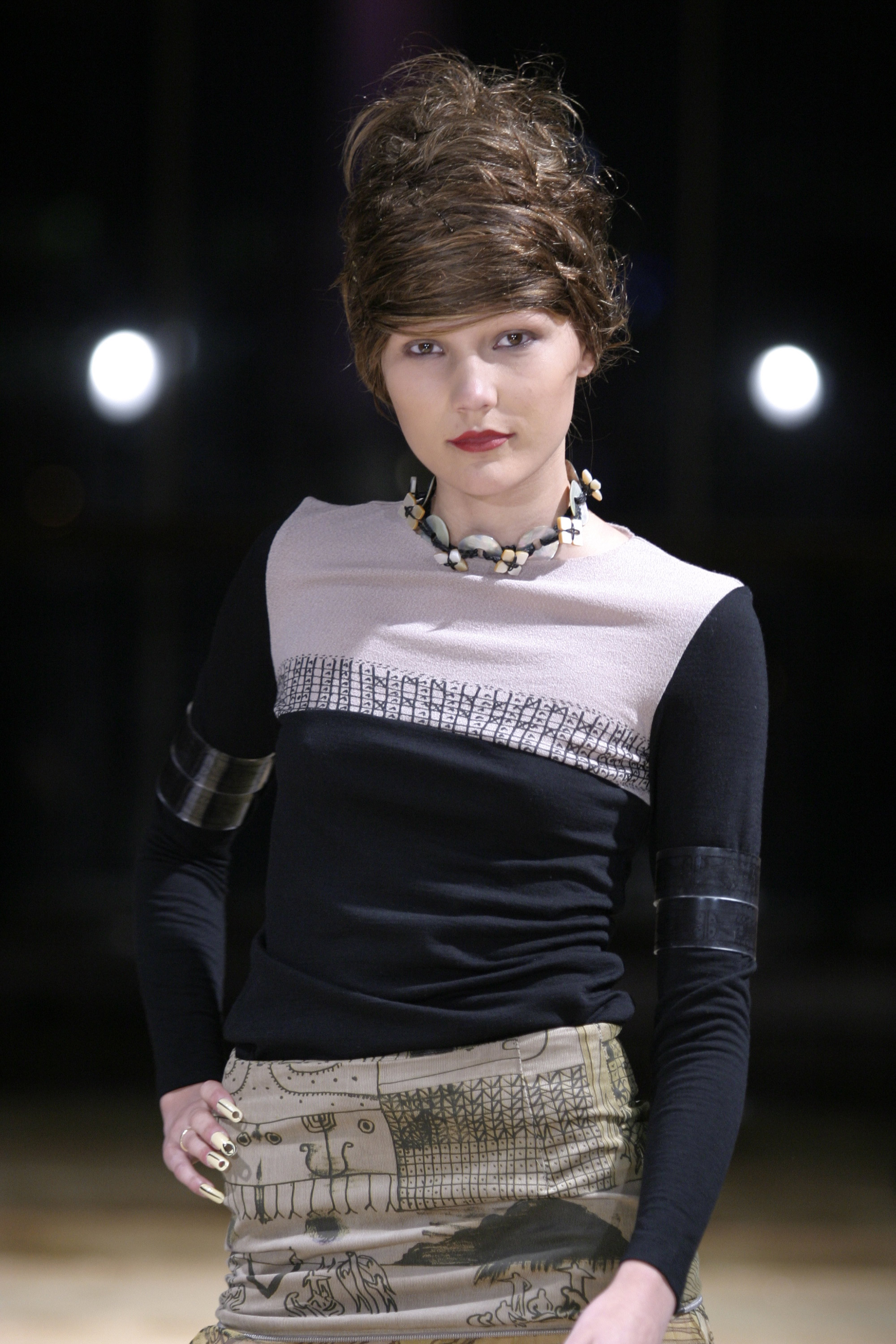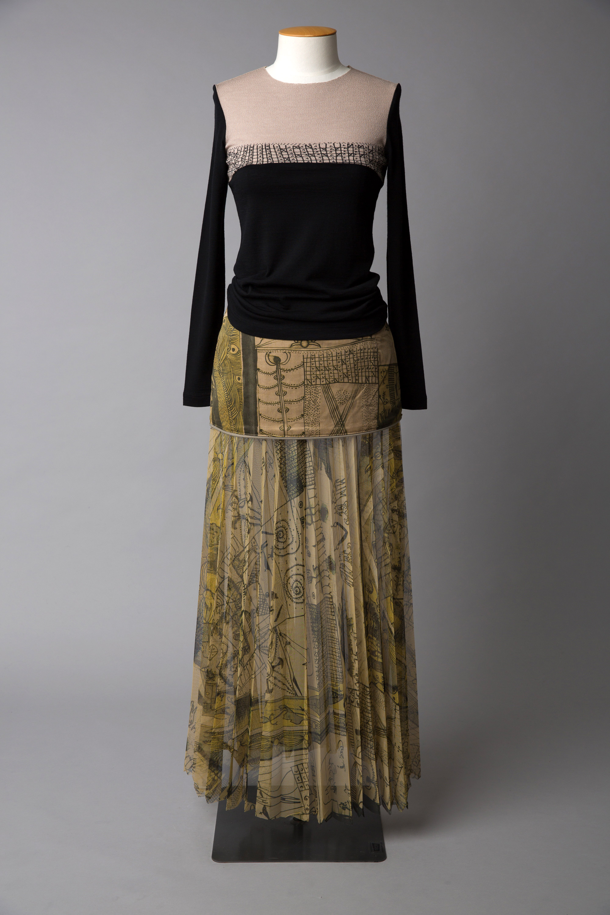 Black and tan (jumper), tapa (Remix skirt), ochre (Pacific Pleats skirt)