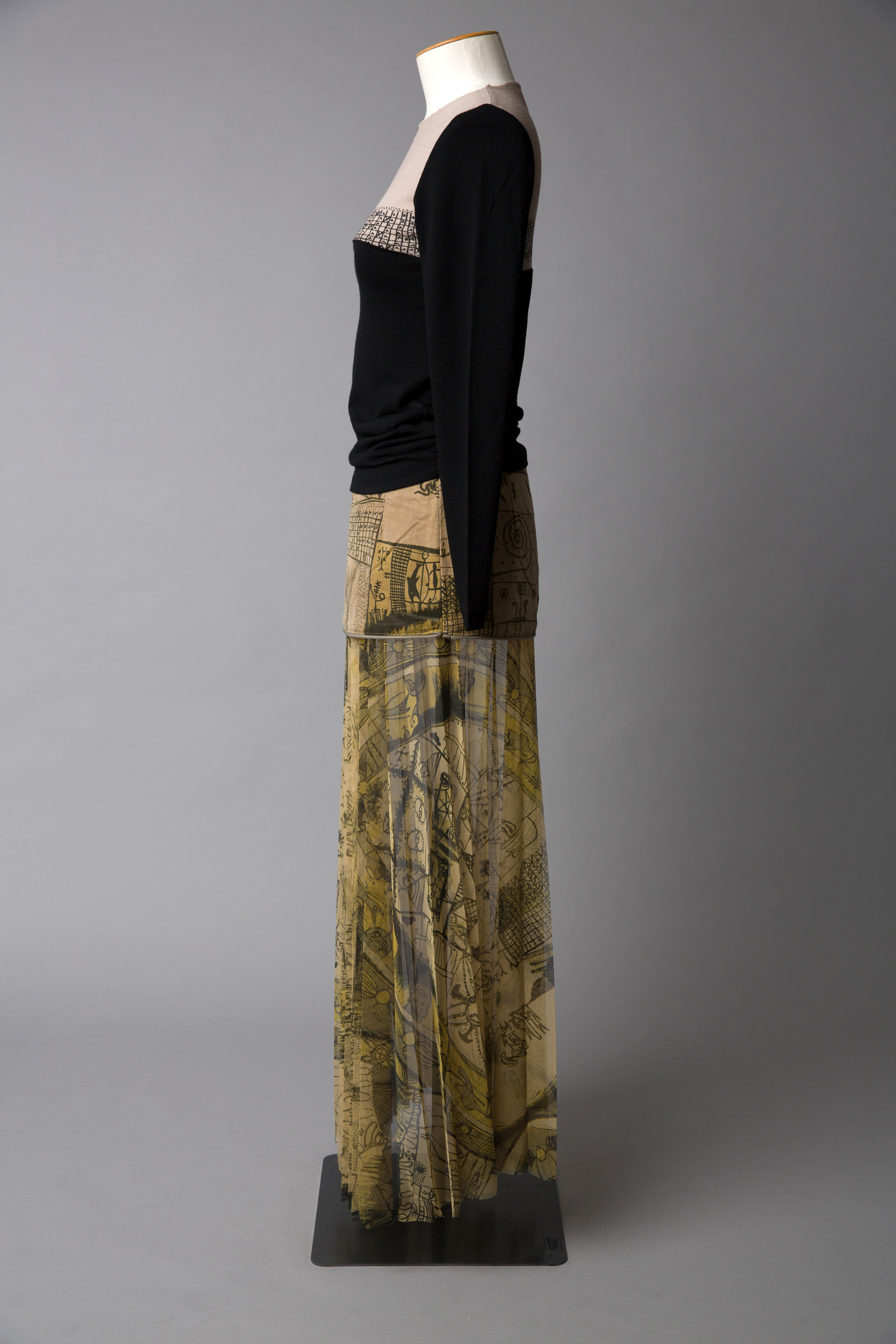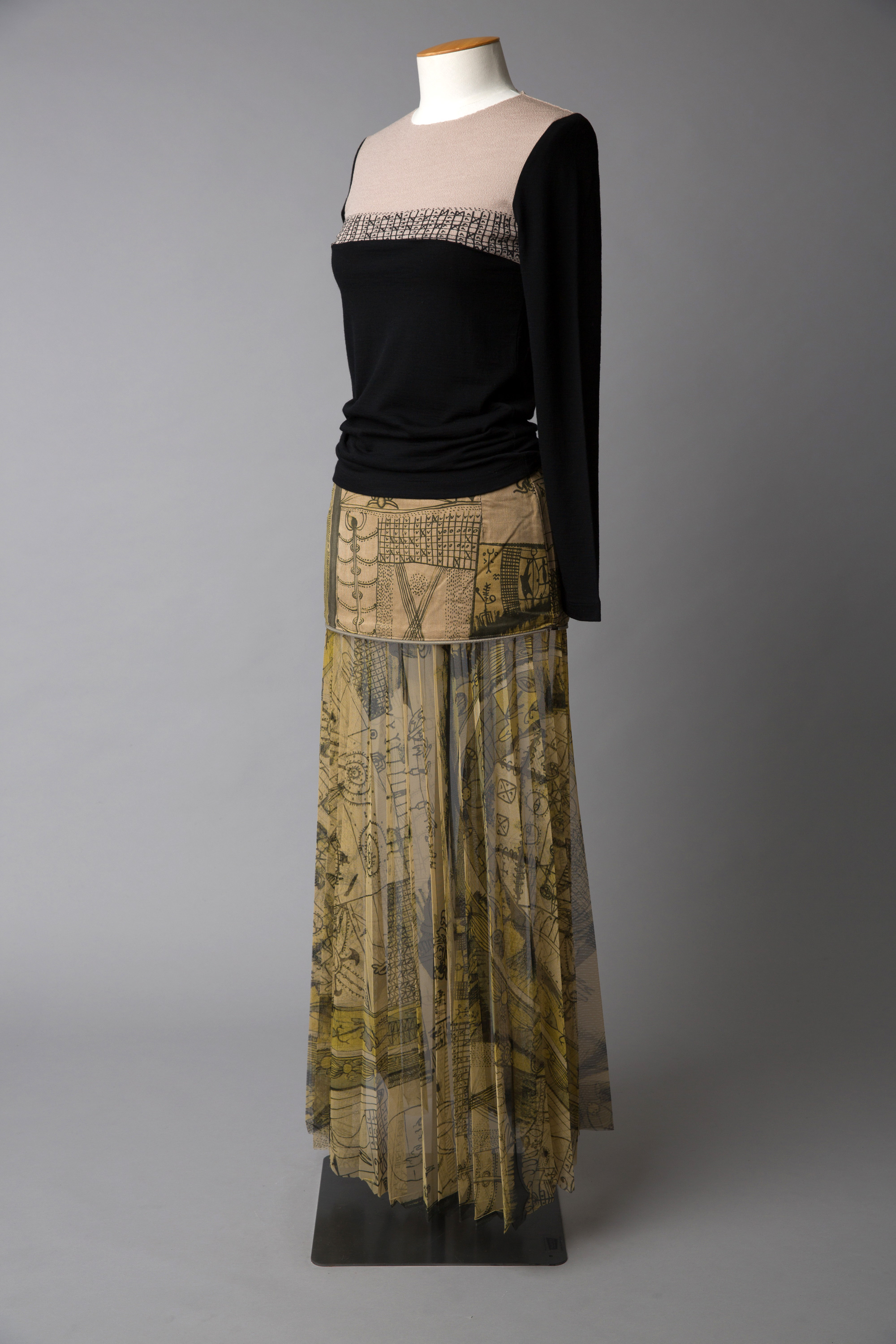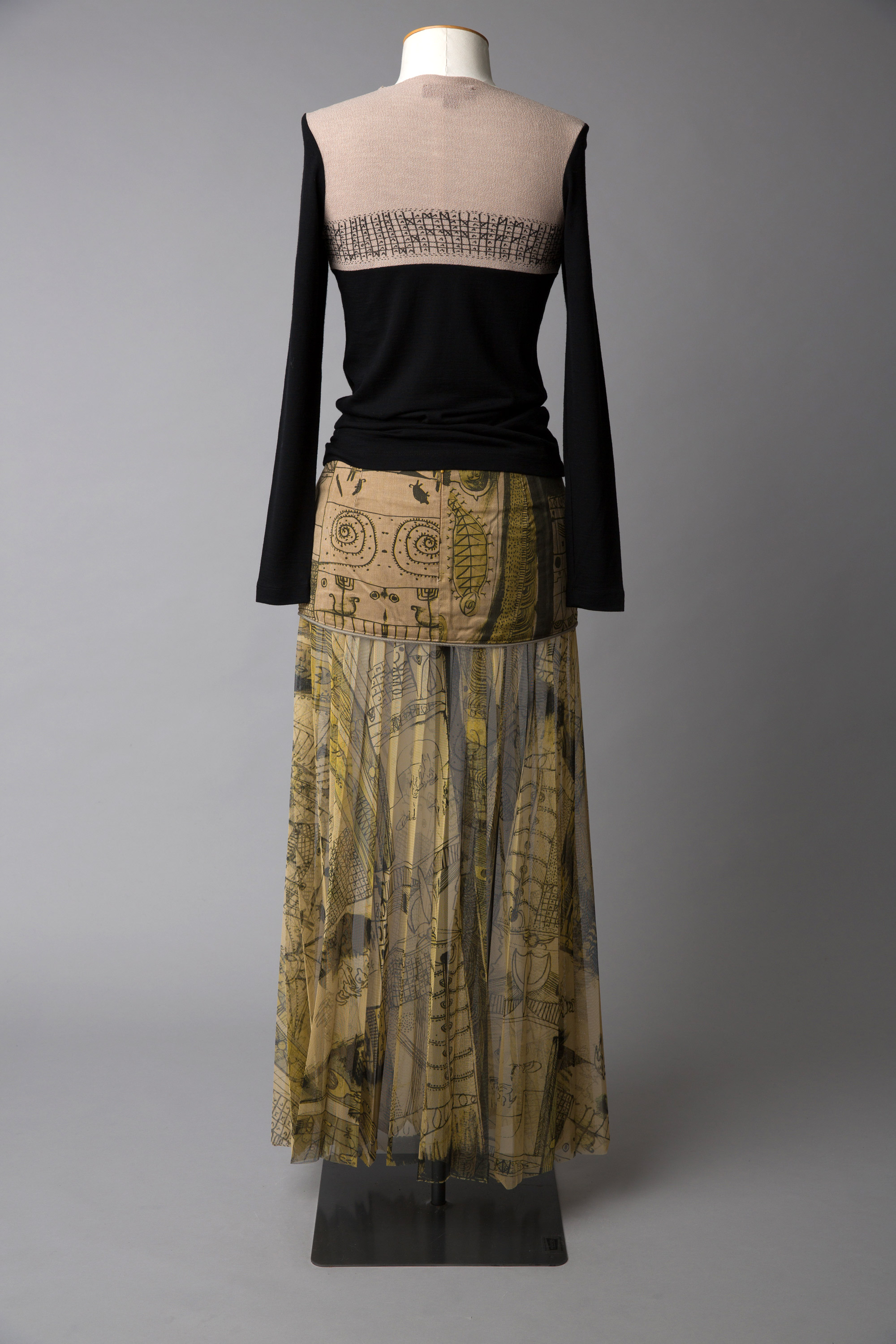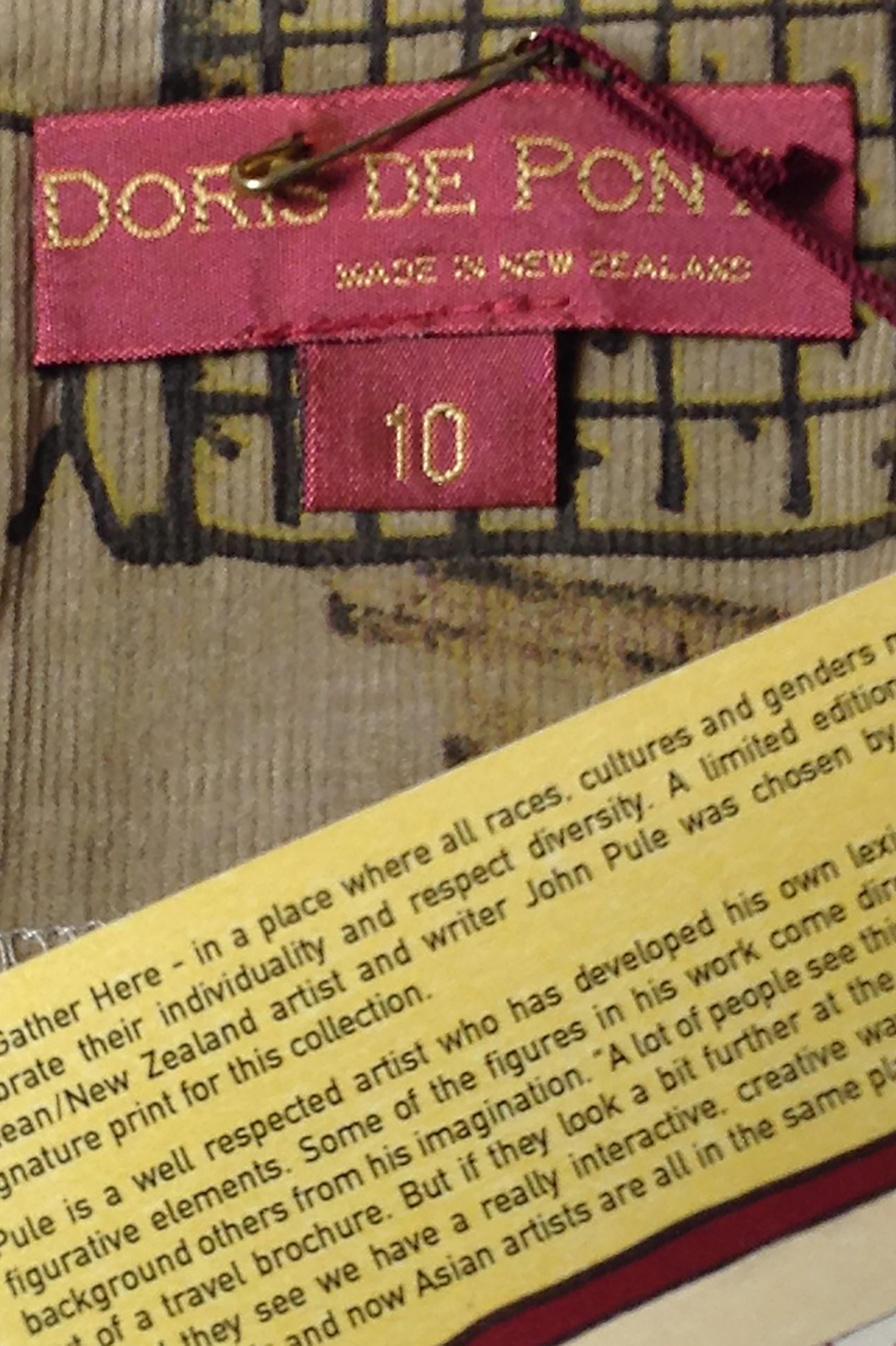 These garments are from Doris de Pont's 'Let’s Gather Here' winter 2004 collection. The two skirts feature a unique print by Niuean/New Zealand artist and writer John Pule. The collection was launched at New Zealand Fashion Week in a show at St Kevin’s Arcade on Karangahape Road, Auckland.