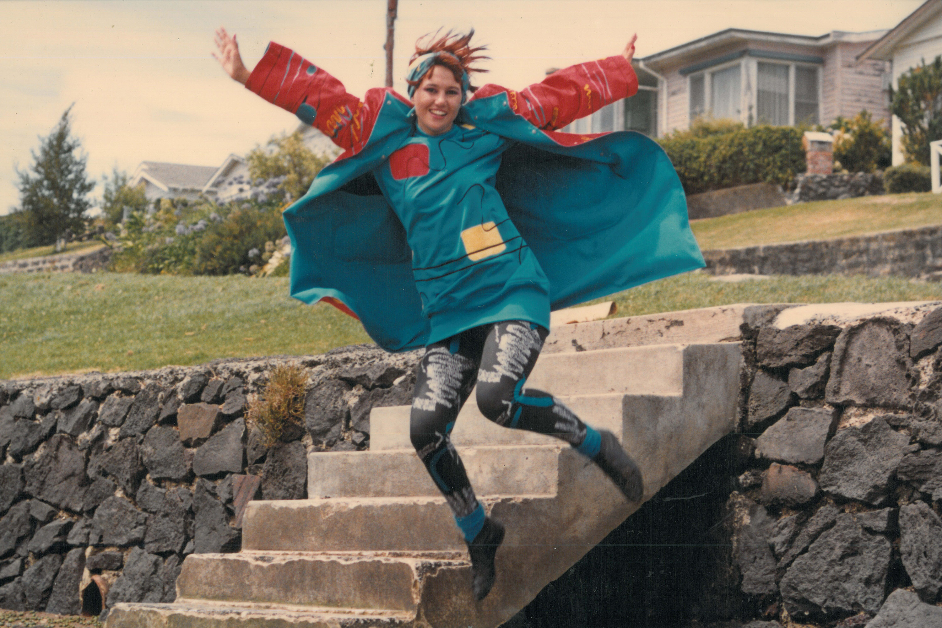 Doris de Pont began making this style of raincoat when she was living in Holland on her OE. The raincoat became a signature piece. "It had big fat shoulder pads and was made out of bold printed fabric on one side and plain on the other." Doris opened her first shop on her return to New Zealand in the mid-1980s. This reversible raincoat was her first entry into the Benson & Hedges Fashion Design Awards. Doris took this photo of her shop manager Pip Barrett on the beach at the end of Garnet Road in Westmere. Doris made about 50 coats in this unisex style and they are all different. A version in Mickey Mouse fabric is in the Te Papa collection.