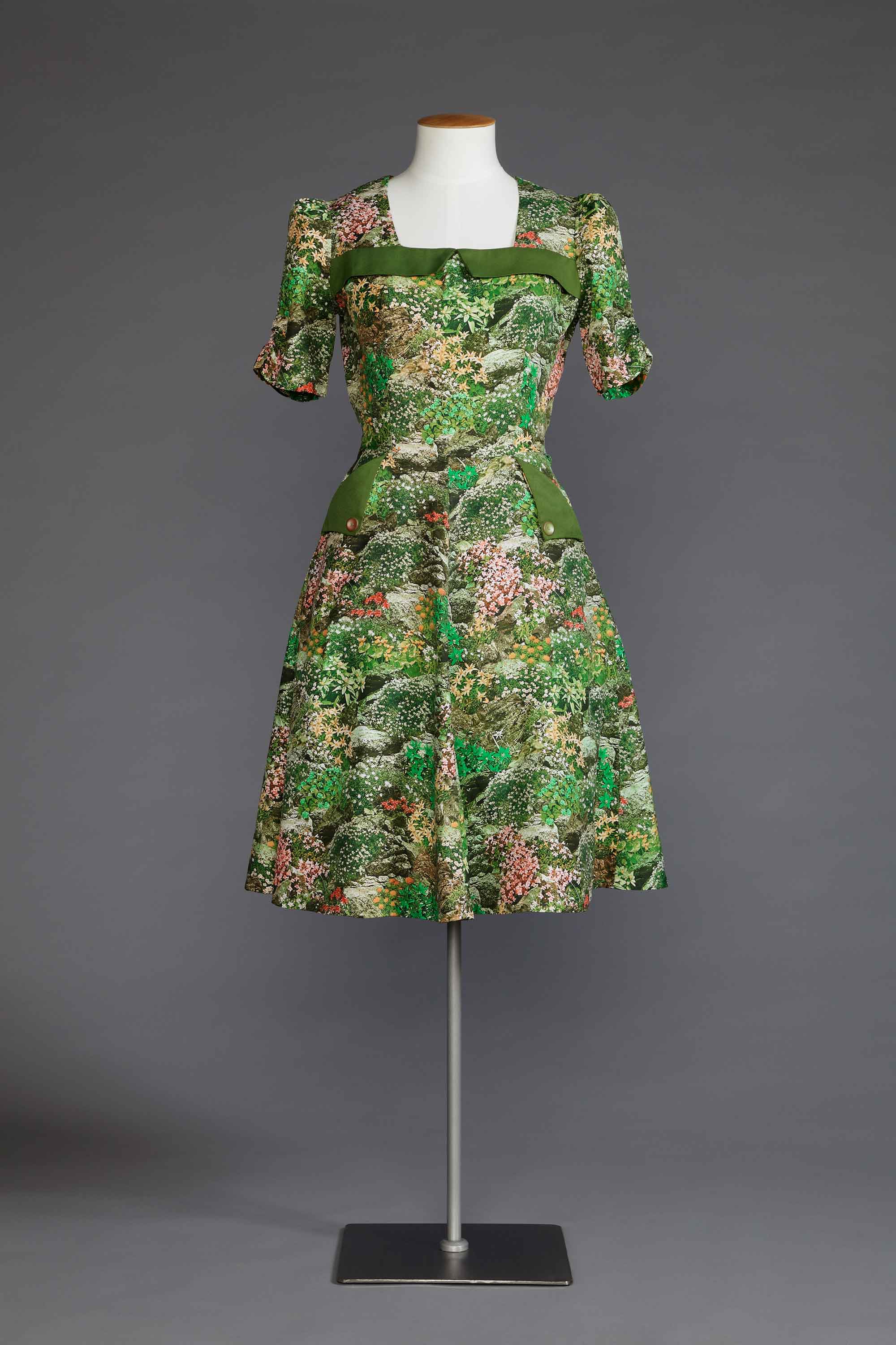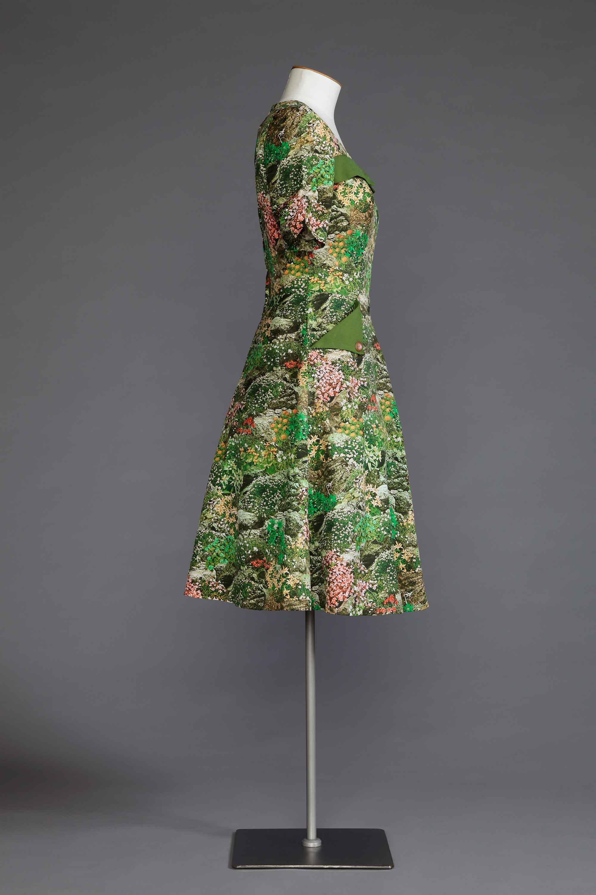 Trish Murphy learned to sew at primary school, taught by a group of women who would come to the village school to instruct during sewing afternoons. Trish made this green floral dress with pocket detailing because she "had to" sew something for these classes. While Trish’s mother sewed as did both her grandmothers, one of them as a professional dressmaker, it was at school that she gained her sewing skills. She continues her love of fashion and has taken great care and pride in her clothes, ensuring that many have survived. Her creative talents have been passed on to her own daughters, one of whom, Rebecca, won the Benson & Hedges Young Designer Award in 1994 and works freelance in the fashion industry in Australia. Read more about the history of home sewing in the New Zealand Fashion Museum publication Home Sewn.