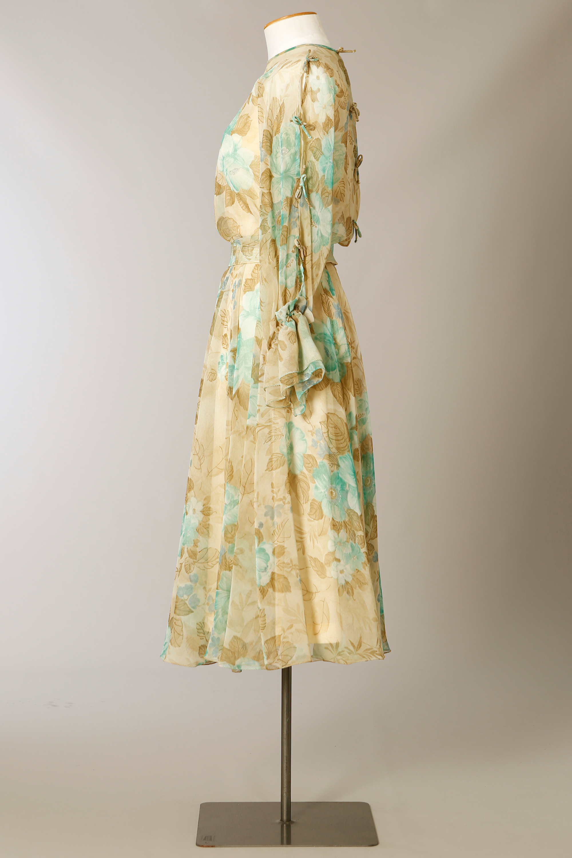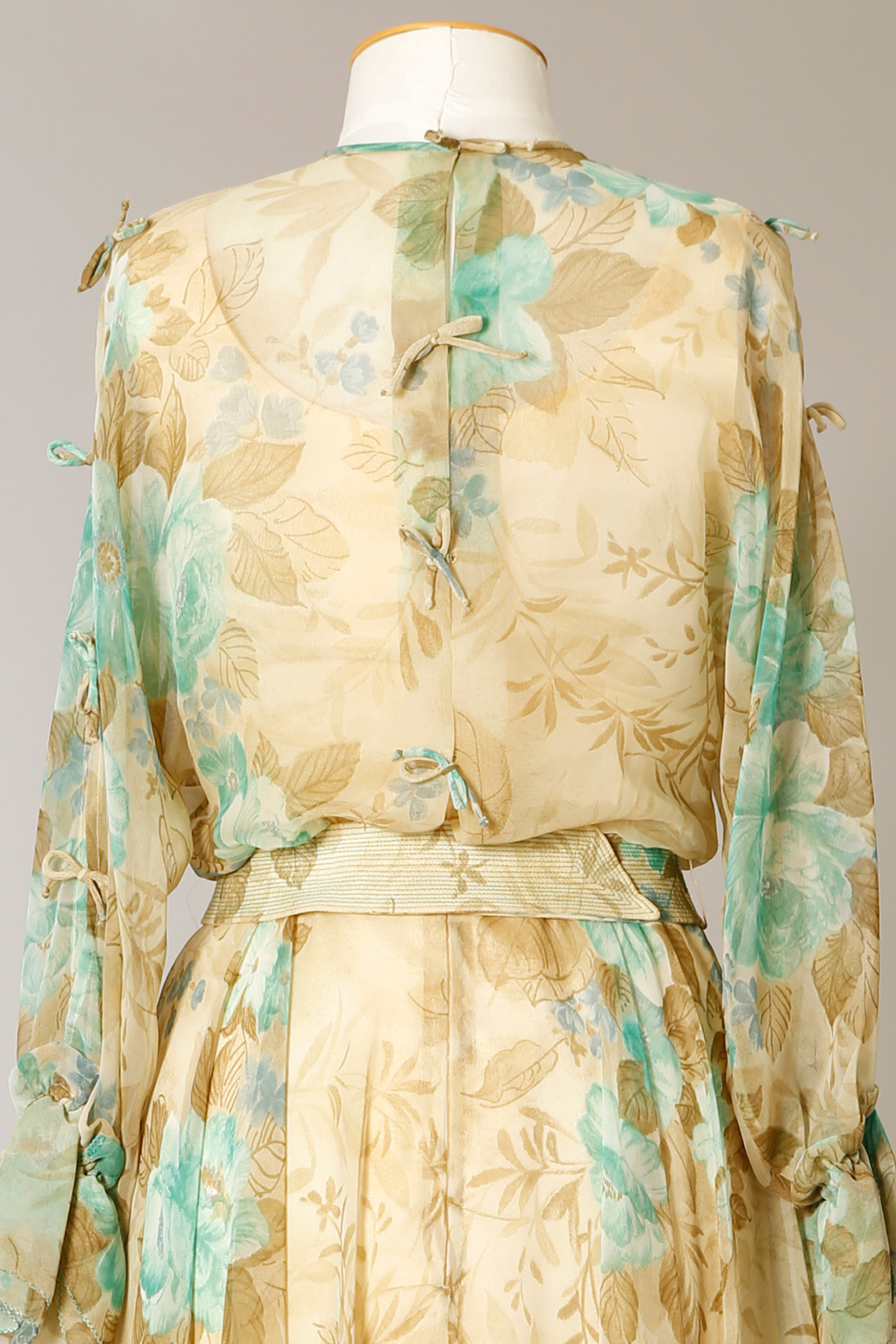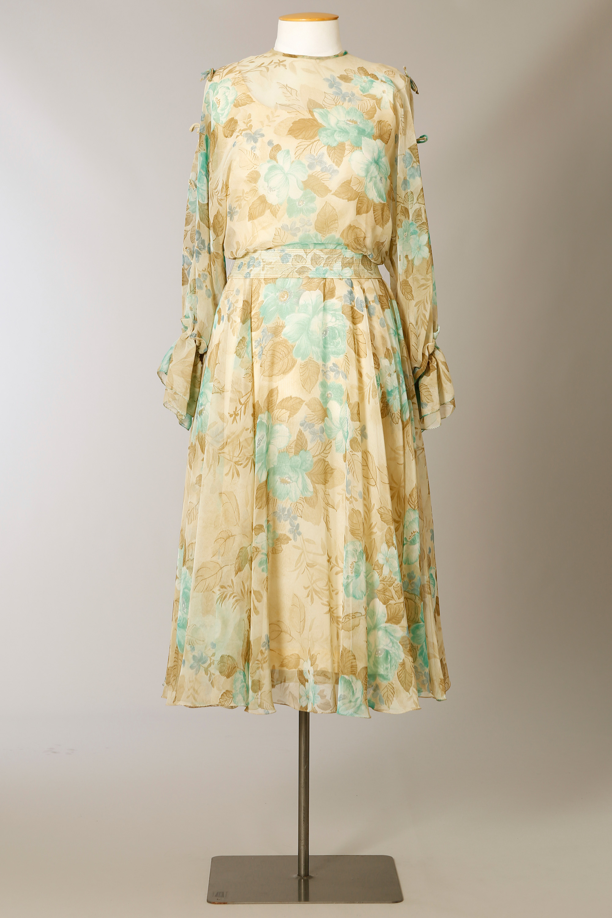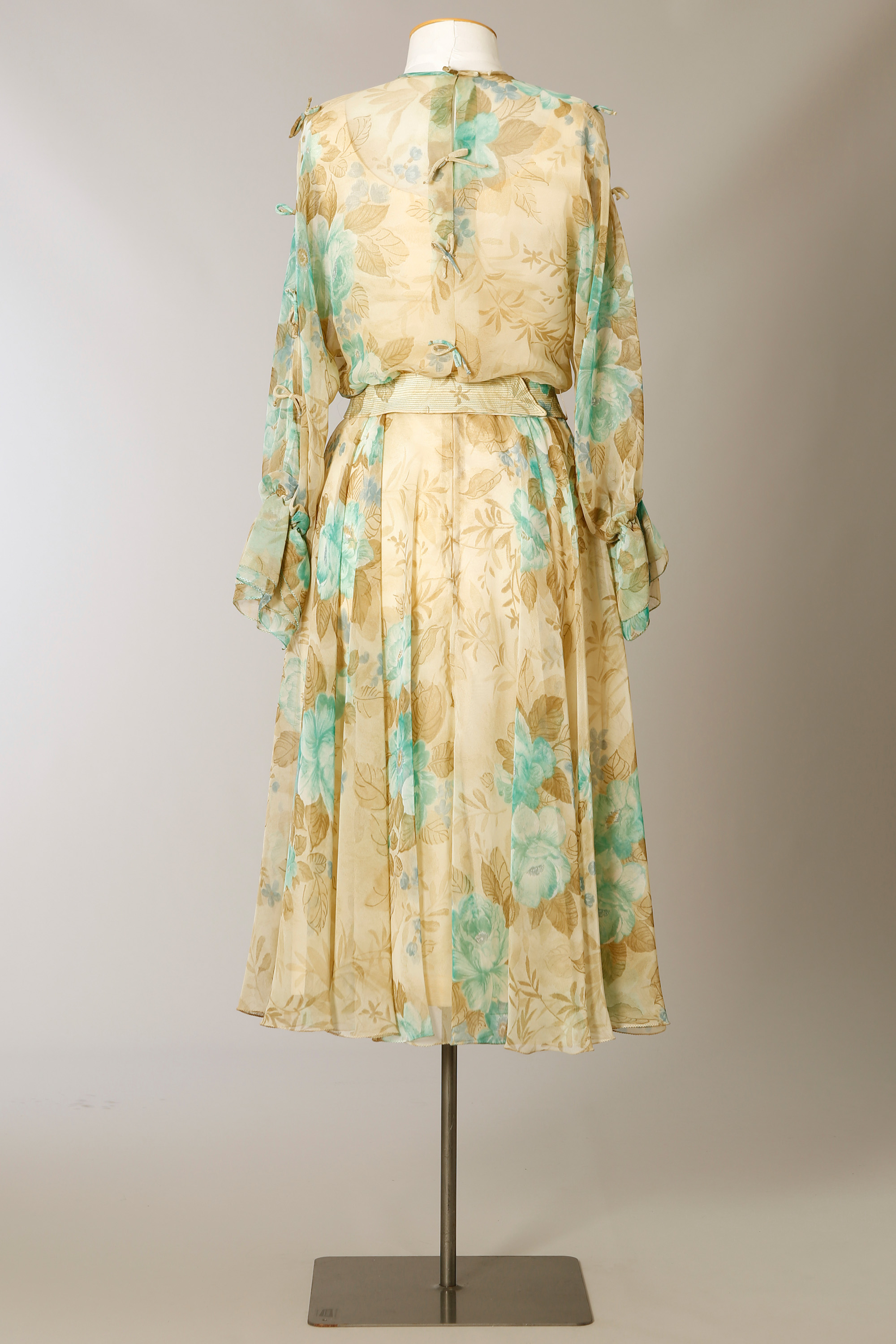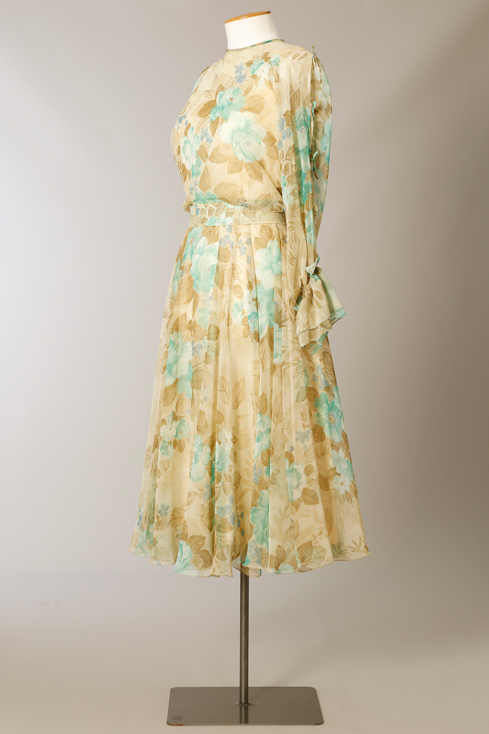 This Rosemarie Muller dress hails from the mid-late 1970s, indicated primarily by the printed polyester chiffon with a delicate but contrasting print of turquoise roses on a buttercream coloured ground and framed by autumnal leaves in shades of beige and light brown. The silhouette harks back slightly to an earlier time, with a full circular skirt and a fitted waist, however this also is a precursor to a silhouette that would become popular again in the early 1980s.