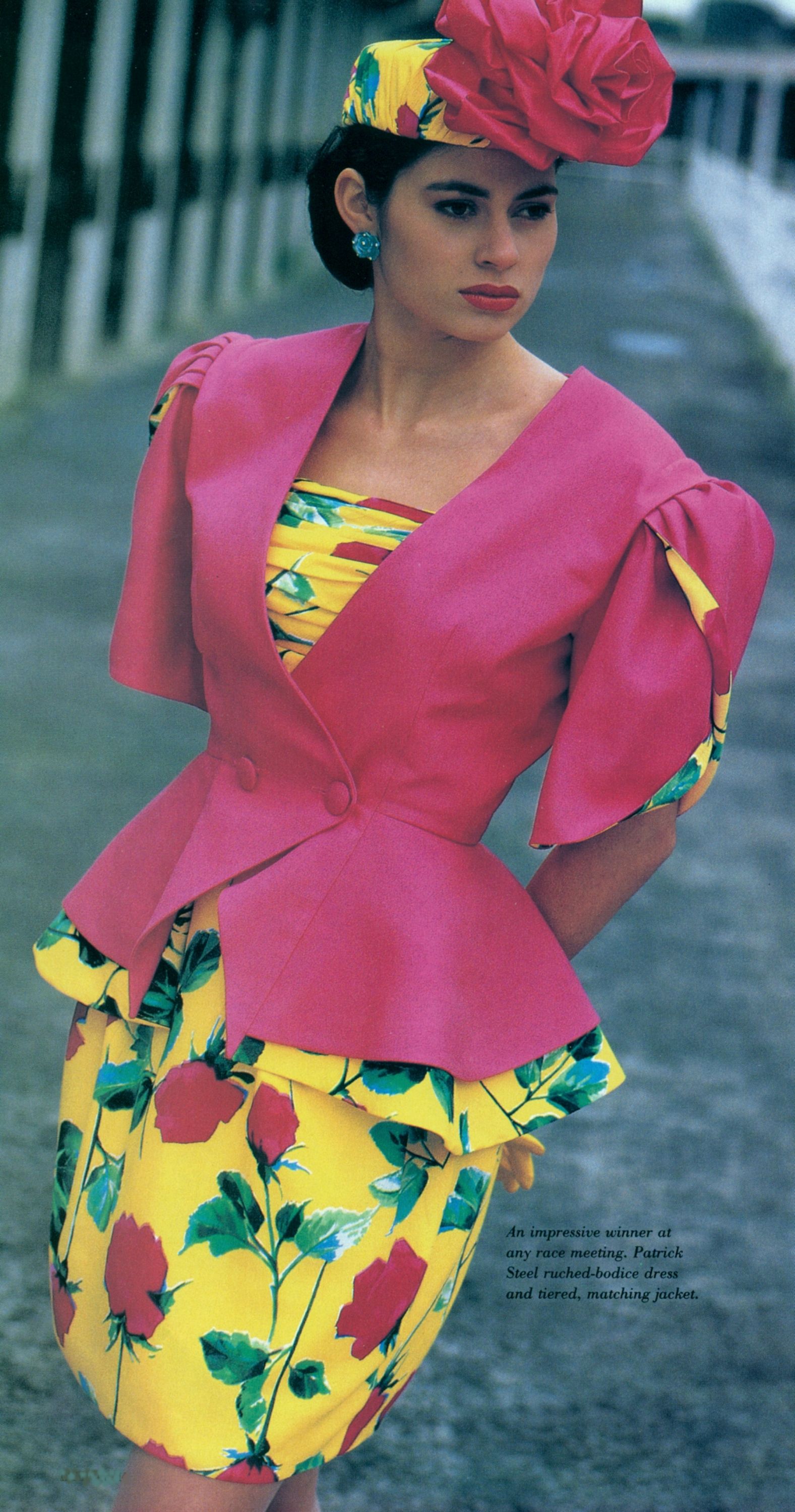 Auckland designer Patrick Steel interprets three of summer 1988's top trends with this outfit - roses, hot pink and extended shoulders.