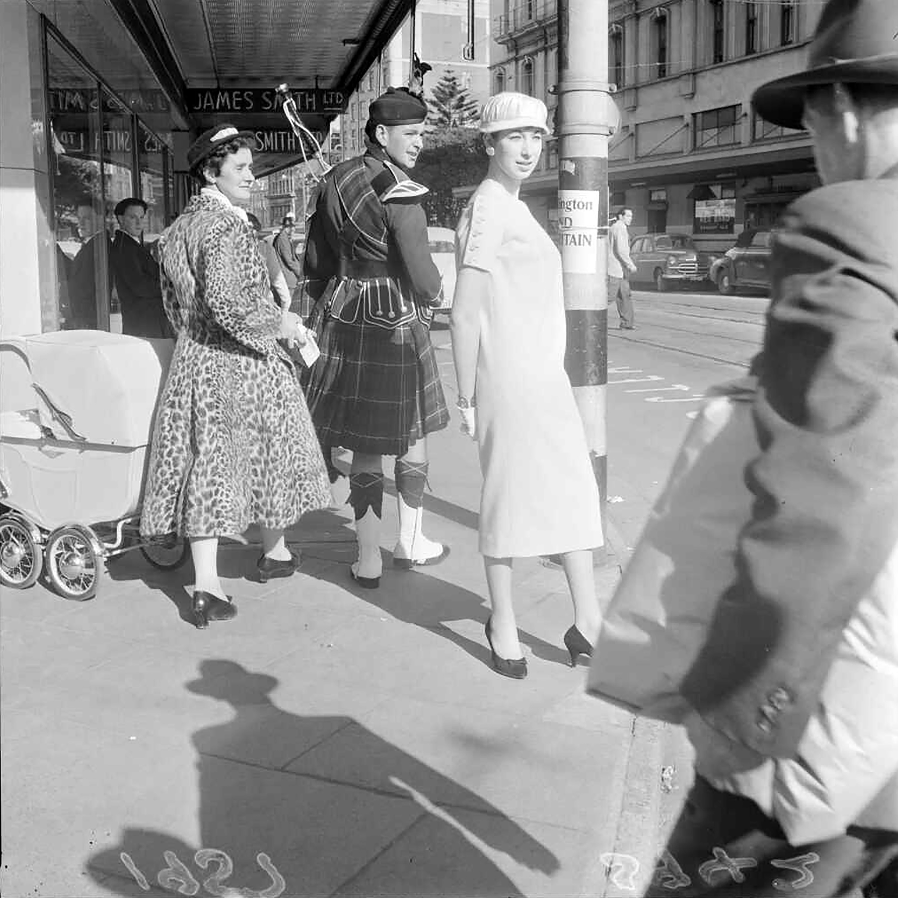 Josephine Brodie modelled the new 'sack look' to interested passers-by outside James Smith Ltd store, Manners Street, Wellington in 1957. The arrival of the chemise or sack dress fashion in New Zealand caused controversy - women had been wearing styles that defined the waist since the end of the 1920s flapper look. The sack dress was, however, immensely popular. In a New Zealand Herald article (18 August 1999) Douglas Lloyd-Jenkins wondered if the chemise appealed to New Zealand women's "suppressed sense of radical chic" or did it just suit their shape?