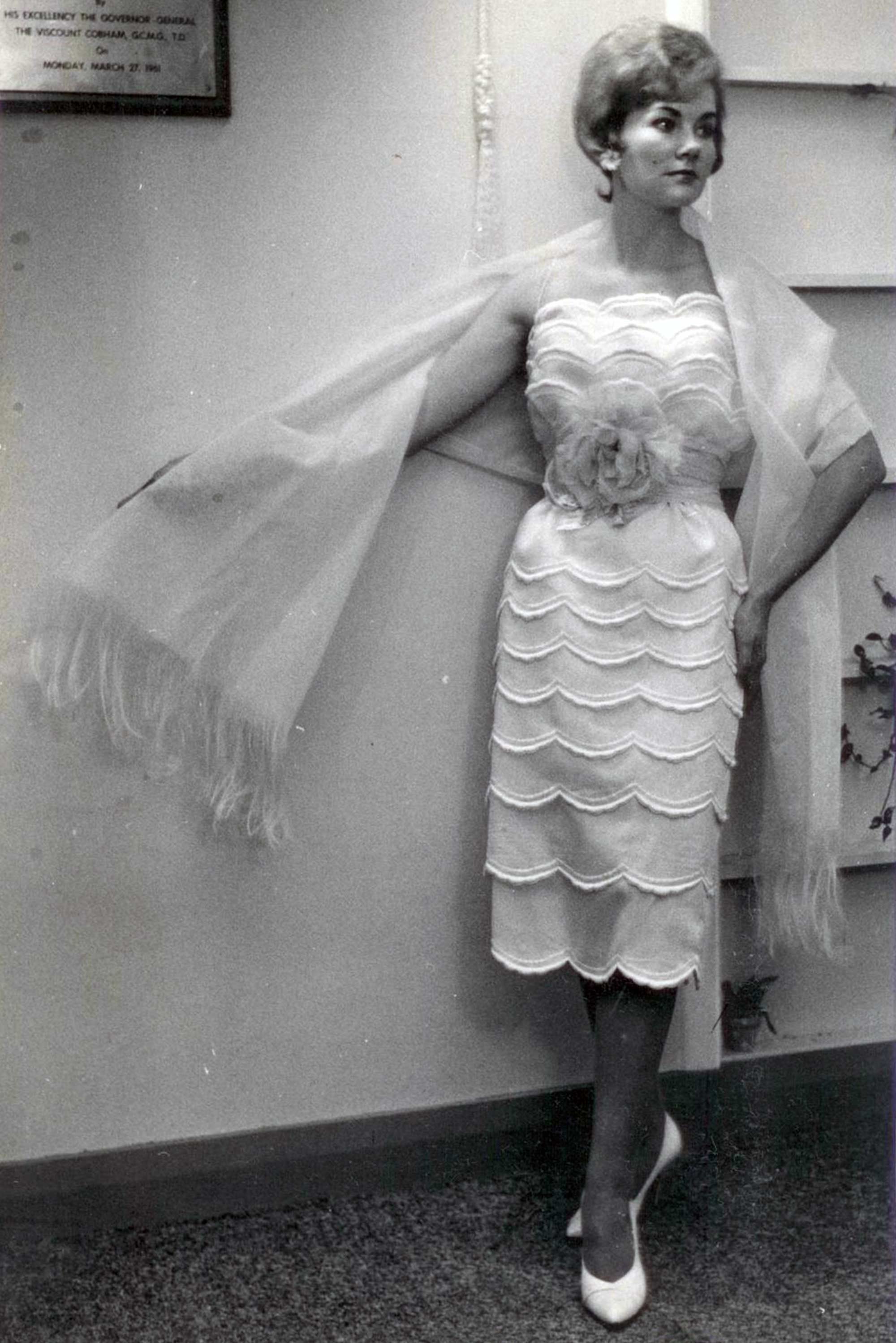 This dress was designed by Bruce Papas for Milne & Choyce department store. The dress is drawn together by a handmade rose that was slightly darker than the organza, "making the midriff look very small".