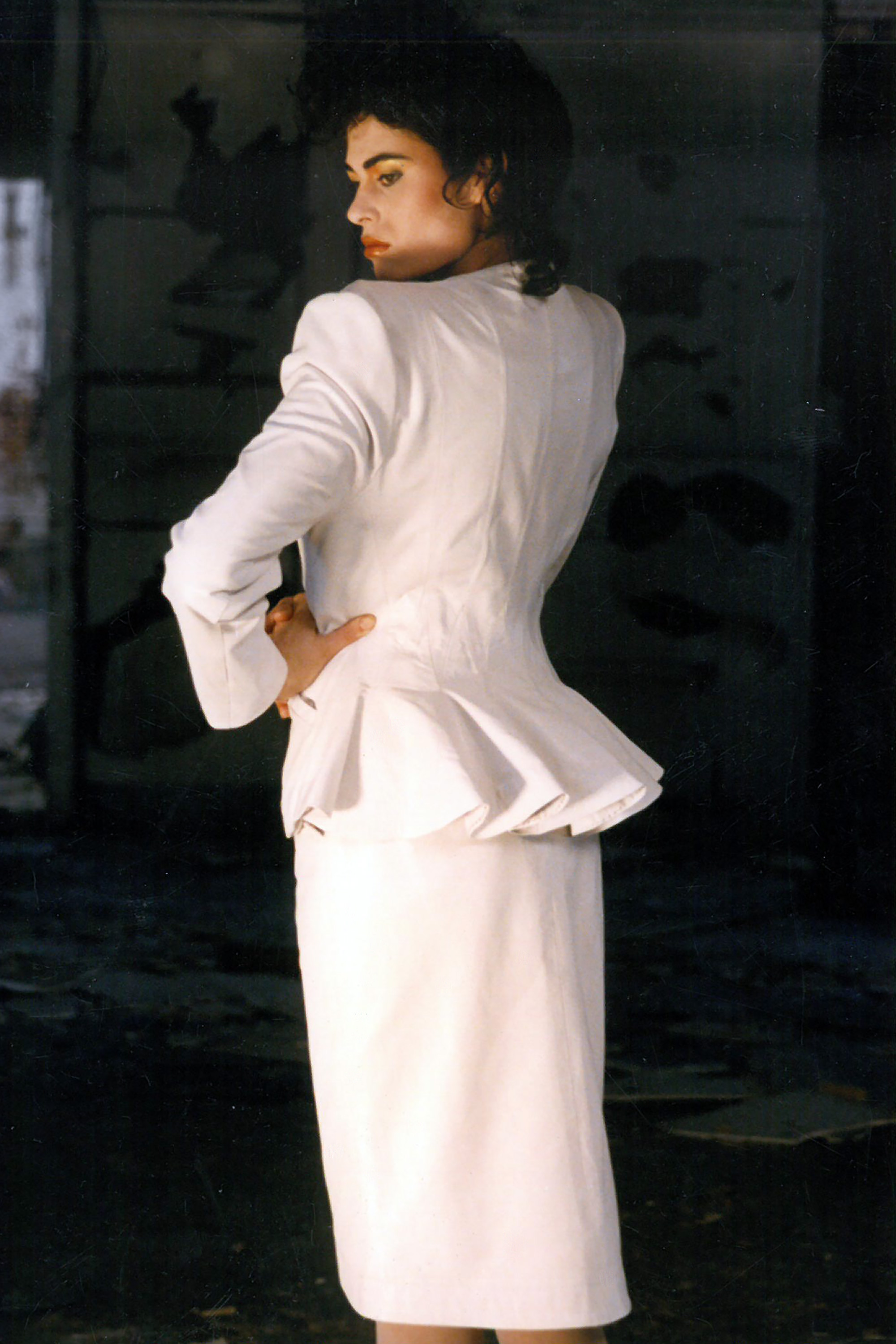 By the 1980s, when this leather suit was designed, Rosaria Hall was wholesaling her designs across New Zealand as well as selling from her own boutiques in Christchurch and Wellington. Her workroom was located in Christchurch. This garment is modelled by Rosanna Raymond.