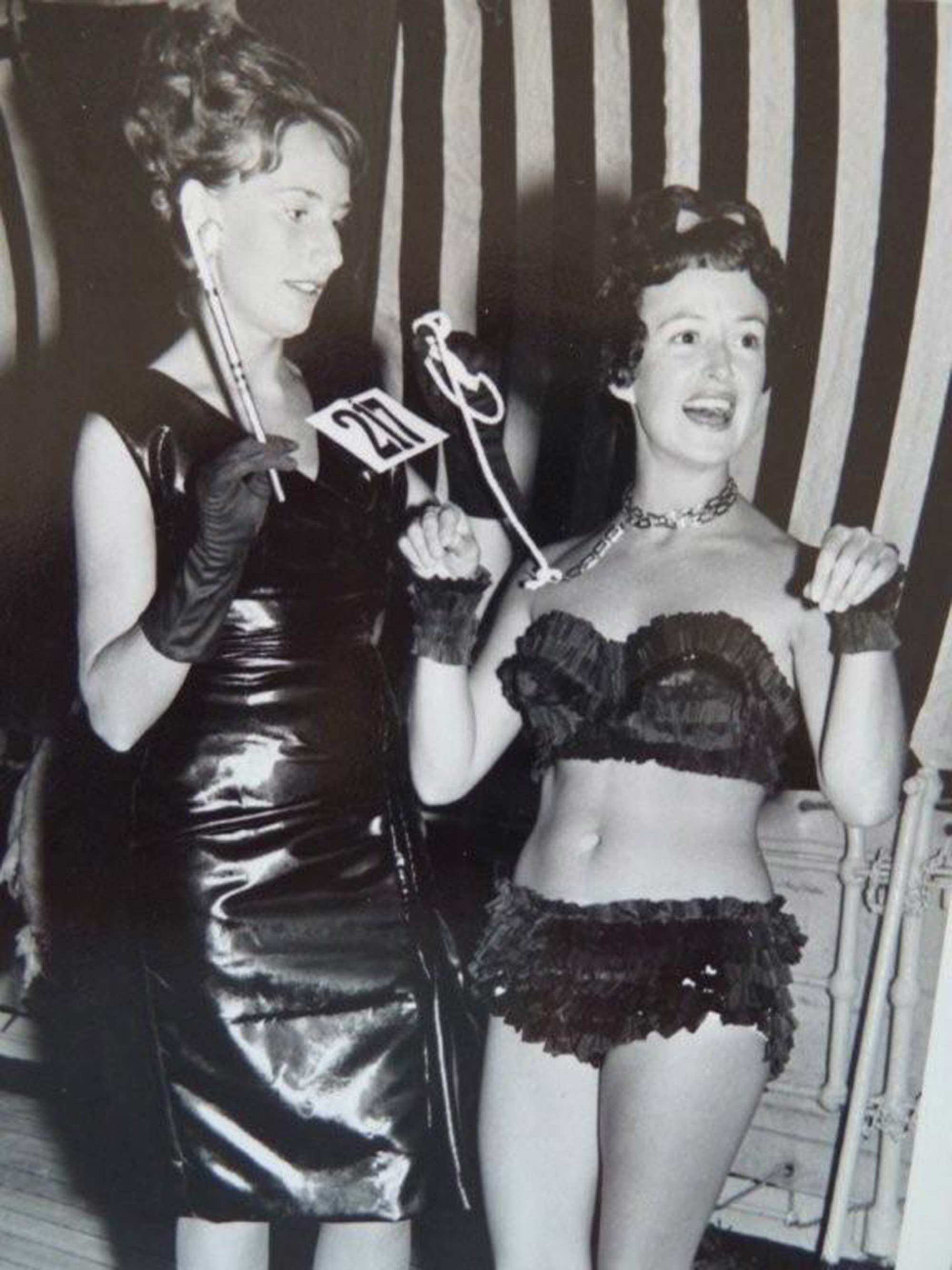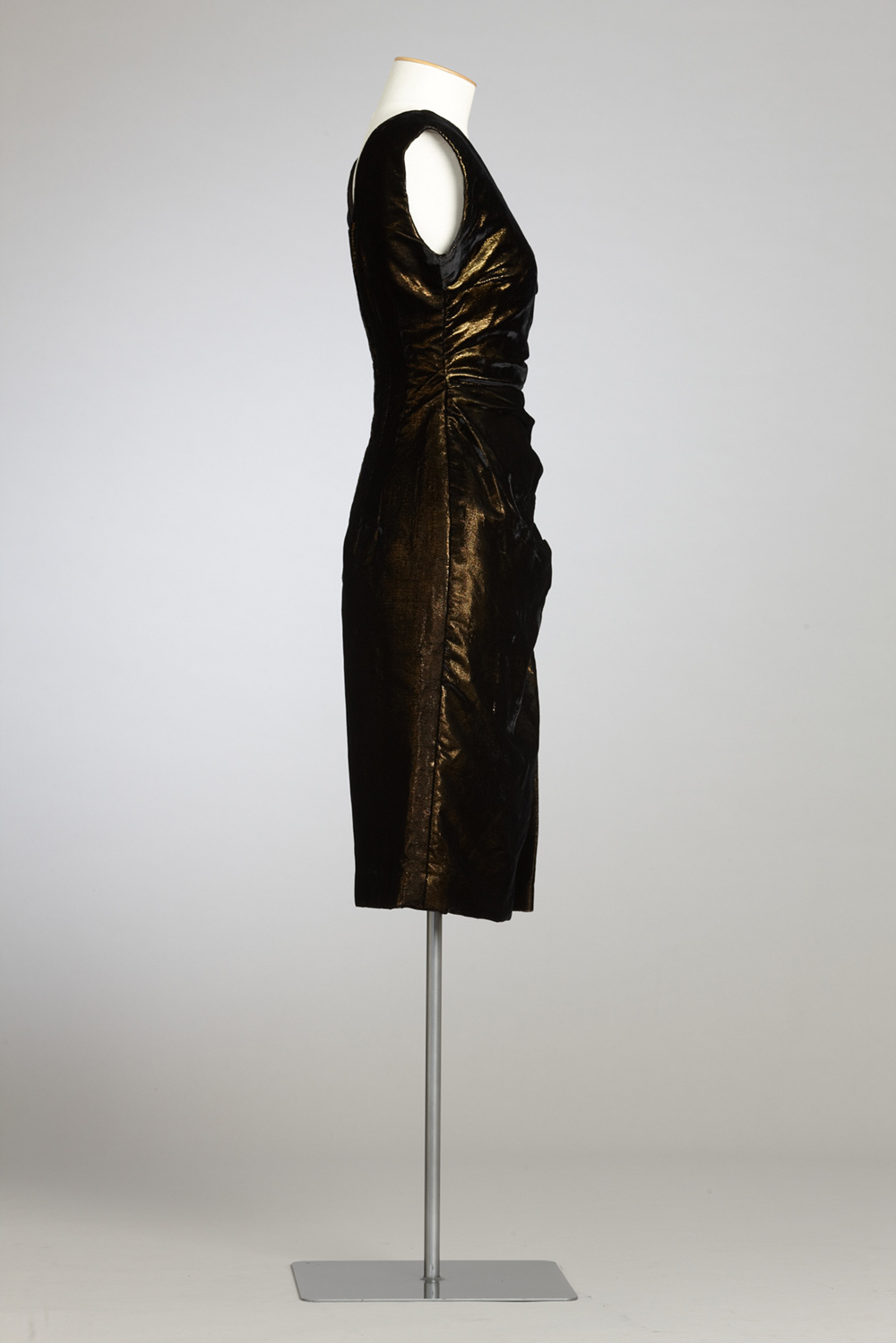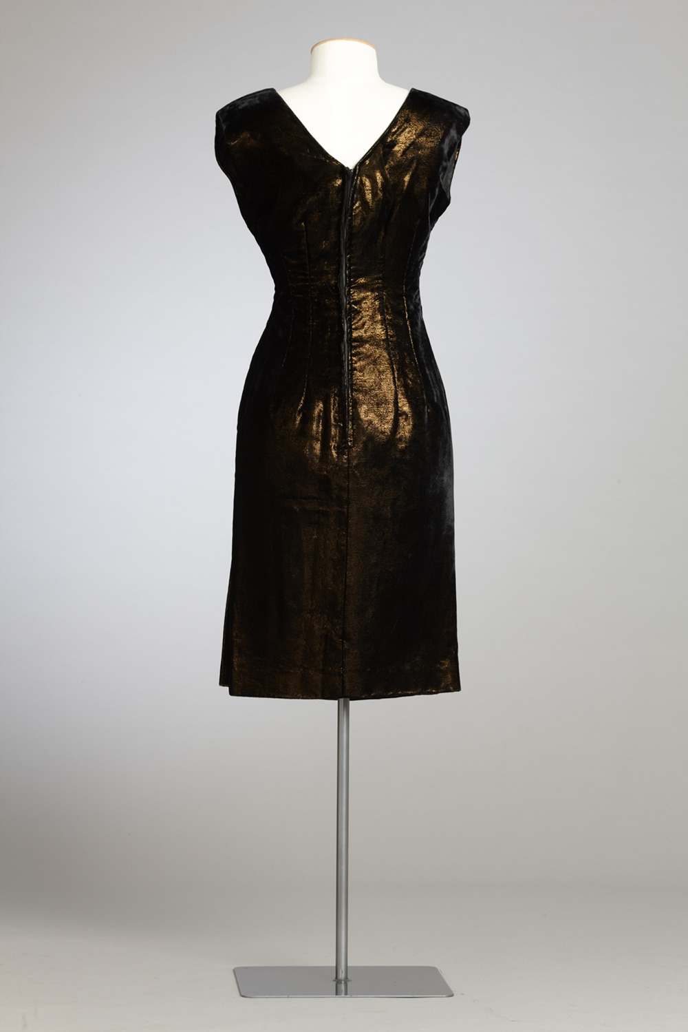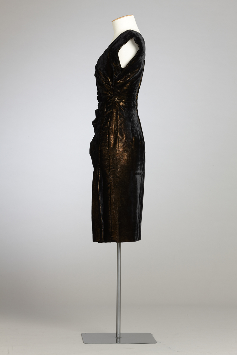 This dress was made for 21-year-old Jacquie Swift in late 1961 by Mrs White, a dressmaker from Ponsonby, who would later make Jacquie’s wedding dress. The dress was copied from a picture specially for Jacquie to take to the UK when she went on her OE. Jacquie left New Zealand in January 1962 on the steamship Southern Cross. The dress was admired at the many social events on board, particularly a fancy dress evening. Clothed in her evening gown and gloves, and wearing jewellery loaned to her by crew members, she teamed up with her friend Patricia (in frilly two-piece swimsuit and wearing a leash) to portray a French madame and her scantily clad poodle. They won second prize, a basket of rich red roses. Jacquie describes their reaction to this bounty. "Great puzzlement in the middle of the Indian Ocean. Where did they come from? Our olfactory senses kicked in. They were, in fact, carved from beetroot!" Read more about wearing the colour black in the New Zealand Fashion Museum publication Black: The history of black in fashion, society and culture in New Zealand.