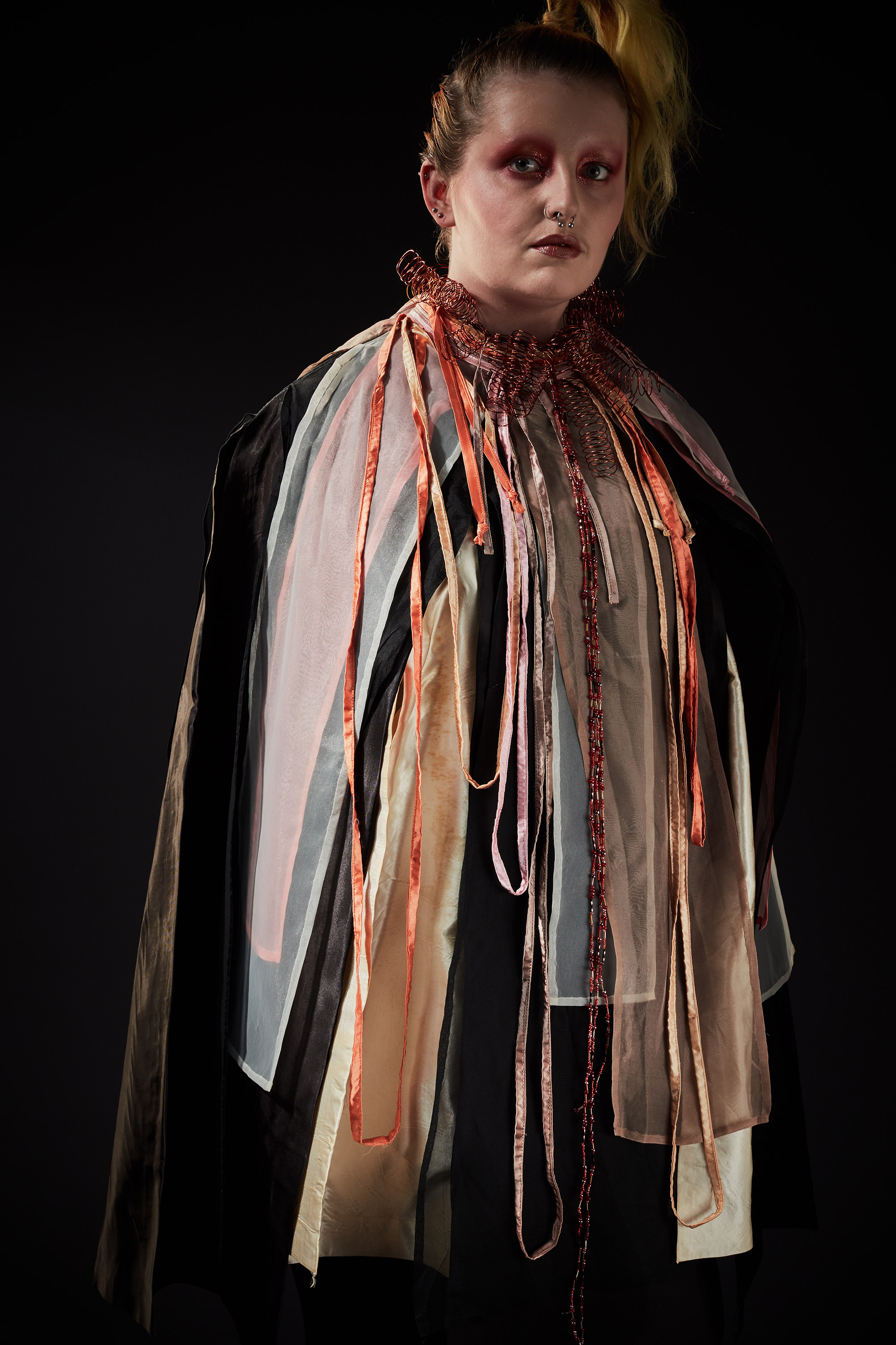 Helen Schamroth painstakingly made this cloak for a project more than 30 years ago. "The context eludes me but the cloak has continued to hang in my wardrobe beside my jeans, accusing me of having been extravagant with the materials bought at Smith & Caughey's at a time in my life when this was irrational and stupid. Such is the drive to make art and the seductive power of beautiful materials." In preparation for the Intellectual Fashion Show 2016 exhibition, Helen embellished the cloak with twisted wire and beads found in her studio to make it even more 'stupidly magnificent'. This is Helen's interpretation of June Black's 'Costume to prefer the stupidly magnificent rather than the sensible grind'.