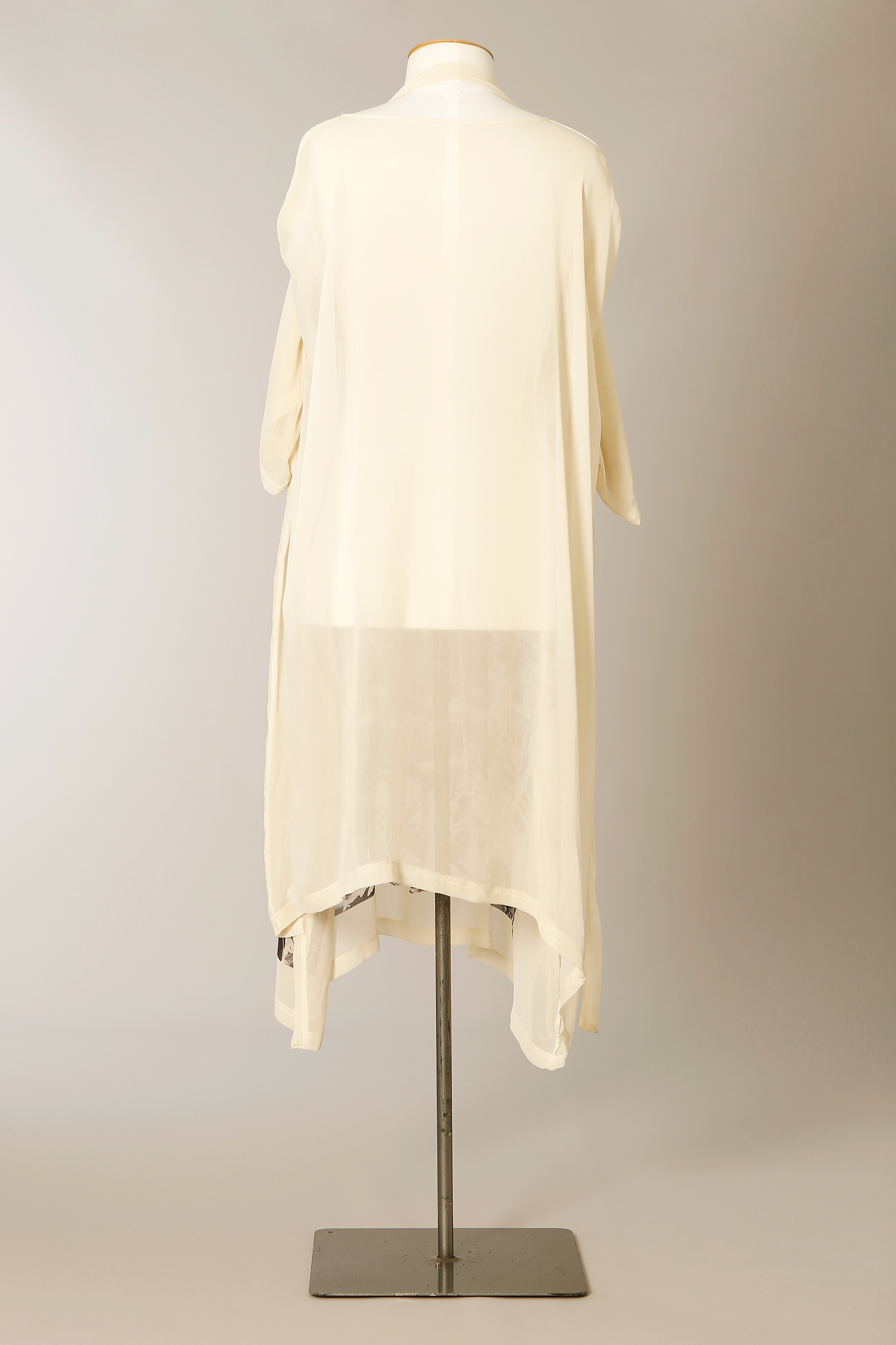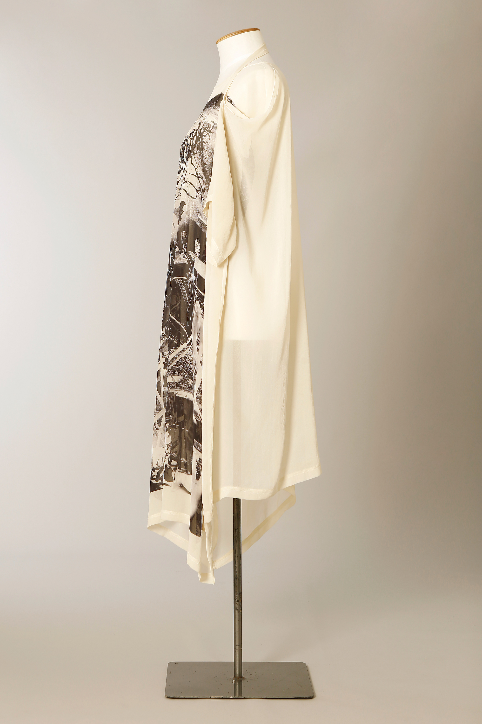 Graphic is a digital print of an original artwork by Andrew McLeod. Dress is a simple t shape with long self fabric tapes and d rings on the internal and external shoulder which can be used to modify the shape and drape.