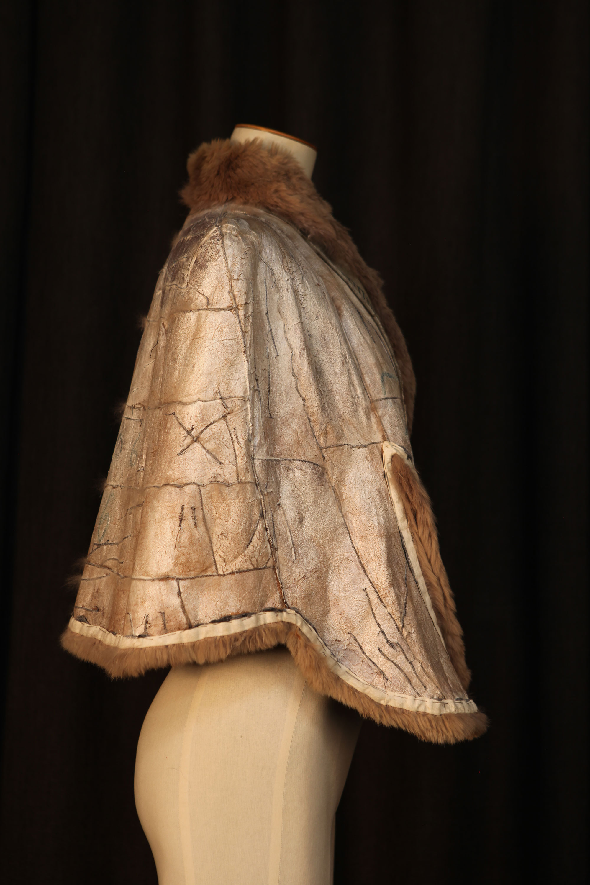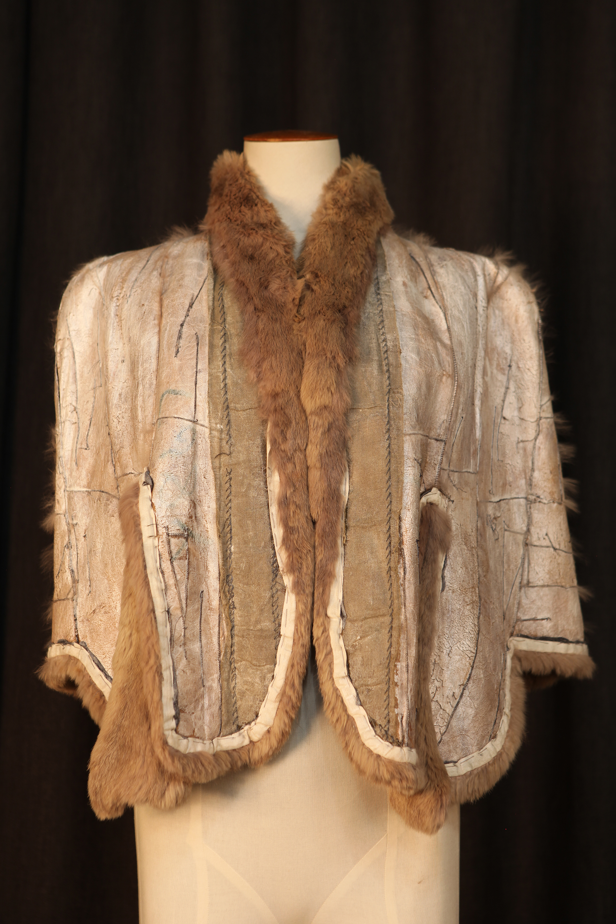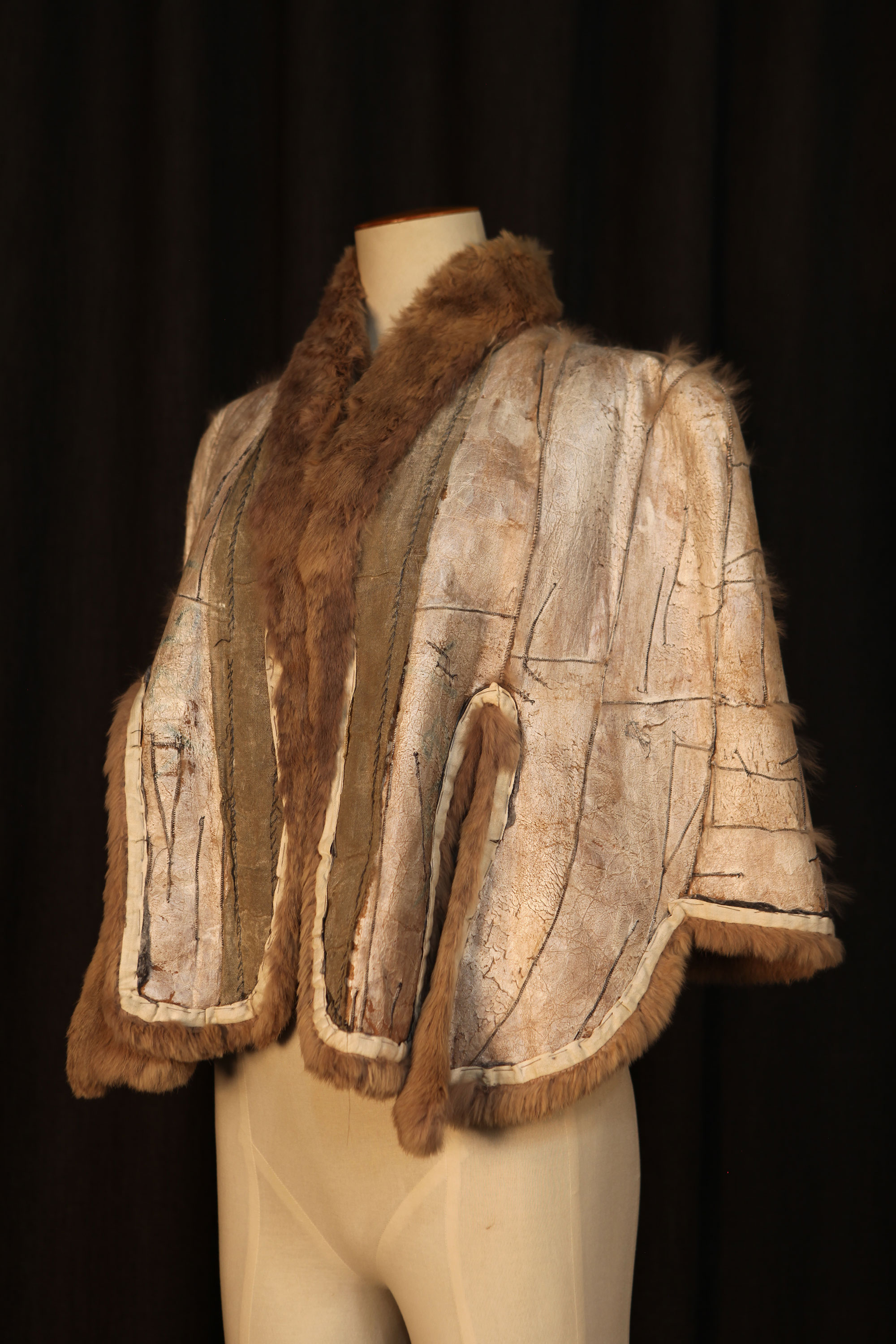 Lela Jacobs created a series of reversed fur jackets in 2011. She used vintage fur garments which she turned inside out and removed parts, sometimes adding other parts, depending on the already existent markings and shape and age. This cape was finished with a light silver paint.