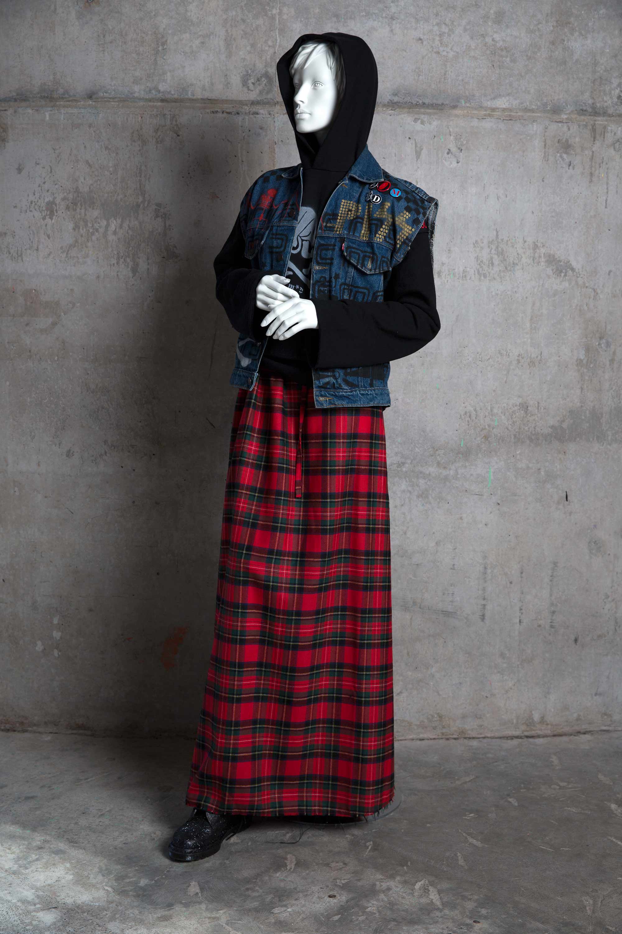 Sleeveless denim jacket & tartan skirt