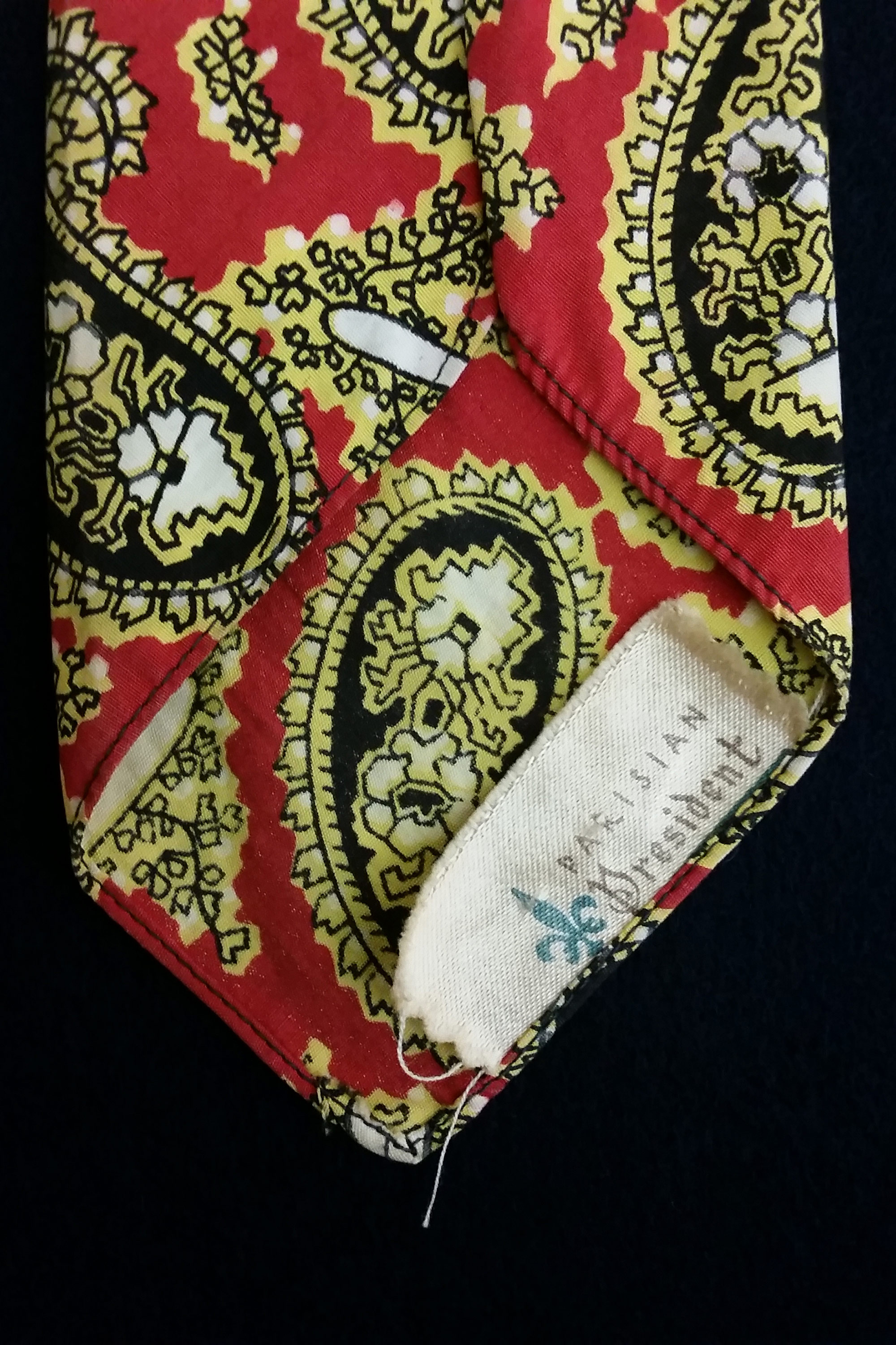 This tie is screenprinted with a paisley design. It’s unlined and the edging on the tip is hemmed.
