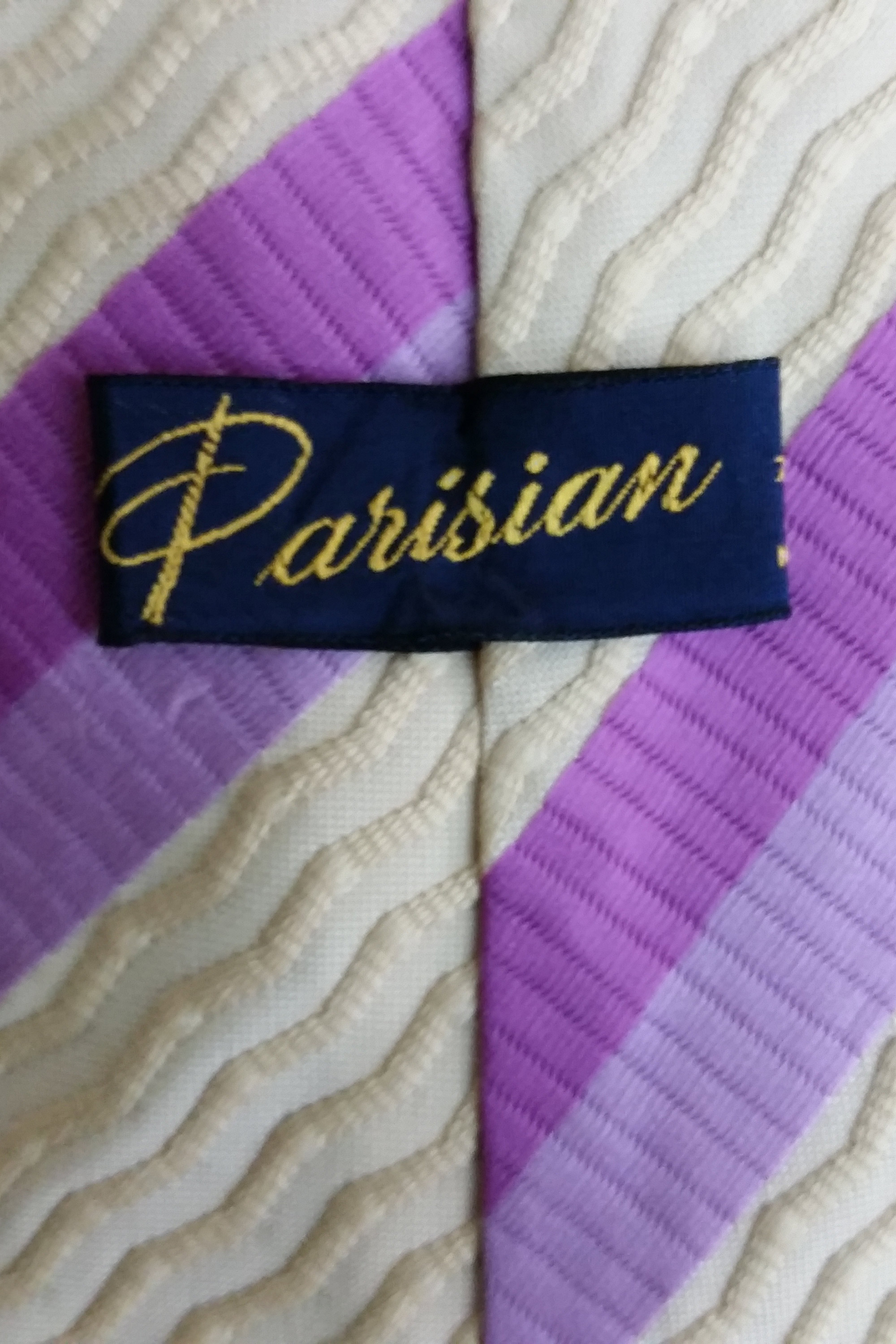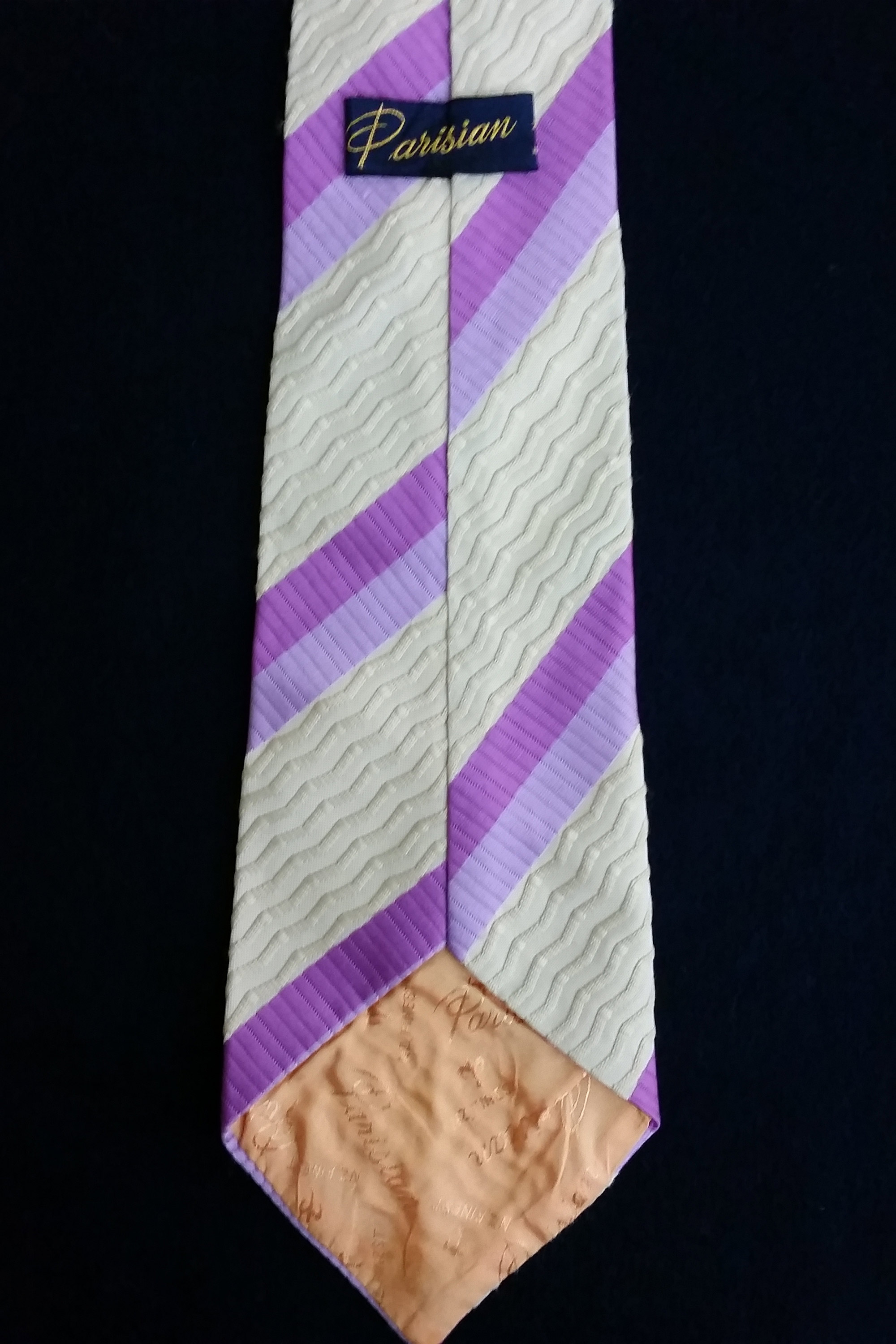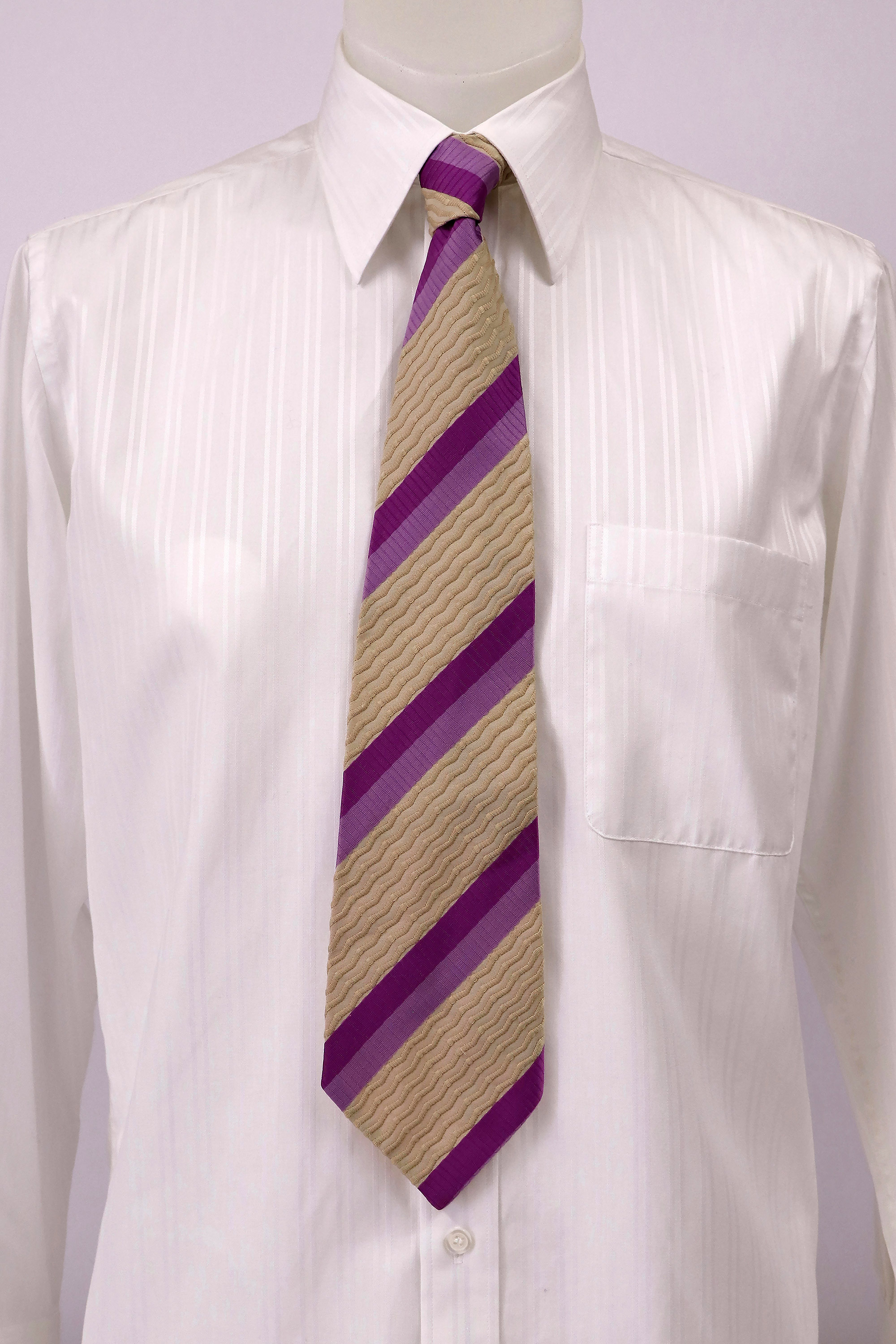 Ties grew wider and wilder as the 1970s progressed. This tie by Parisian may be a traditional striped tie but the colour palette of purple and tan makes it anything but traditional.